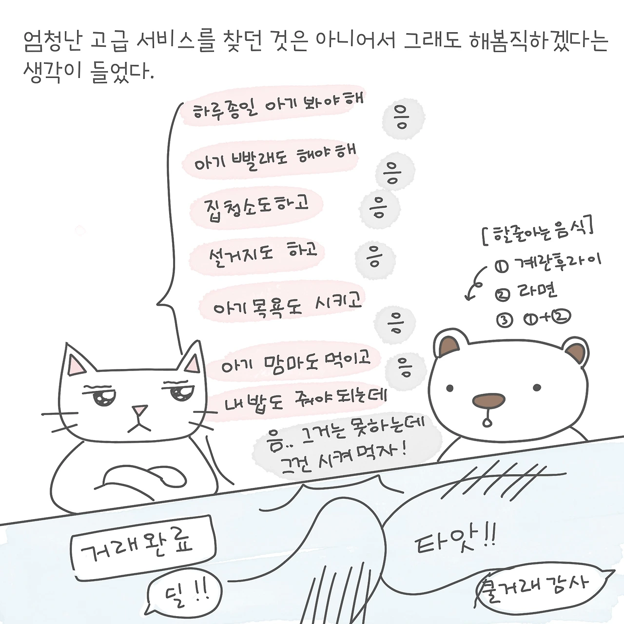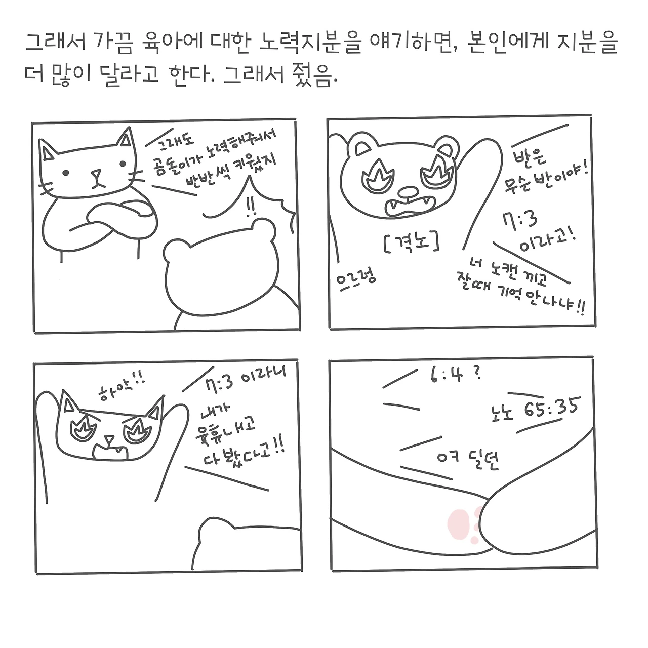 나는 출산 후 다행히 수술부위 말고는 다른 데가 많이 아픈 곳은 없었는데, 그래도 손목 같은 경우는 아기를 몇 번 자주 안으니 좀 무리가 오는 느낌이었다. 그래도 남편 덕에 주말 포함 열흘? 정도는 손목을 많이는 안 써서 다행이었다. 요즘도 육아 지분에 대해 서로 얘기를 종종 하는데 육아 지분은.. 6:4 (남편이 6)만 해도 될 것 같긴 한데 그냥 65:35로 좀 더 줬다! (밤 당번이 아무래도 힘들기 때문에 가중치를 주었음)ㅎㅎㅎ