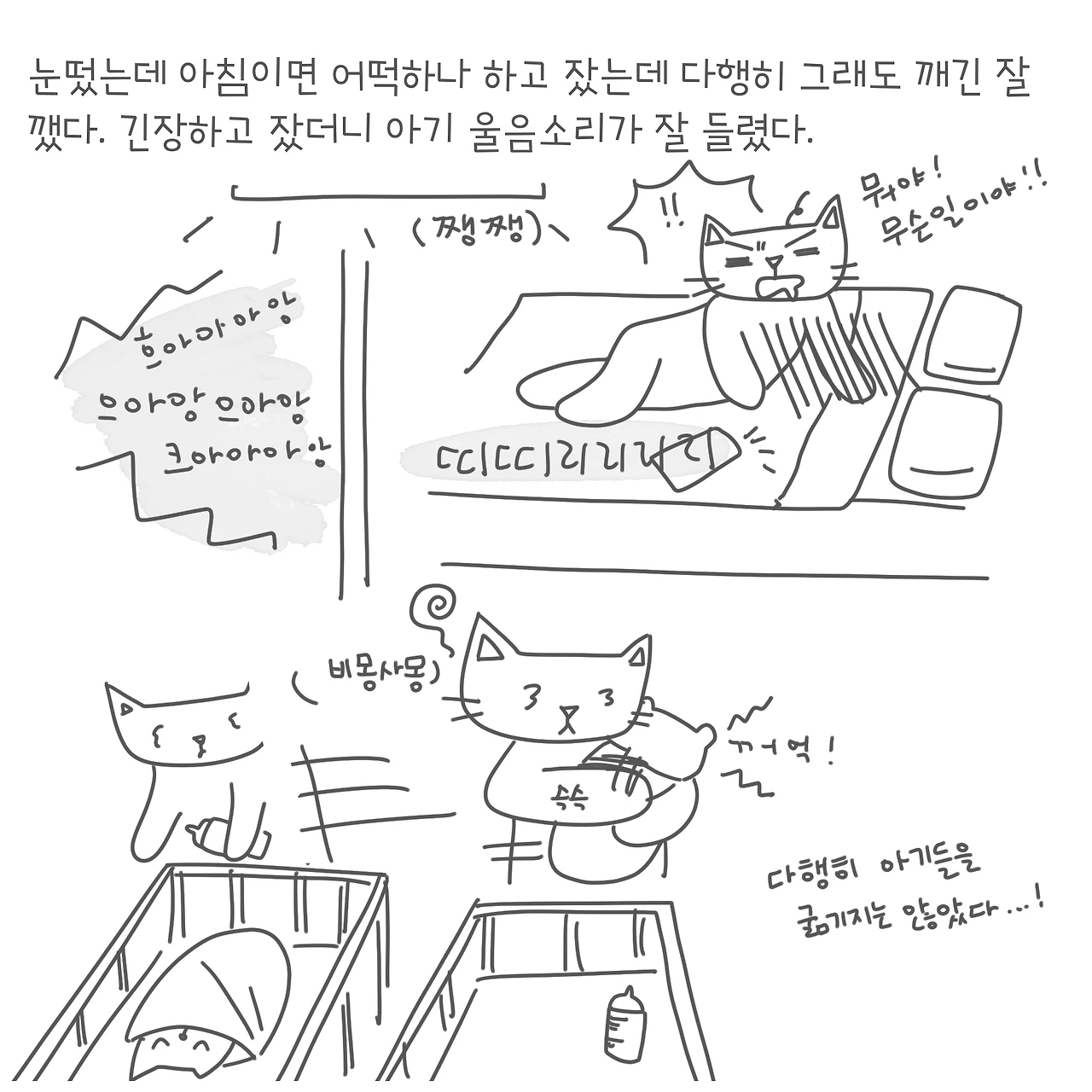밤 당번인 곰돌 씨만 철석같이 믿고 마음 편하게 자느라고, 아기 울음소리도 그냥 넘겨듣고 잘 자던 나였는데. 밤 당번이 없다고 생각하니 내 아기들 굶길 수 없다는 생각에 악착같이 잘 일어나게 되었다! 그래도 혹시나 피곤해서 잠이 푹 들어서 못 일어날까 봐 너무 걱정이 되어서 별 방법을 다 썼다. (사실 배고파서 악쓰며 우는 아기들 울음소리를 듣고 못 깰 수는 없을 것이라고 생각하지만) 목적은 정신줄 놓고 자지 않고 대충 쪽잠을 자서, 유사시에 빨리빨리 대처할 수 있도록 하는 것이었다. 그래서 형광등도 켜고 자고, 이불도 안 덮고 자고, 수유 텀에 대략 맞춰서 알람도 엄청 많이 걸어놓고 잤다.