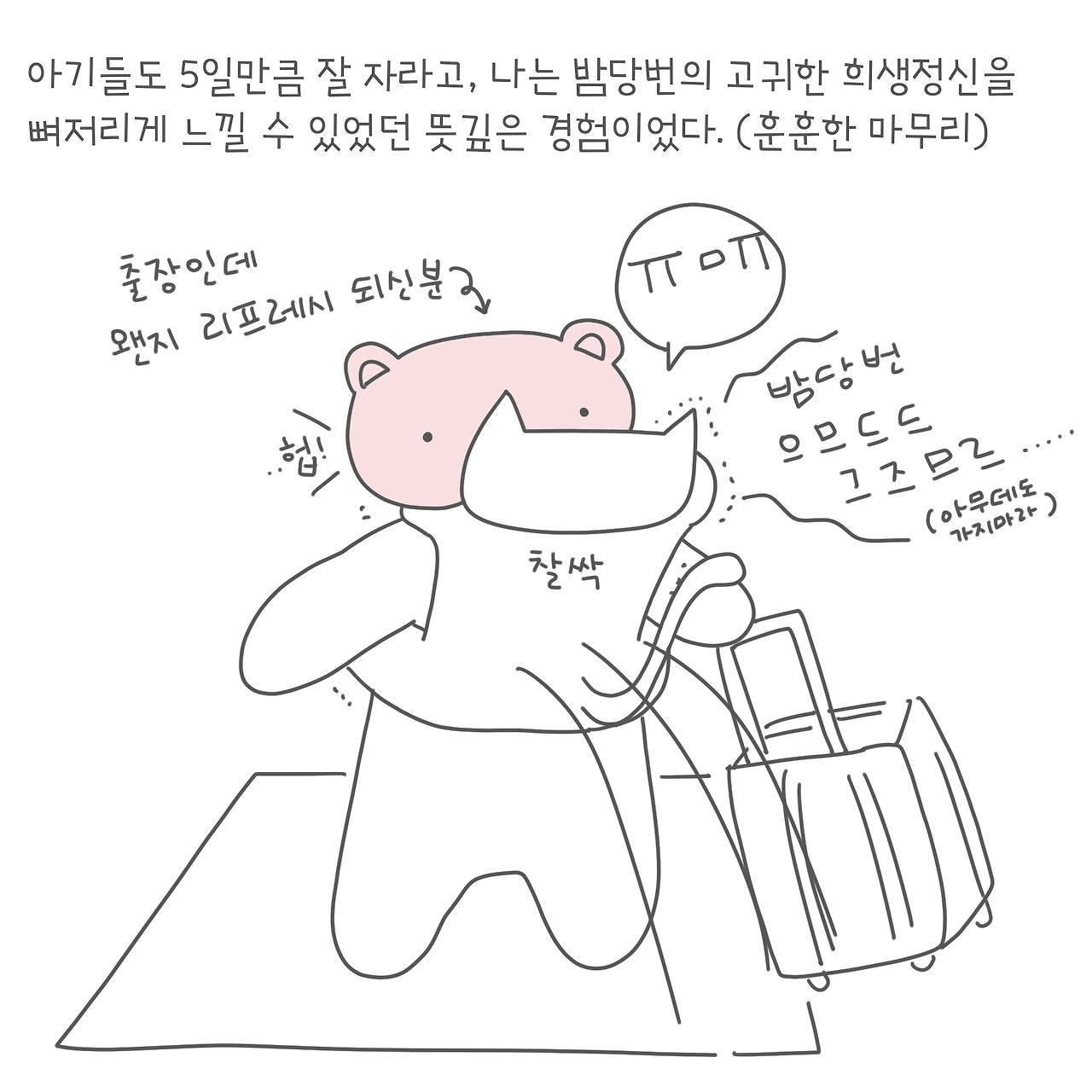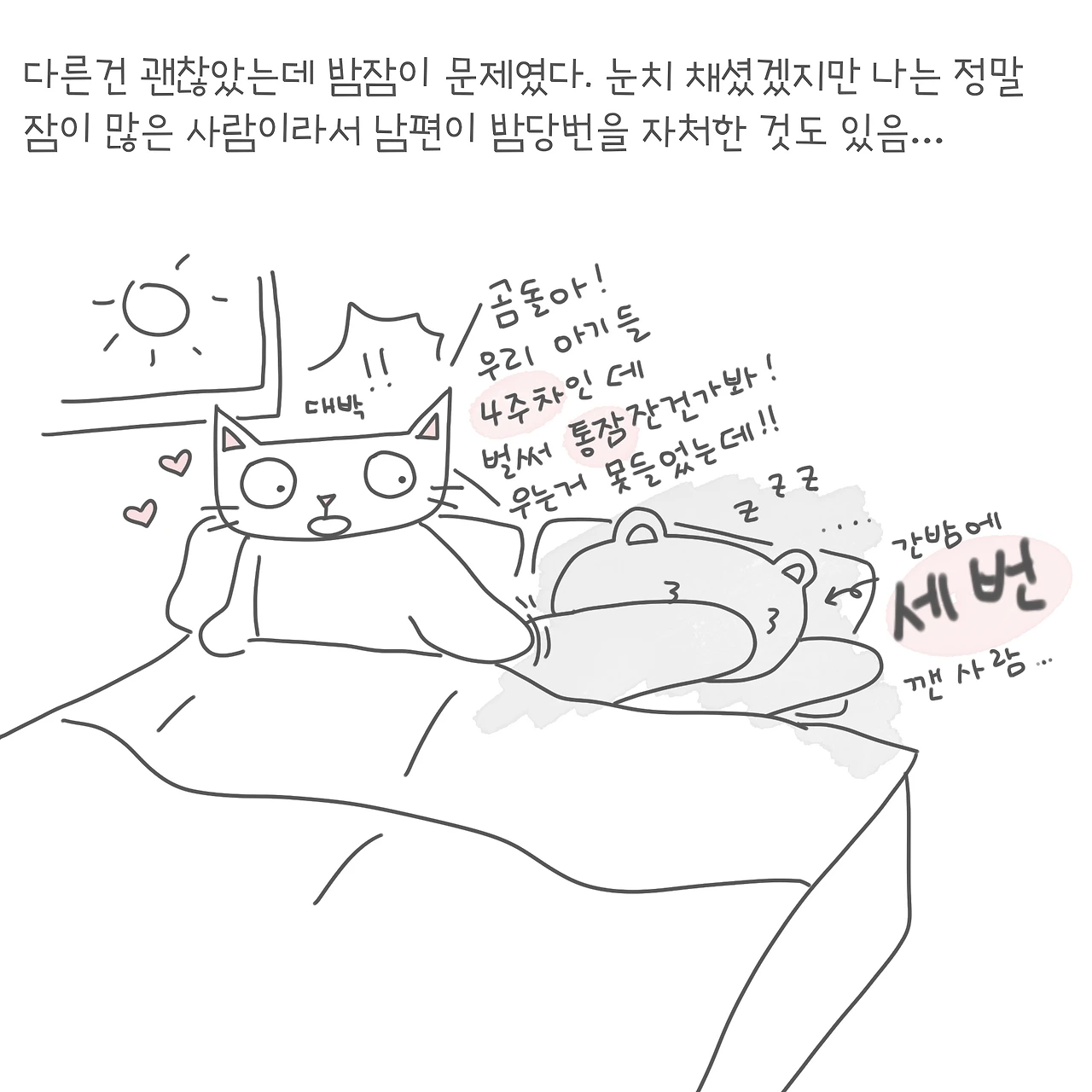 밤에 못 자는 것이 그렇게 괴로운 일이라는 것을 잊고 있었다! 남편이 출장에서 돌아왔을 때 정말 너무너무 기뻤다! 정말 밤 당번의 힘듦에는 가중치를 줘야 했다. 남편은 사실 아기들이 통잠 잘 때까지 거의 밤에 잘 챙겨줬고 (가끔 정말 정말 힘들어서 못 일어날 때는(?) 나한테 부탁해서 내가 깨서 챙기기도 했다) 나는 밤에는 그래도 남편에게 맡기고 자고 낮에는 파이팅하며 아기들과 함께 잘 지냈다.