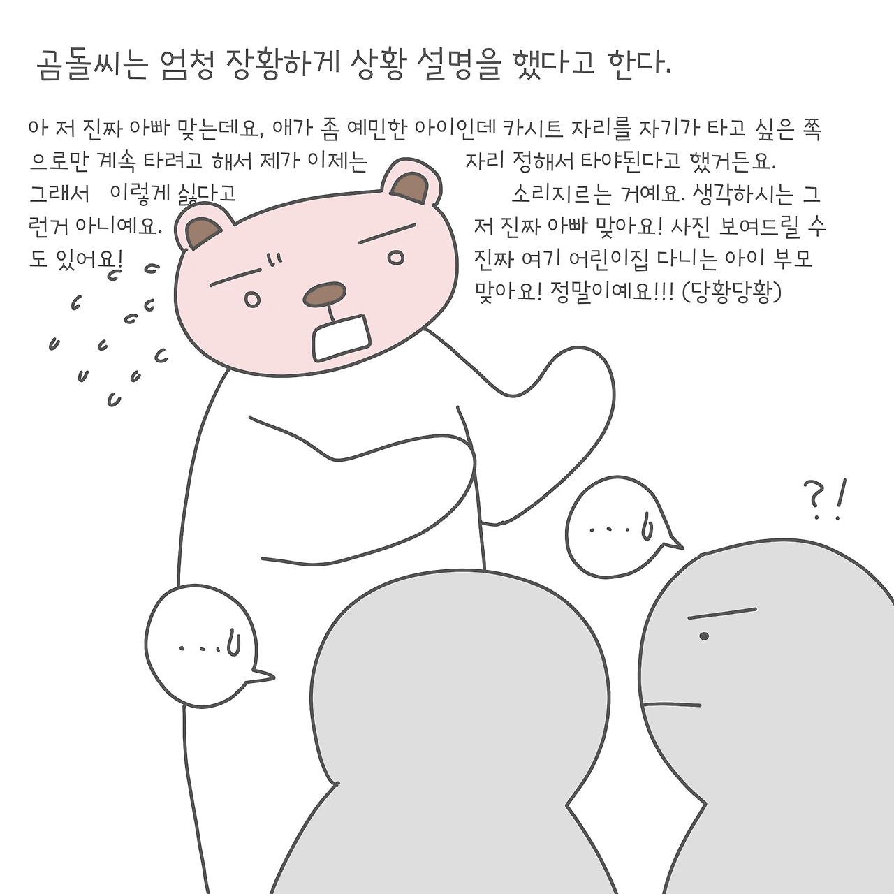 이 날도, 오른쪽 카시트에 타는 게 그렇게 싫었을까? 원래 타는 자리인데, 뭐가 그렇게 싫었는지는 모르겠지만 그래도 지금 생각해보면 평생 갈 재밌는 에피소드를 만들어 준 것 같다. 나중에 아이가 어른이 됐을 때도 얘기해 줘야겠다. ㅋㅋ