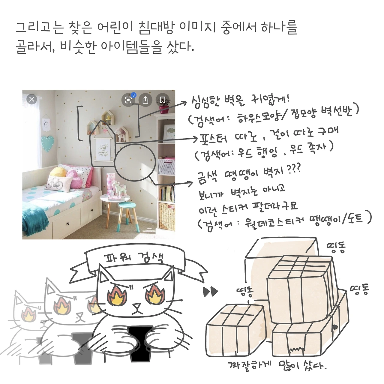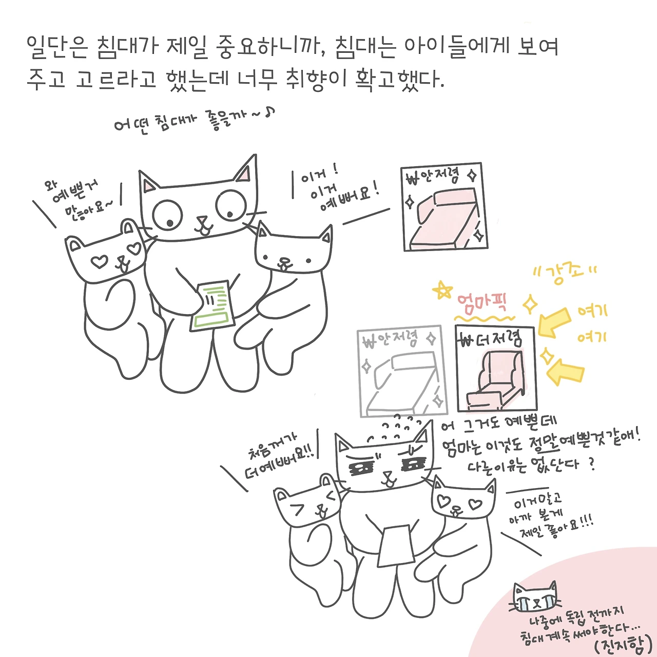 일단 그냥 따로 자라고 하기 전에, 아이들이 스스로 너무너무 좋아하고 자고 싶은 침실로 꾸며줘야 할 것 같다고 생각했다. 그래고 침대같이 큰 가구를 아이들의 선호 반영 없이 사면 바꾸기도 힘들고 하기 때문에 미리 같이 검색해보면서 어떤 게 좋을지 (물론 네이버 검색에서 가격대를 설정하여 얼마 이상의 비싼 침대는 검색 결과에 나오지도 않게 해 뒀음) 함께 살펴보았다 -- 6살이면 이렇게 같이 인터넷 쇼핑하는 것도 가능하다니, 이것도 정말 좋았다.