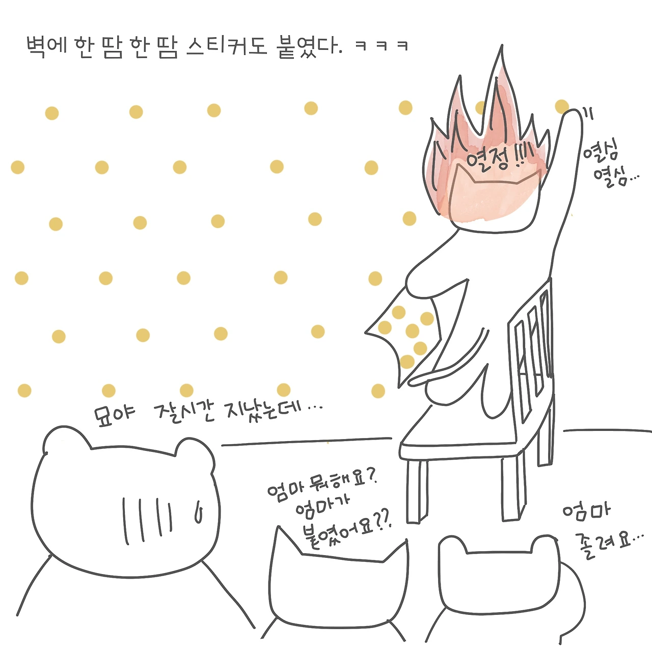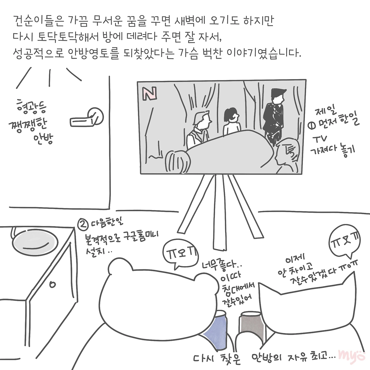 아이들이 쑥쑥 크려고 뒤척뒤척거리느라고, 잘 때 발차기 맞고 별 본 것이 한두 번이 아니었다. 그리고 애들이 안방에서 자고 나면 거기서는 아무것도 할 수 없고, 거실은 또 안방과 너무 붙어있어서 티브이 보기도 조마조마하고 그랬는데, 아이들이 방에서 잘 자니 안방에서 우리는 형광등도 켜고! 티브이도 안방으로 갖고 오고! 신나게 놀 수 있었다. 육퇴가 더 즐거워졌다.