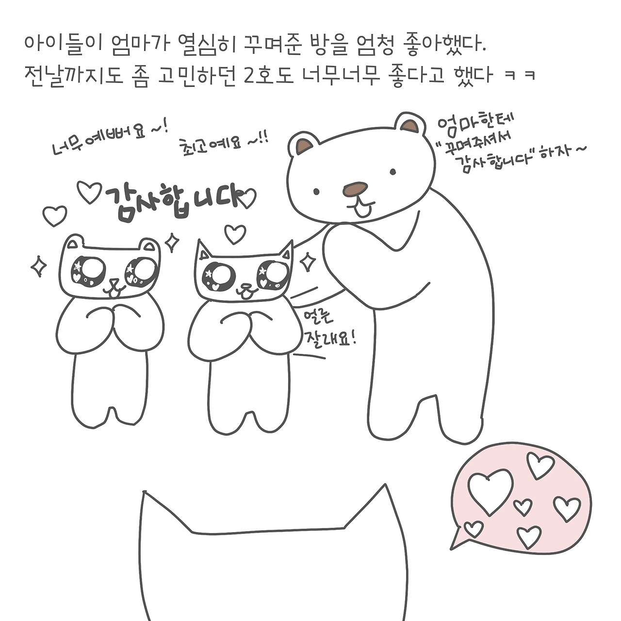 물론 핀터레스트는 세상 예쁜 사진들만 모아놨기 때문에 똑같이 할 수는 없다! 그래도 주변에서 비슷비슷하게 찾아서 꾸밀 수는 있으니 많이 참고해서 꾸몄었다. 아이들이 방이 너무 예쁘다고 좋아하면서 연신 '엄마 고맙습니다'를 외쳤다. 두근두근 아이들이 아이들 방에서 처음 잠드는 날! 혹시라도 바로 깨서 울면서 오지 않을까 했는데, 아침까지 쿨쿨 잘 자서 정말 뿌듯했다.