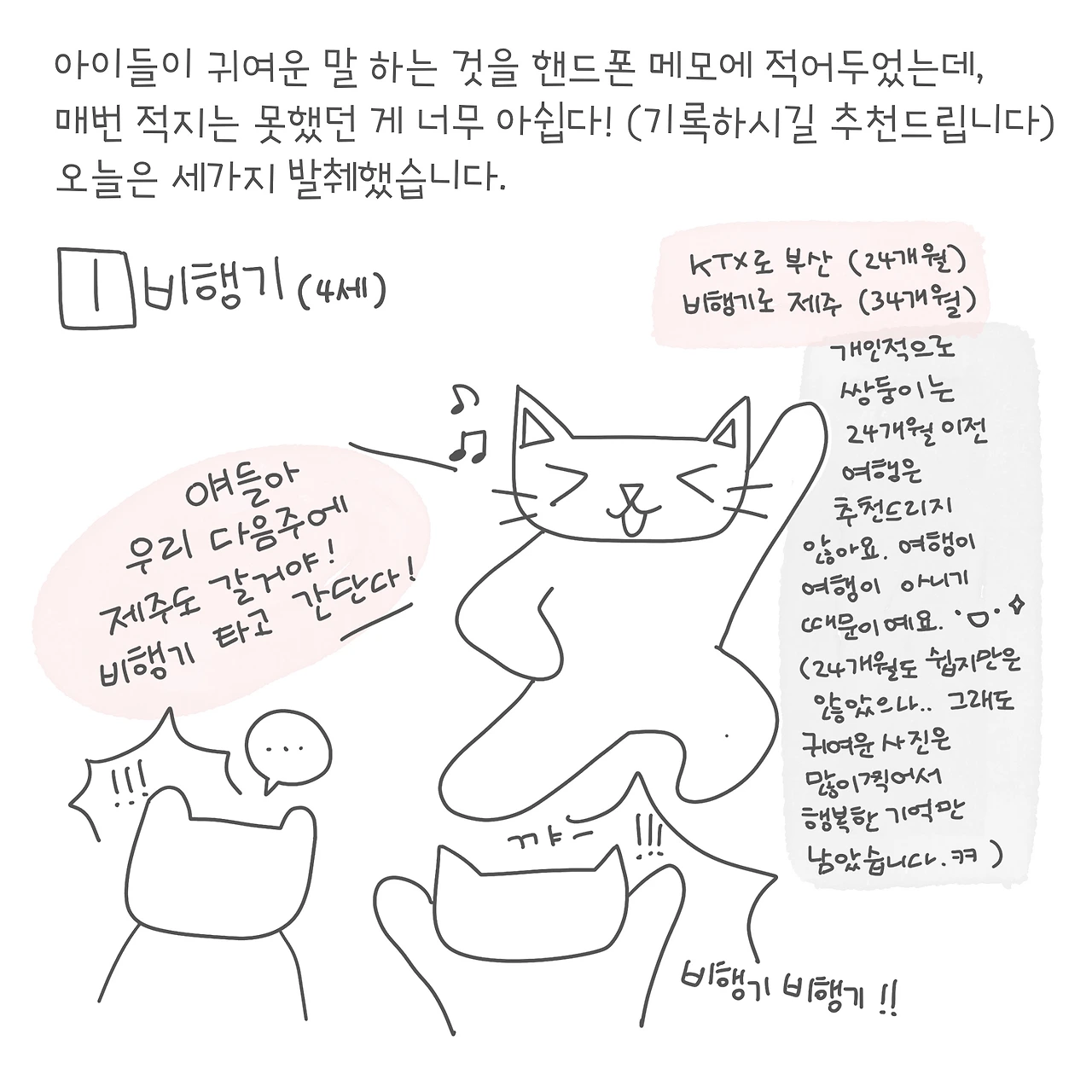 아이들 말 배울 때 정말 귀여운 어록들을 많이 만드는 것 같다. 나는 애들이 말 시작할 때부터 귀여운 말 들은 바로 적거나 하루가 끝날 때 즈음 휴대폰에 적어뒀는데, 매번 적지는 못하고 미루던 게 많아서 그렇게 많지도 않다. 더 많이 기록해 둘걸. 사랑스러운 귀여운 말 여기 적은 것보다 훨씬 더 많이 말해줬는데 싶다. 그래도 적어놓은 것들은 가끔 보면 정말 미소 한가득 아직도 너무 귀엽다. 아이들은 아기일 때부터 이렇게 귀여운 생각을 계속했는데, 말하는 걸 늦게 배워서 그동안 좀 답답했겠구나 싶다.