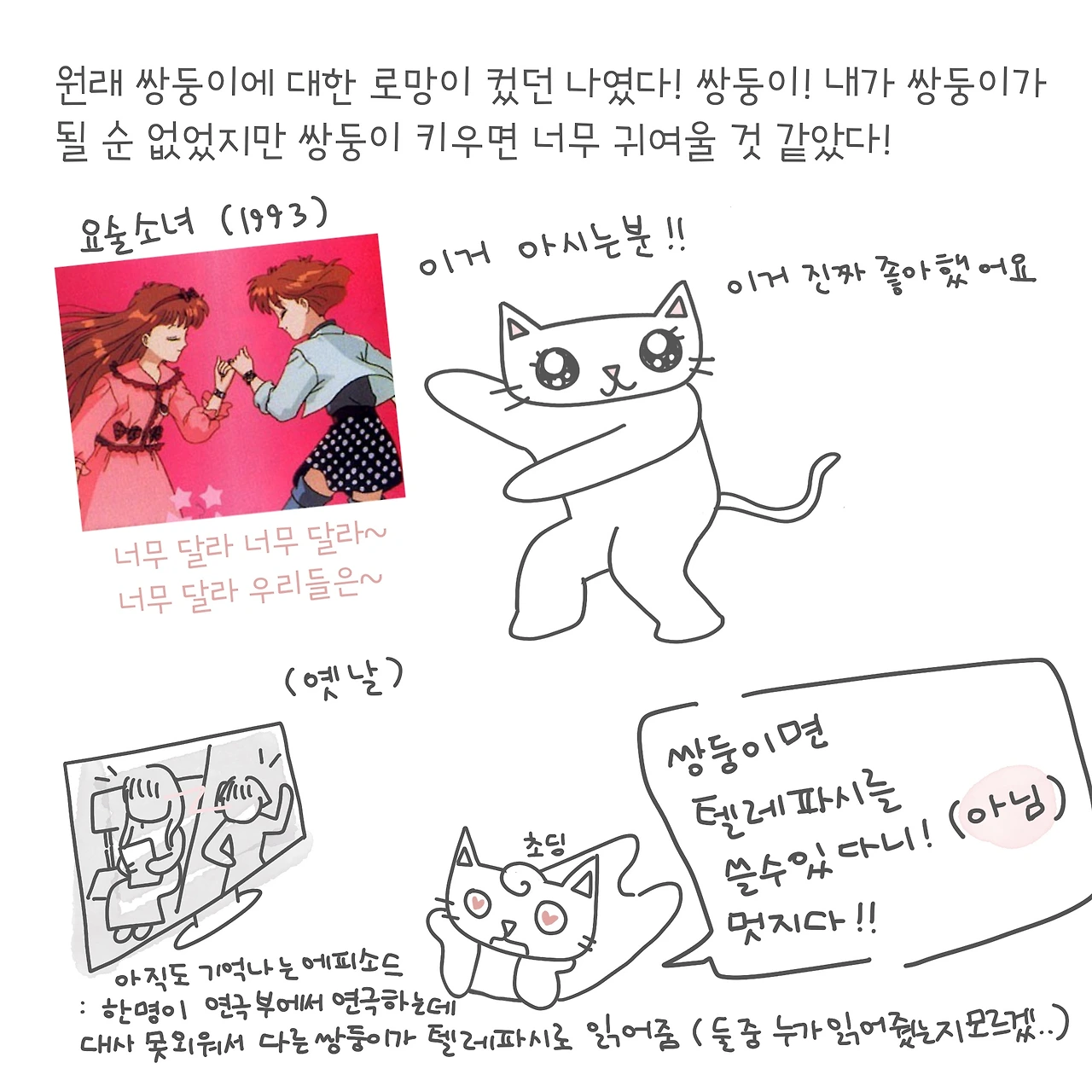 쌍둥이는 물론 만화에서 본 것이지만 생각해보면 너무 좋을 것 같았다. 뭘 하든 같이 할 수도 있고, 학원도 학교도 같이 다닐 수 있을테니 너무 좋을 거라 생각했다! 물론 쌍둥이었던 적이 없으니 당사자로서의 마음은 알 수 없지만... 지금 우리집 쌍둥이들은 "우리는 쌍둥이라 맨날 같이 놀 수 있어서 좋아"라며 나한테 너무 좋고 고맙다고 한다. (하지만 싸울때는 또 서로 같이 안 살겠다고 난리다.^^)
