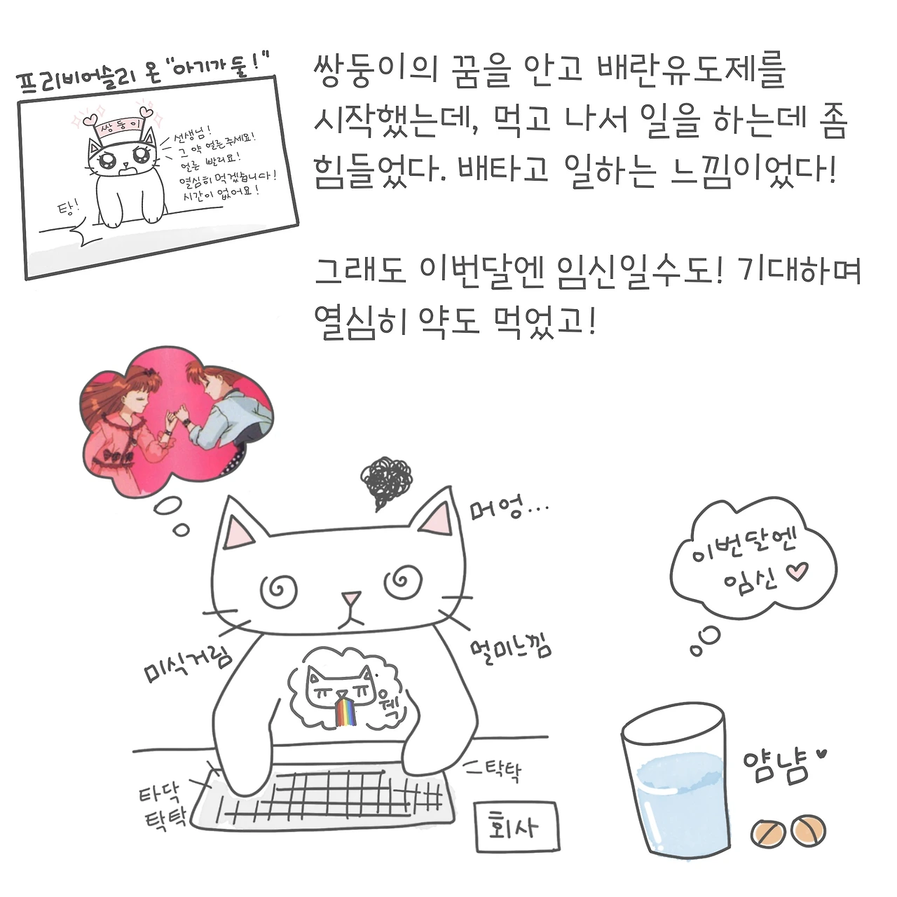 나는 한 번 크게 꽂히면 물불안가리고 달리다가 뭔가 잘 안되는 것 같으면 크게 실망해버리는 안좋은(?) 습관을 가지고 있는데, 임신도 그랬다. 수 개월간 노력하고는 안되었을때는 너무 속상한 마음에 그냥 놓아버렸고 다시 수 개월동안 임신은 그냥 잊고 지냈던 것 같다. 수 년간 노력하는 부부들도 많을텐데, 내가 이렇게 수 개월로 속상해 해도 되는 건가 싶기도 했지만, 결국 나한테 벌어지는 일은 상대적인 것이 아니고 그냥 절대적으로 나에겐 가장 힘든 일이기 때문에 어쩔 수 없었다! (임신 준비 하시는 분들은 저와 같이 엄청난 기대치를 가지고 시작하시기 보다는 여유로운 마음가짐을 가지시길 바랍니다. ^^)
