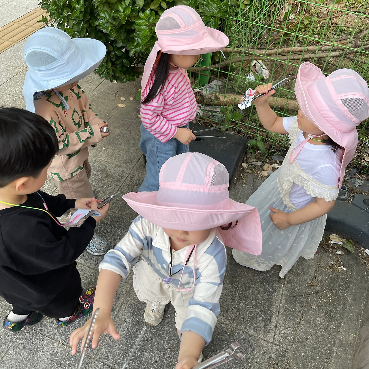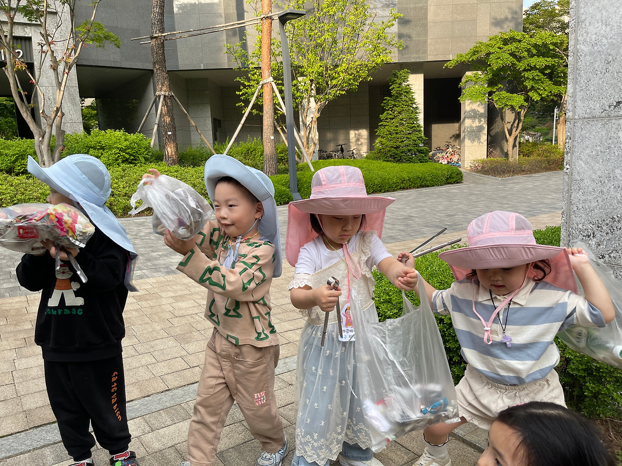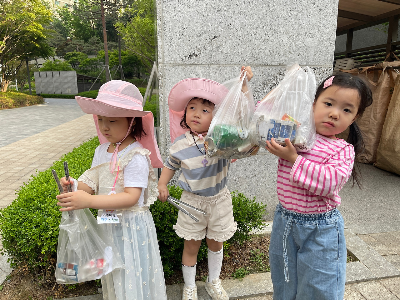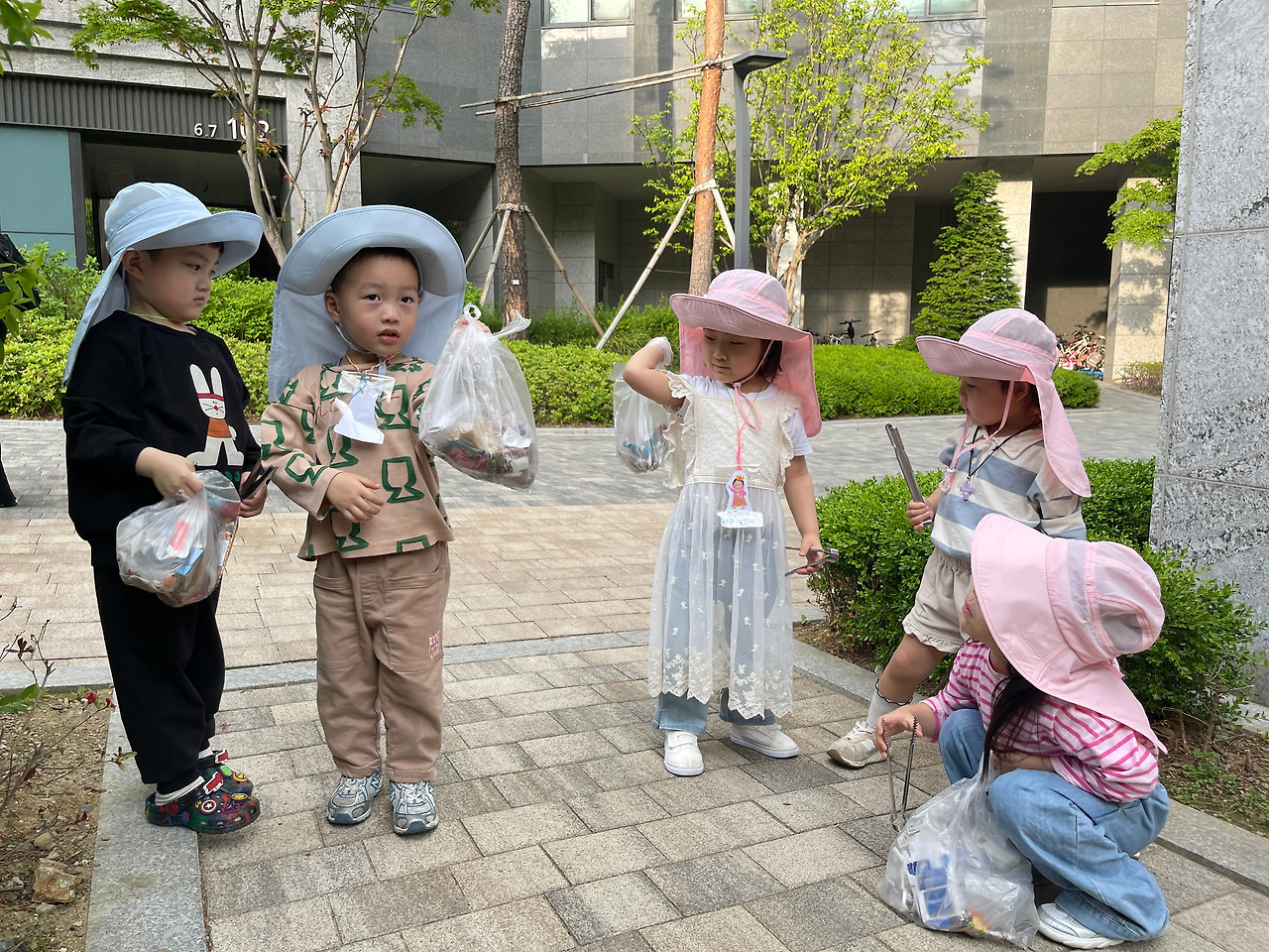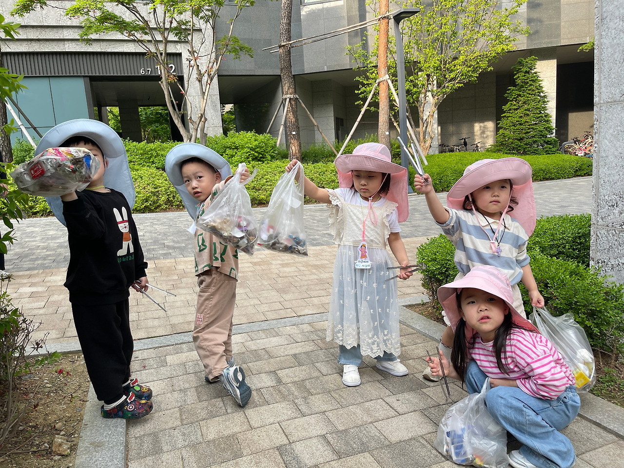 임명식을 마친 다섯 명의 지구 지킴이들은 작고 귀여운 손을 모아 “파이팅!”을 외치고, 엄마들과 함께 동네로 ‘줍깅 출동’을 했습니다. 놀랍도록 진지한 표정으로 쓰레기를 줍는 아이들. 동네 어르신들께 응원도 받고, 칭찬도 받으며 더욱 힘이 났어요.