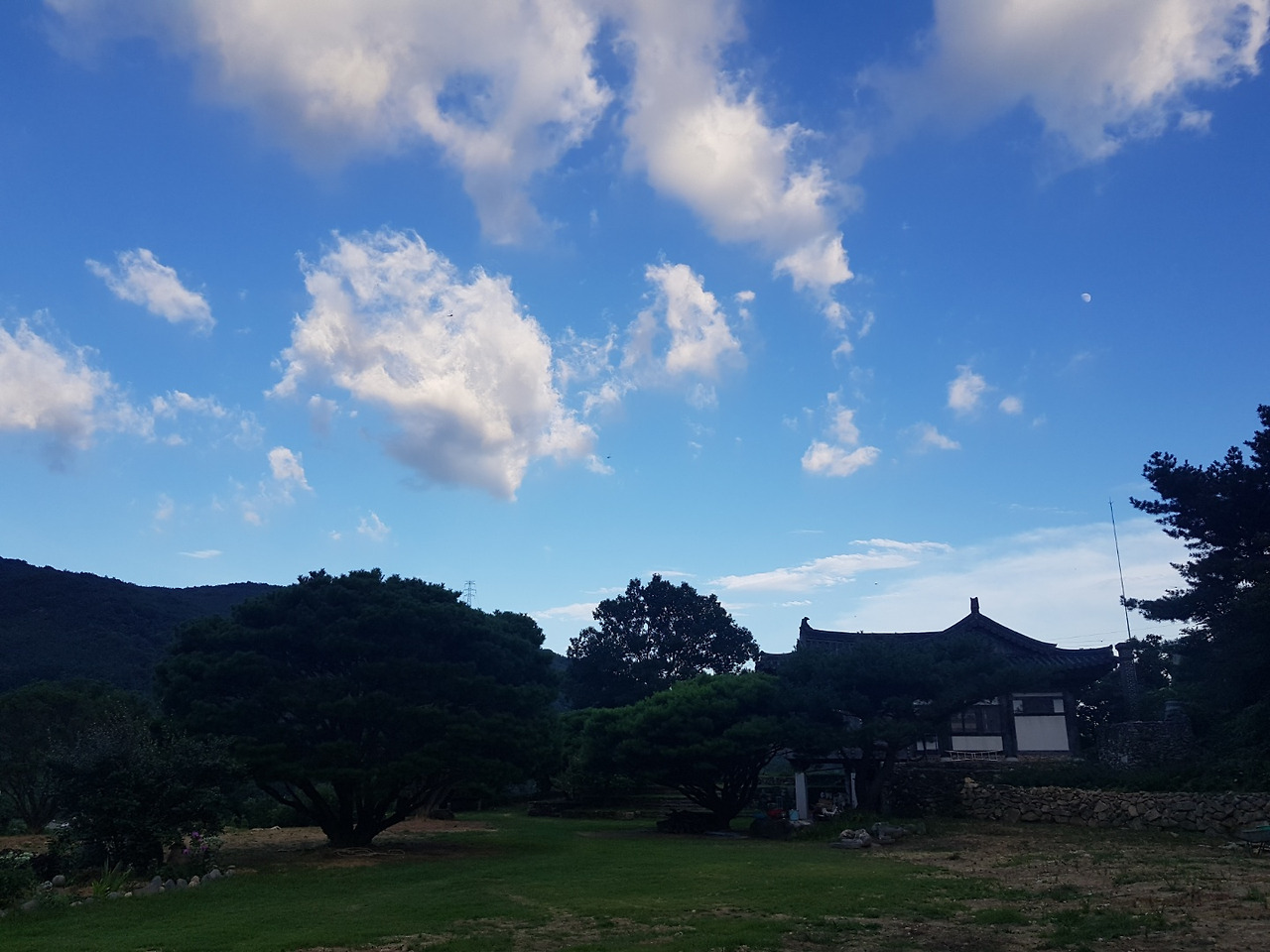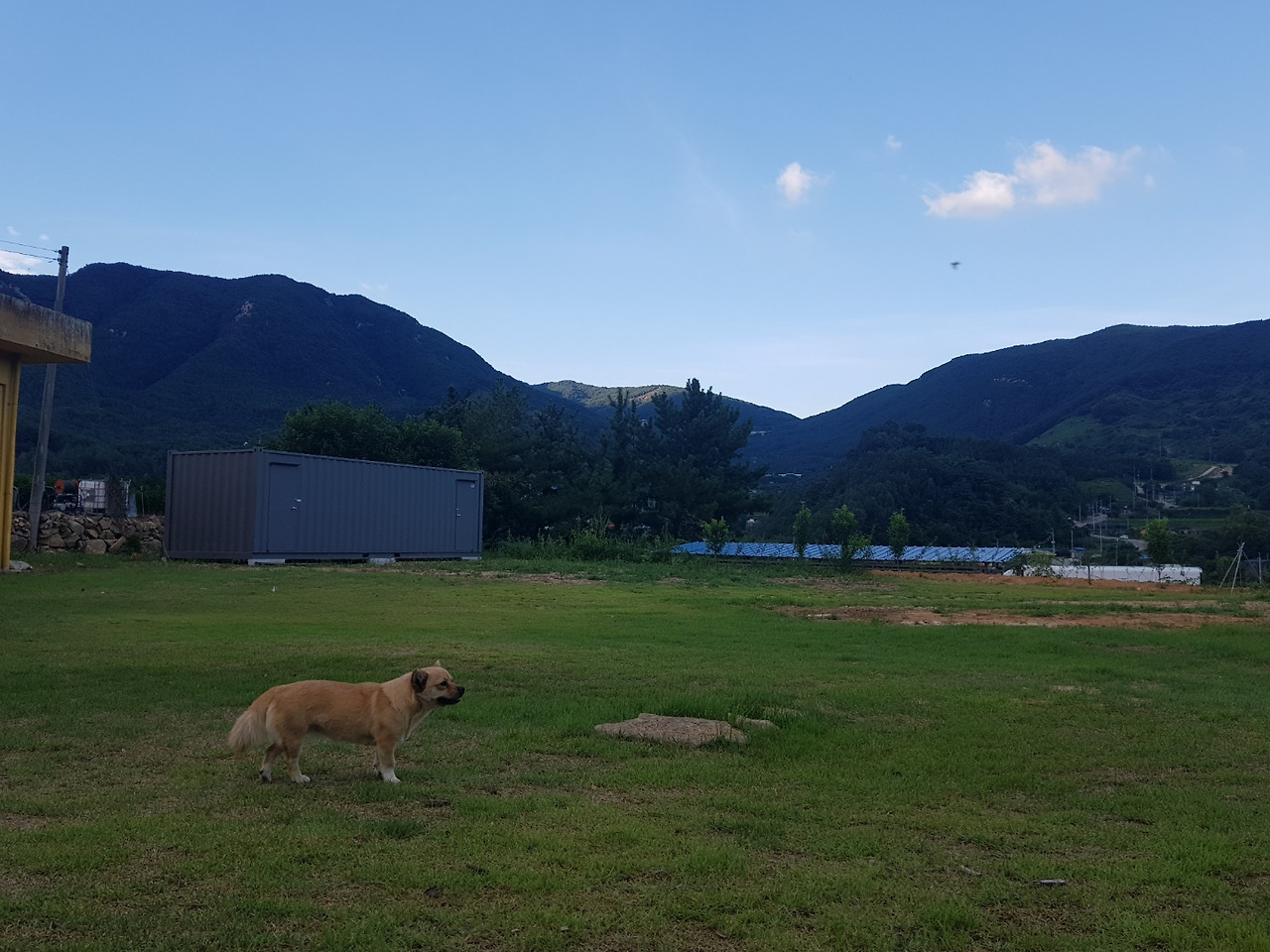 산청요는 널찍한 공간에 이쁜 한옥과 산업화 시절을 연상시키는 건물이 함께 있었다. 특이한 것은 개집도 한옥이었다. 멍뭉이 두 마리가 연신 경계를 하면서도 졸졸 따라다녔다.