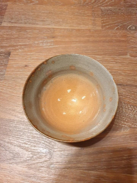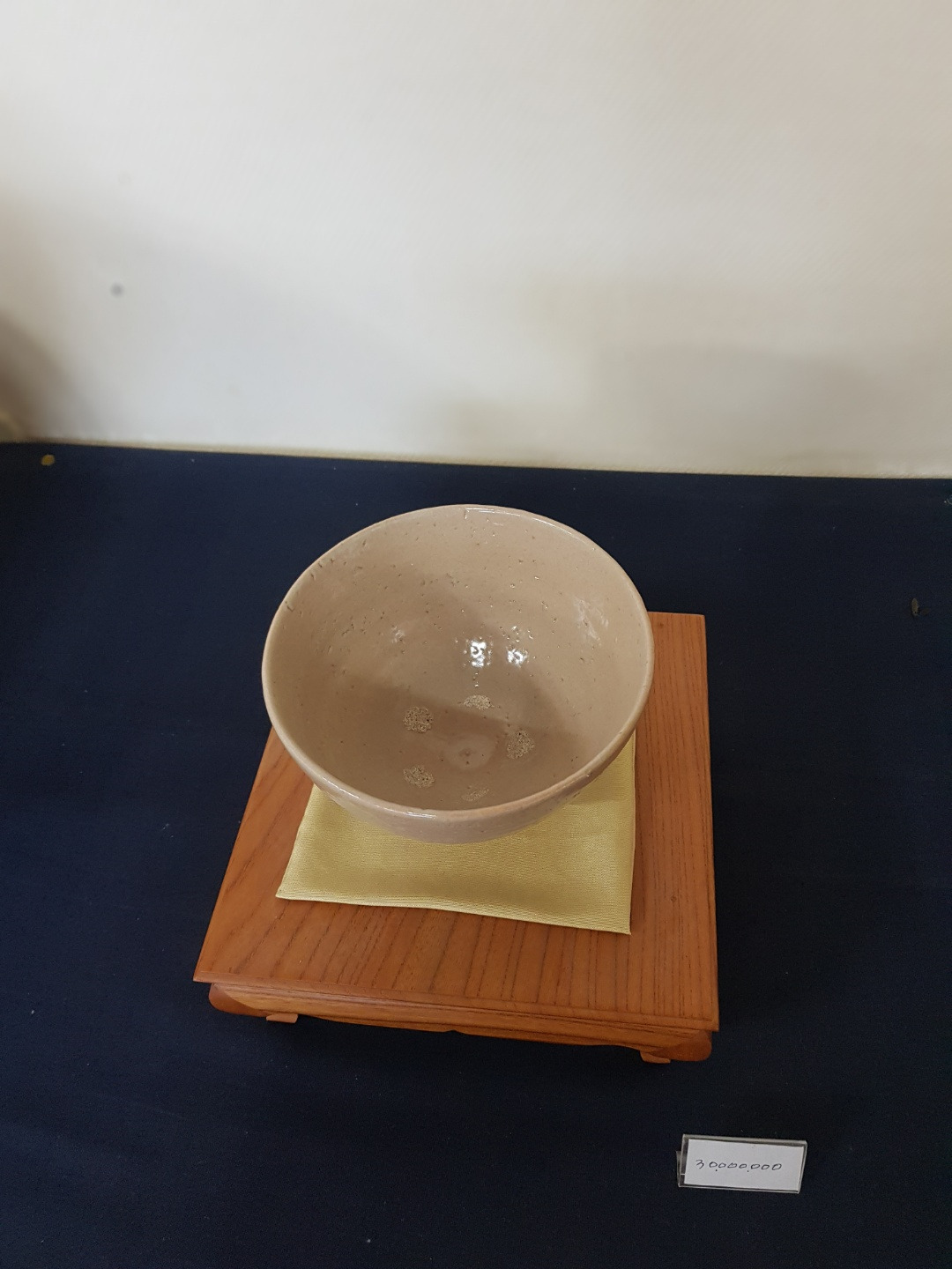 바로 이렇다. 가운데 5개의 하얀 점은 도자기를 구울 때 여러 다완들이 위아래로 포개져서 가마에서 구워지기 때문에 유약이 묻지 않아 생긴 반점이다. 그 사방으로 주황빛의 작은 반점들이 바로 자연적으로 발생한 도도야다. 장인의 독보적인 지위를 상징하는 듯하다. 마치 꽃봉오리가 피어오른 듯 아름답다.