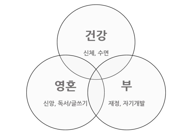 건강은 신체적 건강을 말한다. 지금과 같이 꾸준히 운동하고 좋은 수면 습관을 유지한다. 결코 과식하지 않고 야식을 먹지 않고 술 마시지 않는 지금의 좋은 습관을 유지하며 건강한 자산을 만들 것이다. 부의 측면은 재정적인 측면과 능력적인 측면으로 이루어지는데, 재정적인 측면은 배우자와 함께 세운 우리의 목표와 과시하지 않는 생활방식을, 능력적인 측면은 자기계발을 멈추지 않는 것을 말한다. 비록 나는 가까운 미래에 워킹맘이되고 약간의 휴직기간도 갖겠지만 장기적으로 하고 싶은 일들이 있다. 이를 멈추지 않을 것이다. 마지막으로 영혼의 측면은 나의 또 다른 자아라고도 할 수 있는 것들이다. 독서와 글쓰기, 그리고 신앙생활이다. 2024년 하반기가 되며 나의 독서는 재독 중에서도 투자와 신앙 쪽으로 편중되었다. 설교와 말씀의 가르침을 받아 삶과 신앙이 구분되지 않는 지혜를 녹여가며, 하나님의 향기를 내는 자녀이자 가정이 되기 위해 노력할 것이다. 나를 향한 하나님의 오차 없는 계획을 따라가기 위해 포기하지 않겠다고 다짐한다.