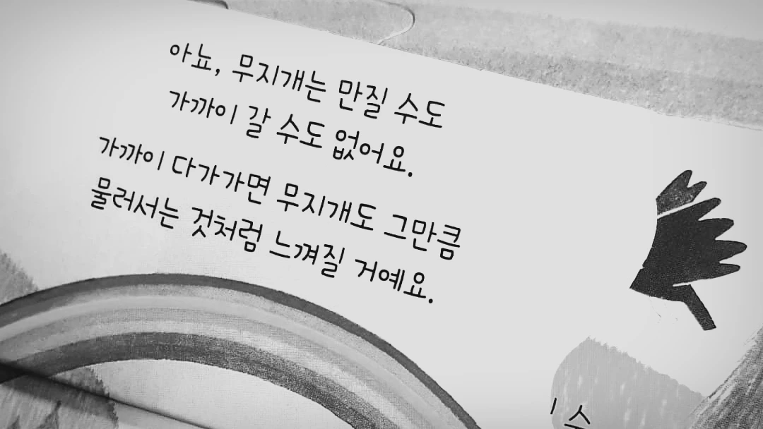 별 사탕 이야기를 나눈 후, 며칠이 지났을까... 무지개를 소개한 책을 읽게 되었다. 그 책에서는 무지개는 만질 수도 가까이 갈 수도 없다고 말하고 있었다. 그 말을 들은 도하가 다급하게 물었다.