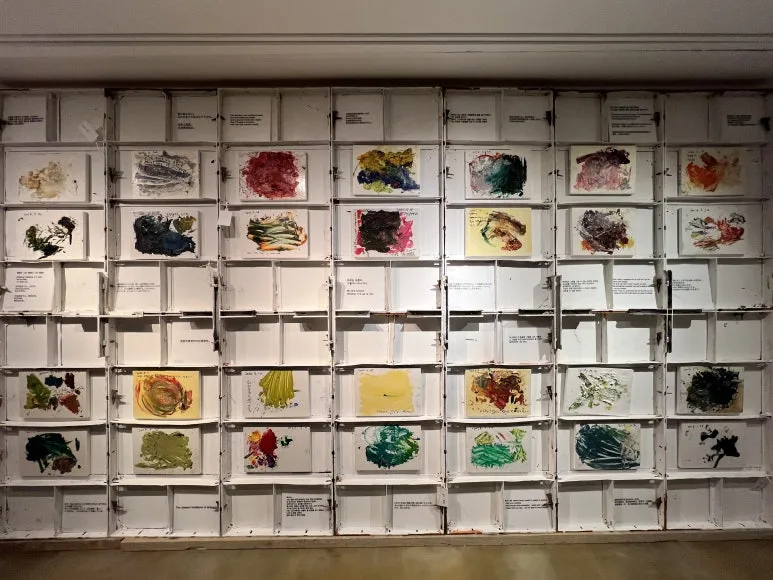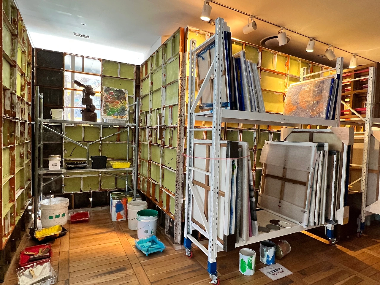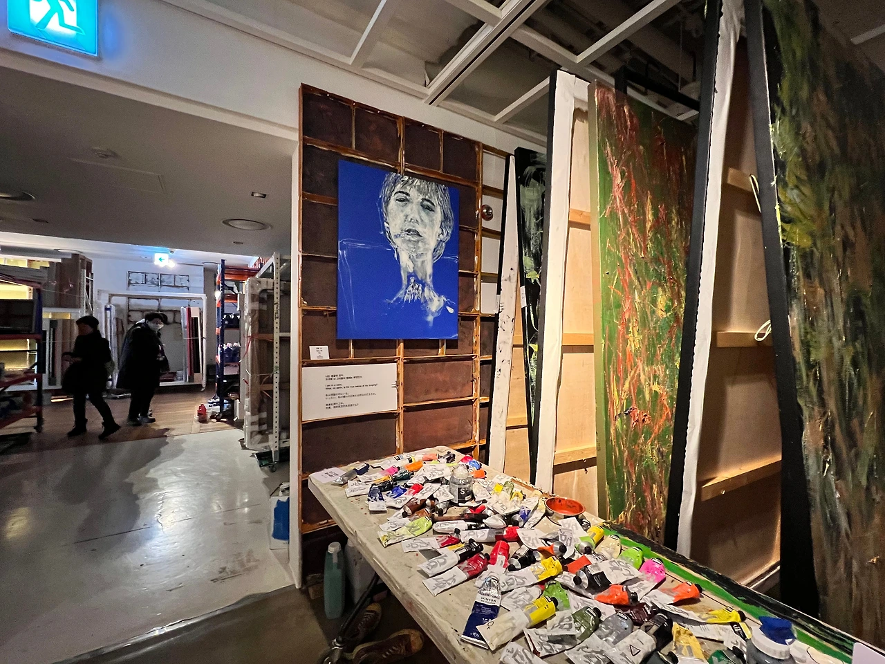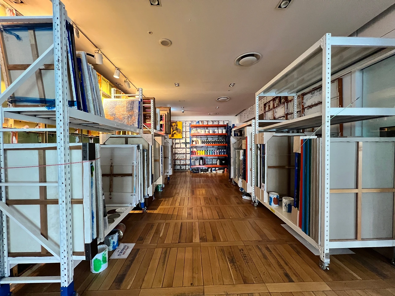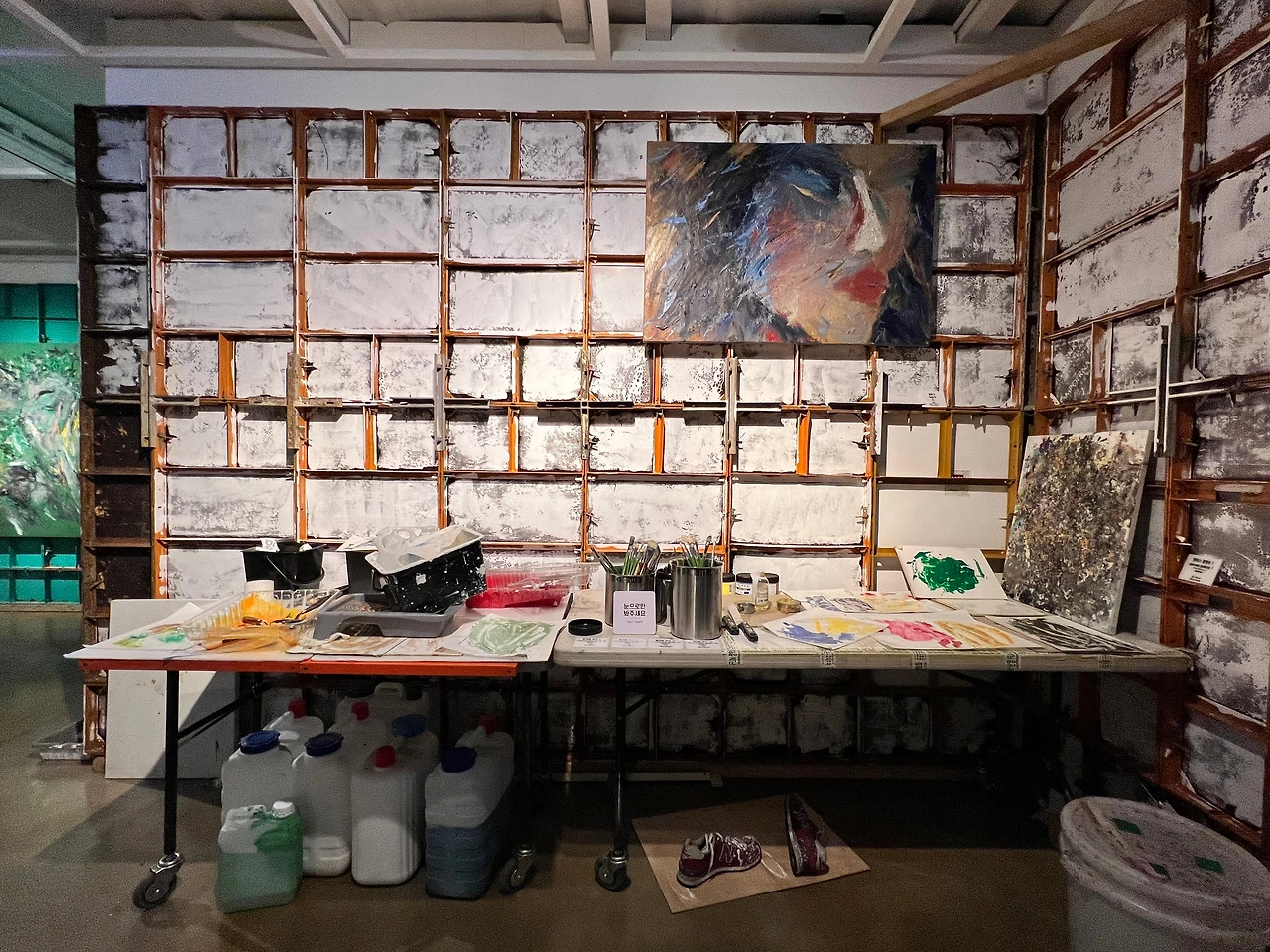 이 전시는 전시장 벽체가 독특합니다. 요즘 전시장 벽체로 시스템 비계나 유로폼을 사용하는 경우가 종종 있어 생경하진 않았는데, 세종문화회관 미술관을 유로폼으로 꾸몄던 적은 없어서 이건 색달라 보이더라고요. 유로폼(Euro Form)은 건축자재로, 건설 현장에서 철근 콘크리트 구조물 시공에 가장 널리 쓰이는 '거푸집'입니다. 유로폼, 알폼, 갱폼 이렇게 나뉘던데, 이 전시 덕에 새 용어를 습득했어요. 어쨌든 1,500여 개의 유로폼이 전시장 벽체로 활용됐는데, 유로폼 뒤판마다 색을 칠해 독특한 분위기를 완성했죠. 작품도 걸 수 있고 설명판도 올려놓을 수 있고 종이 팔레트 작품은 마치 액자에 넣은 것처럼 이 안에 쏙 들어가니, 여러모로 스마트한 선택이었다고 감탄하며 봤어요. 공임이 만만치 않은 작업이었겠지만요. 하지만 그런 노력 덕에 전시장이 더 힙하게 느껴집니다. 전시장을 가득 채운 향, 음악과도 멋지게 어울렸고, 회화 작품과 퍼포머를 위한 완벽한 무대가 되었으니까요. 쇼(공연) 장이면서 전시실이 필요한 '전시쑈'의 무대로는 제격이었죠. 아! 전시장 전체 콘셉트는 작가의 작업실입니다. 그래서 전시장 초입에 작가의 작업실 화구와 작품이 그려진 혹은 그릴 캔버스 등이 놓여있고 굿즈 숍 입구에도 붓이 놓여 있어요.