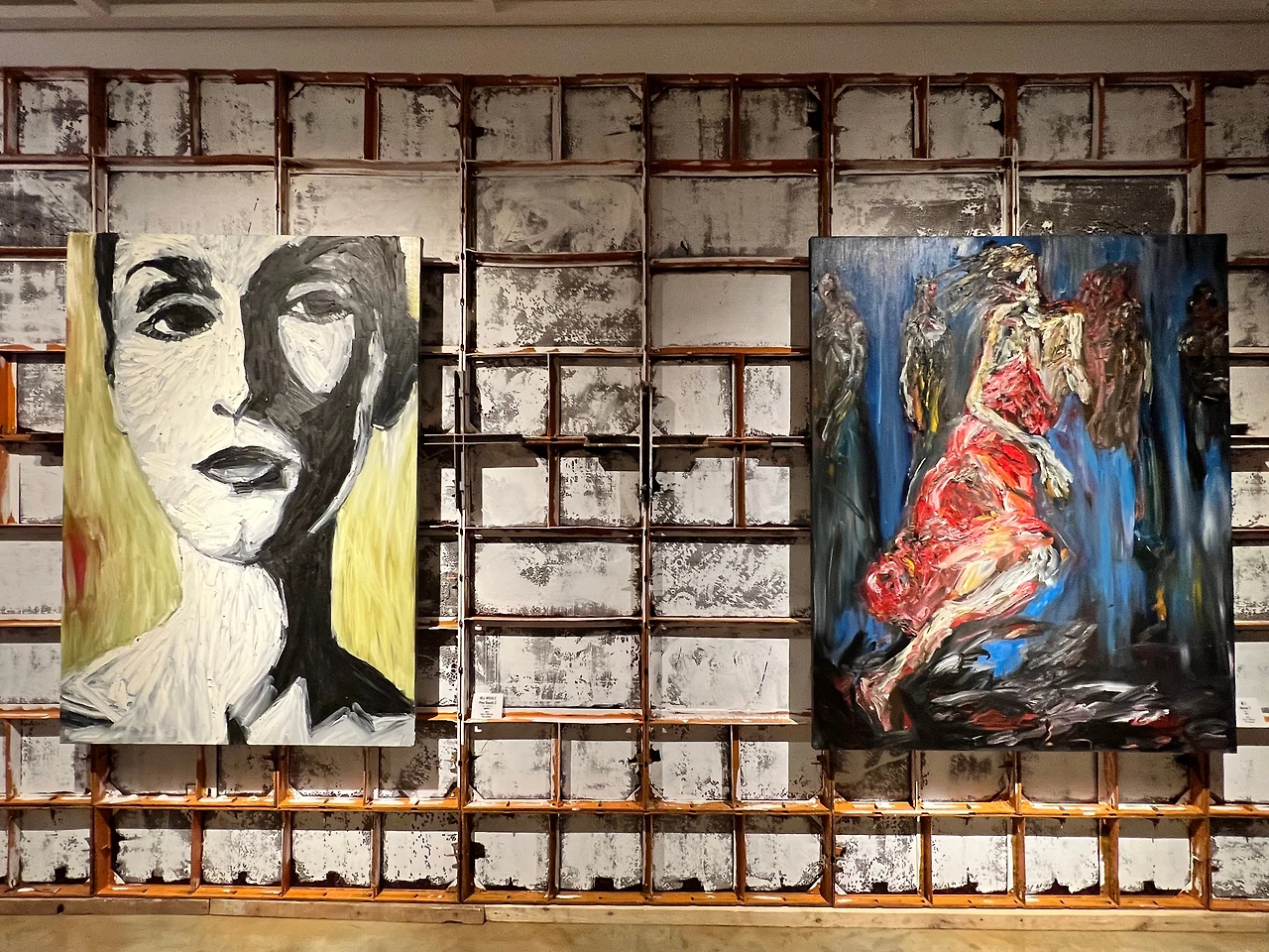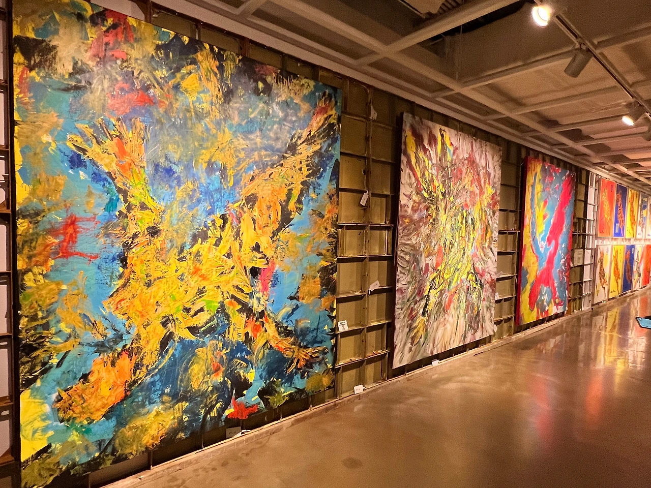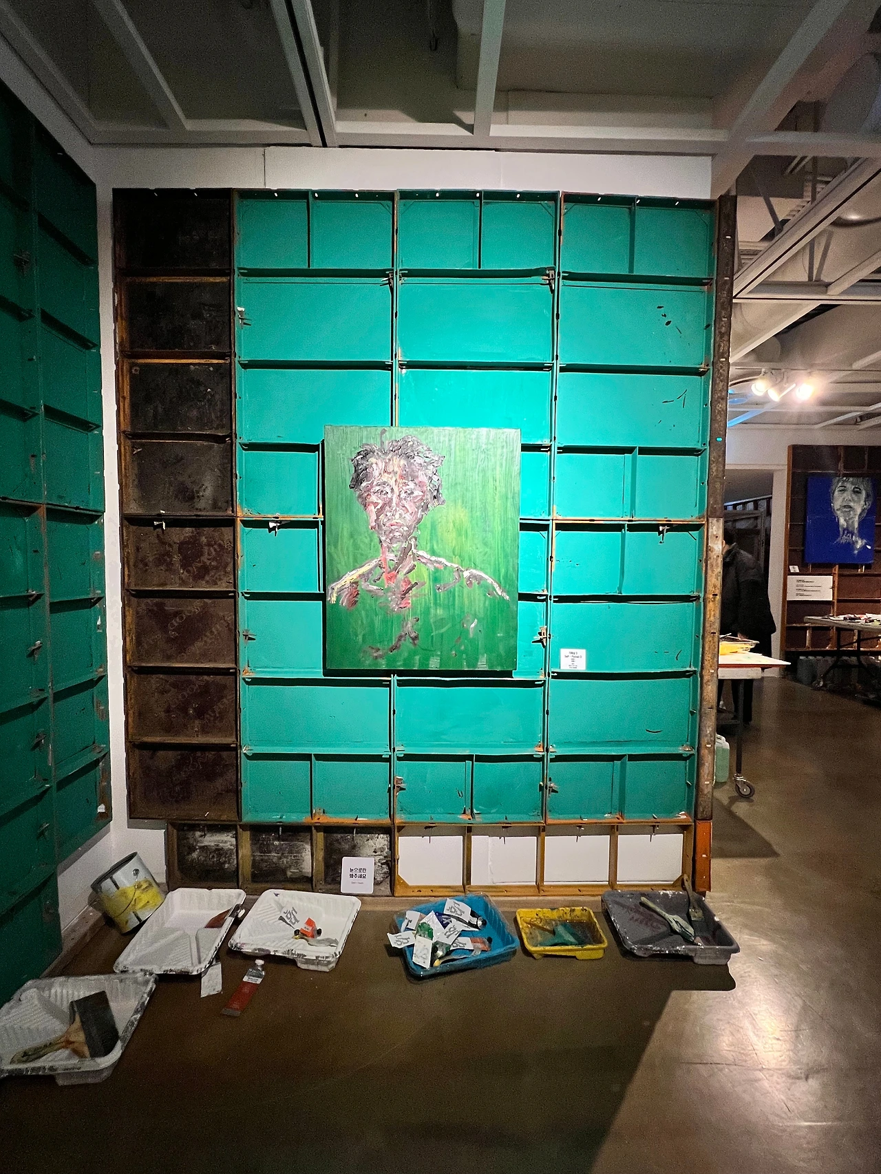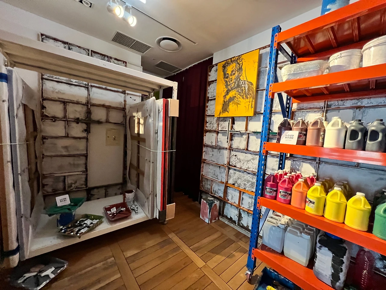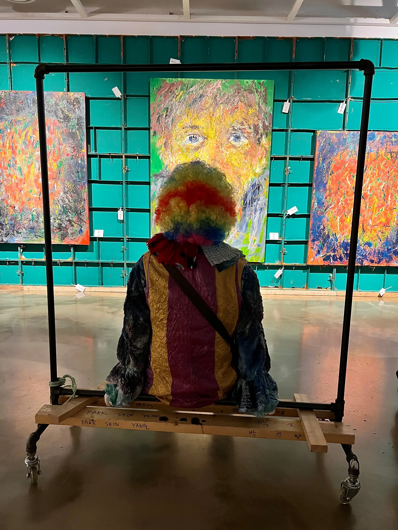 이 전시는 전시장 벽체가 독특합니다. 요즘 전시장 벽체로 시스템 비계나 유로폼을 사용하는 경우가 종종 있어 생경하진 않았는데, 세종문화회관 미술관을 유로폼으로 꾸몄던 적은 없어서 이건 색달라 보이더라고요. 유로폼(Euro Form)은 건축자재로, 건설 현장에서 철근 콘크리트 구조물 시공에 가장 널리 쓰이는 '거푸집'입니다. 유로폼, 알폼, 갱폼 이렇게 나뉘던데, 이 전시 덕에 새 용어를 습득했어요. 어쨌든 1,500여 개의 유로폼이 전시장 벽체로 활용됐는데, 유로폼 뒤판마다 색을 칠해 독특한 분위기를 완성했죠. 작품도 걸 수 있고 설명판도 올려놓을 수 있고 종이 팔레트 작품은 마치 액자에 넣은 것처럼 이 안에 쏙 들어가니, 여러모로 스마트한 선택이었다고 감탄하며 봤어요. 공임이 만만치 않은 작업이었겠지만요. 하지만 그런 노력 덕에 전시장이 더 힙하게 느껴집니다. 전시장을 가득 채운 향, 음악과도 멋지게 어울렸고, 회화 작품과 퍼포머를 위한 완벽한 무대가 되었으니까요. 쇼(공연) 장이면서 전시실이 필요한 '전시쑈'의 무대로는 제격이었죠. 아! 전시장 전체 콘셉트는 작가의 작업실입니다. 그래서 전시장 초입에 작가의 작업실 화구와 작품이 그려진 혹은 그릴 캔버스 등이 놓여있고 굿즈 숍 입구에도 붓이 놓여 있어요.