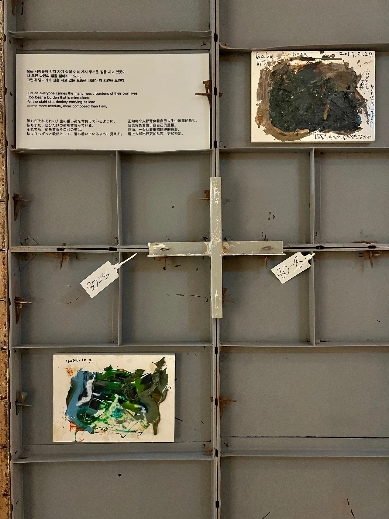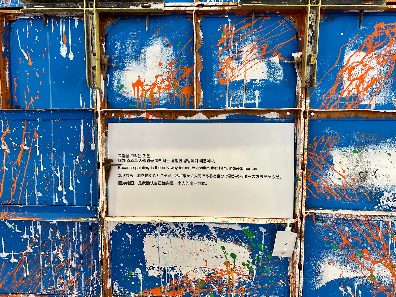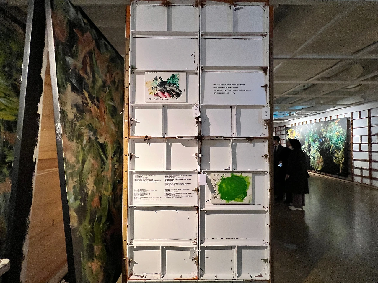 전시장엔 섹션을 구분 짓는 텍스트가 없습니다. 벽체 색으로 공간이 전환되고, 곳곳에 배치된 작가의 말들로 공간과 작품이 연결됩니다. 작가가 왜 그림 그리기를 시작했는지, 처음 그린 그림은 무엇인지, 그림이 작가에겐 어떤 의미인지 등 속 깊은 이야기들이 작가의 손으로 작품에 적혀있거나 인쇄 글로 놓여있죠. 한글, 중국어, 영어, 일본어로 병기되어 있어서 외국 친구와 함께 보기에 좋습니다.