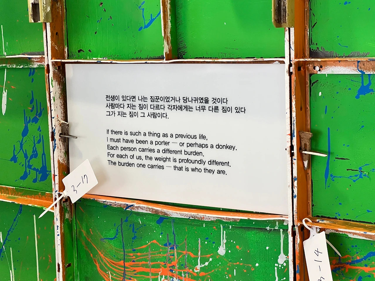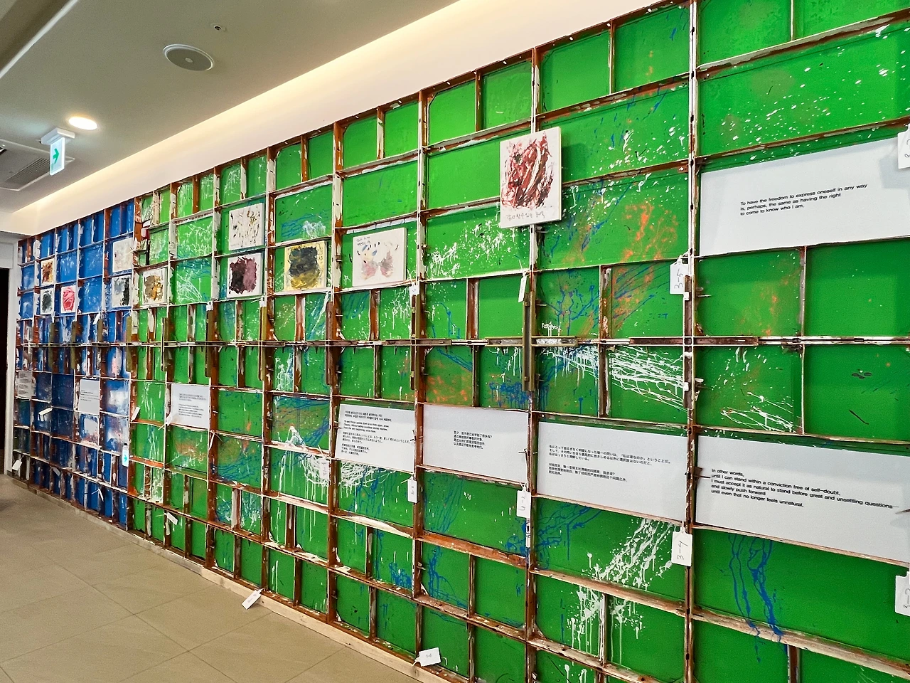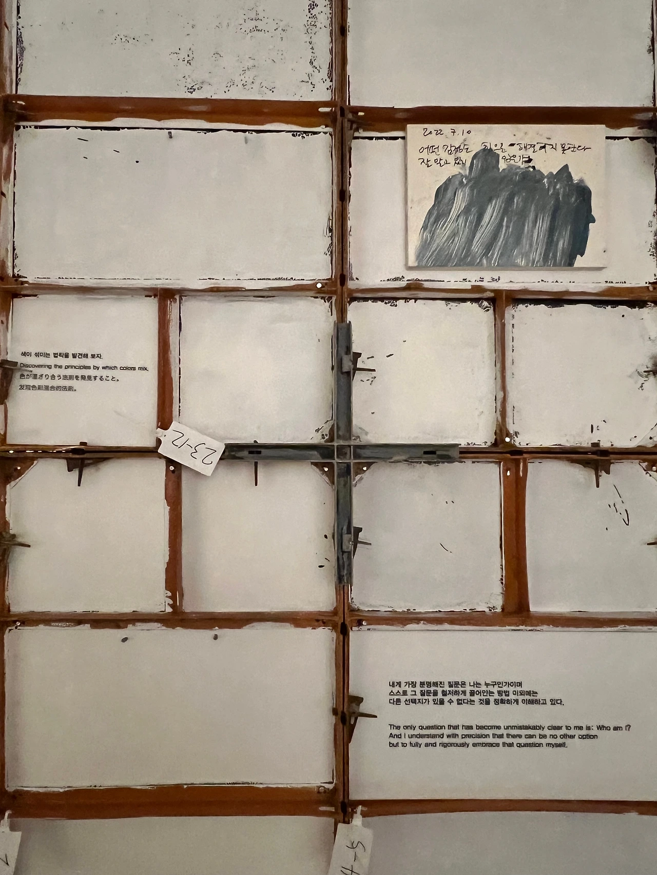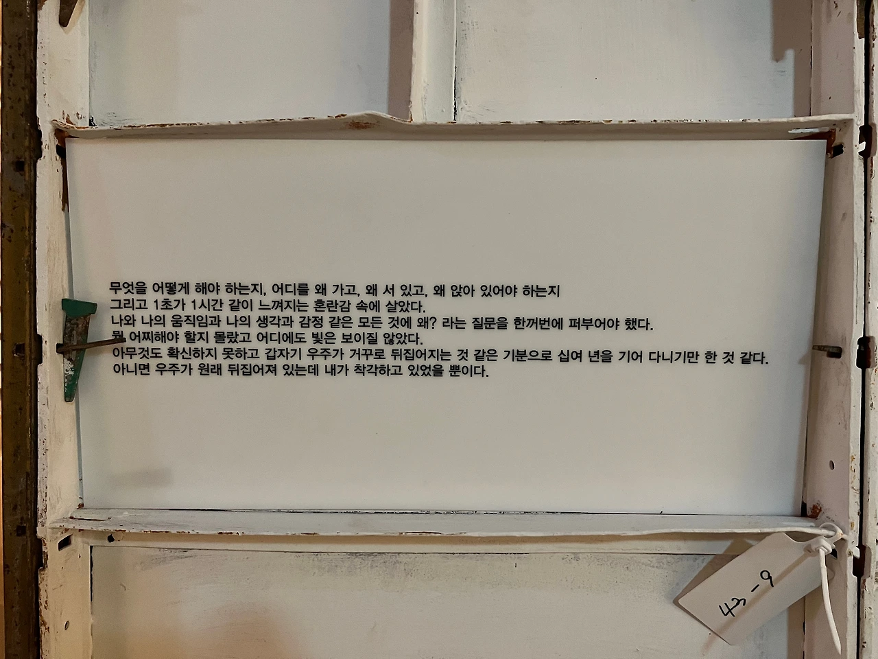 전시장엔 섹션을 구분 짓는 텍스트가 없습니다. 벽체 색으로 공간이 전환되고, 곳곳에 배치된 작가의 말들로 공간과 작품이 연결됩니다. 작가가 왜 그림 그리기를 시작했는지, 처음 그린 그림은 무엇인지, 그림이 작가에겐 어떤 의미인지 등 속 깊은 이야기들이 작가의 손으로 작품에 적혀있거나 인쇄 글로 놓여있죠. 한글, 중국어, 영어, 일본어로 병기되어 있어서 외국 친구와 함께 보기에 좋습니다.