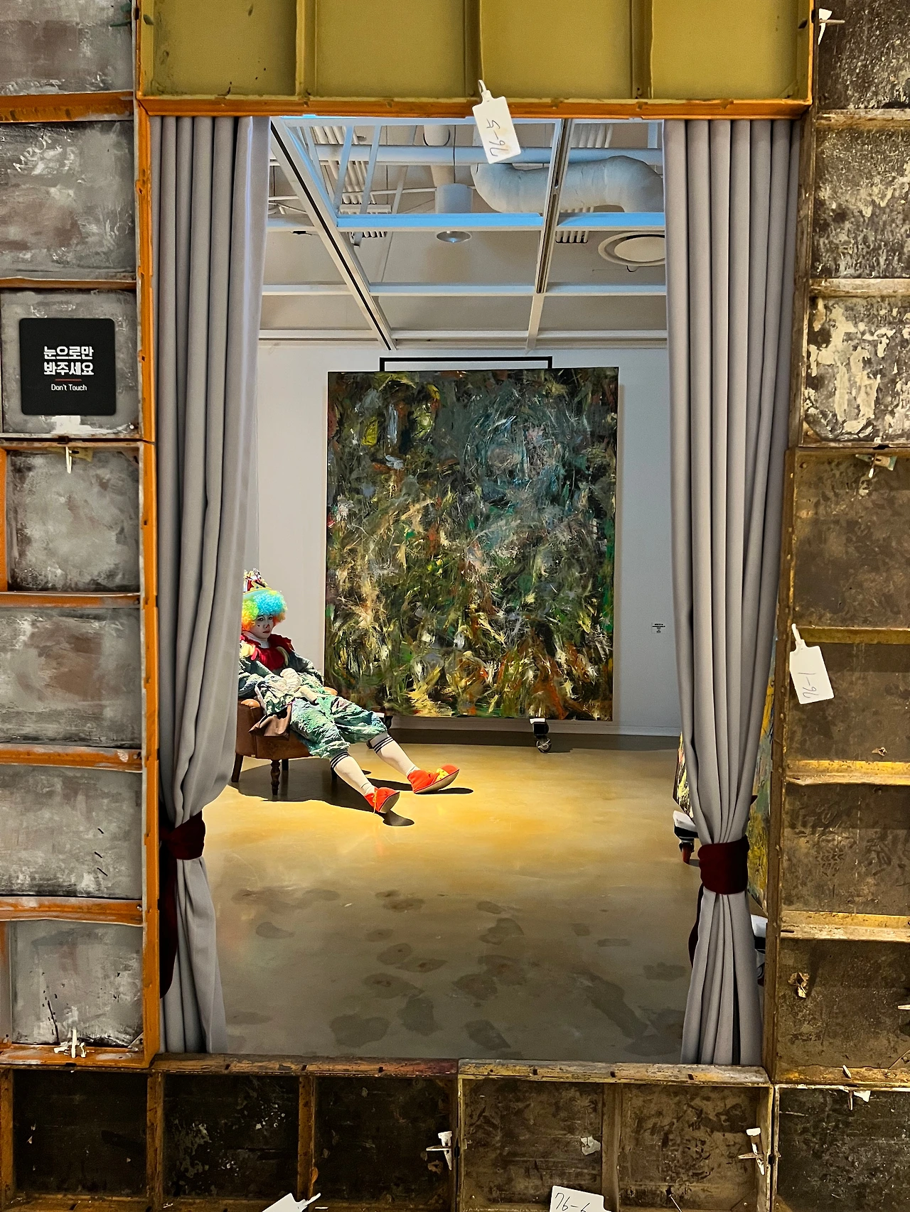 이외에도 전시쑈를 특별하게 하는 두 가지가 더 있습니다. 향과 음악이죠. 전시실에는 균일하게 어떤 향이 채워져 있는데, 이 향이 공간과 잘 어울려요. 마스크를 쓴 제게도 짙은 향이었지만 관람에 전혀 방해되지 않고 기분 좋을 정도로 취하게 하죠. 또 선별된 플레이 리스트가 곳곳에 놓인 JBL PARTYBOX1000(?) 스피커로 송출되는데, 사운드가 좋으니까 노래도 귀에 잘 들어오더라고요. 전시를 구경하다 한 노래에 꽂혀 전시 지킴이분께 물어봤는데, 리스트가 공유되진 않아 모른다고 하셔서 많이 아쉬웠어요. 남녀 듀엣 샹송으로 기억하는데, 하룻밤 지나고 나니 기억이 섞여 확신이 없네요. 전시실에서 작품을 보다가 남녀가 같이 부른 샹송 제목을 알게 되시면 제게 댓글 공유 부탁드립니다. 저 그 노래 제목 알고 싶어서 유튜브에 선별된 샹송을 글 쓰는 내내 듣고 있는데 아직 못 찾았어요. 근데, 남녀가 같이 부른 건 맞겠죠? ㅎㅎㅎㅎㅎㅎㅎ 독창이라고 해도, '장밋빛 인생'은 확실히 아닙니다, 그 곡은 알아요 ㅎ