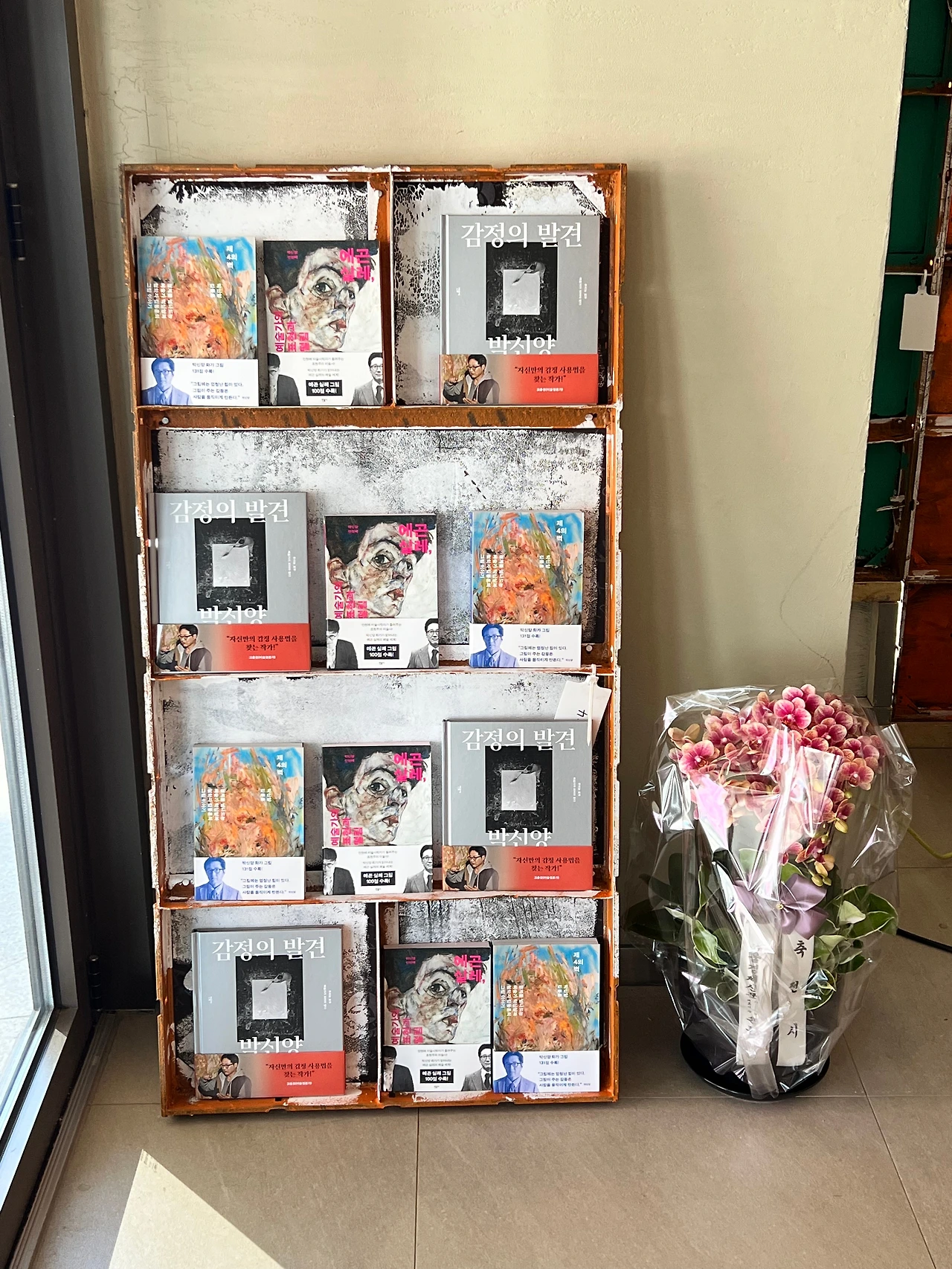 전시실 끝엔 굿즈 숍이 있습니다. 출품작 이미지로 만든 엽서와 포스터, 소품들 그리고 업체들과의 콜라보 제품들이 있어요. 네 컷 사진도 있고요. 전시실 향도 이곳에서 맡아볼 수 있습니다. 도록은 못 봤는데, 이 전시 개막 즈음 출간한 배우 박신양과 인문학자 김동훈의 공저 『제4의 벽』이 도록을 대신할 수 있을 것 같네요. 살짝 봤는데 전시실에서 봤던 그림과 글들이 수록됐습니다.