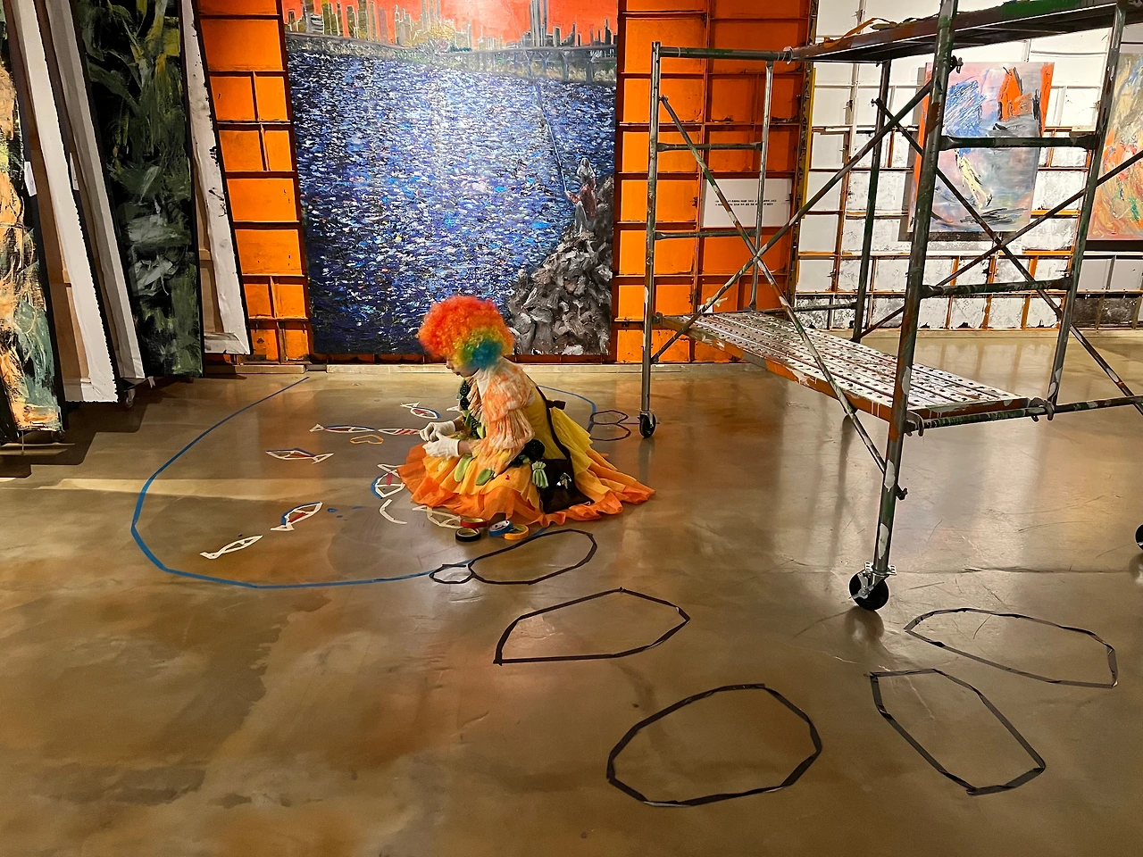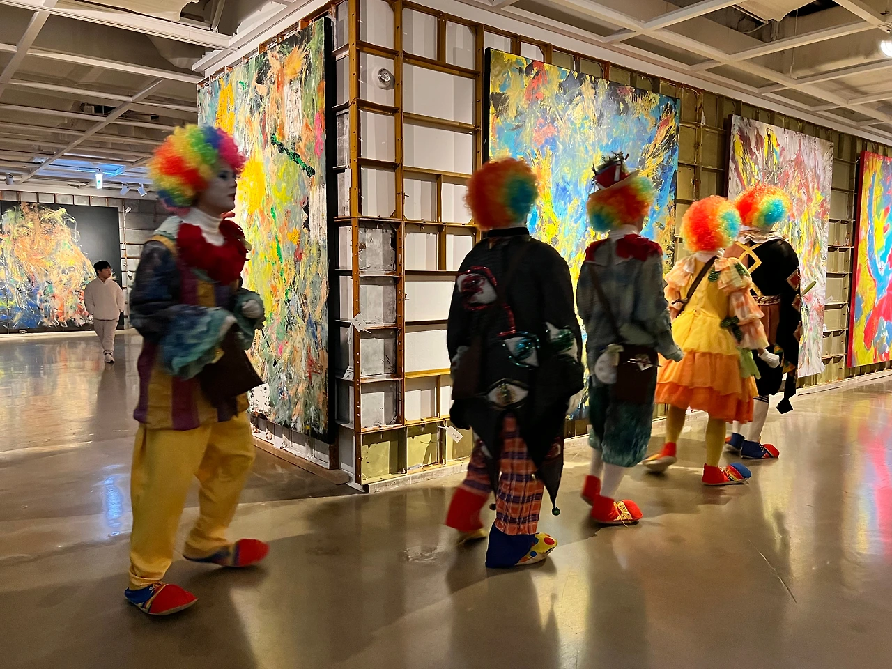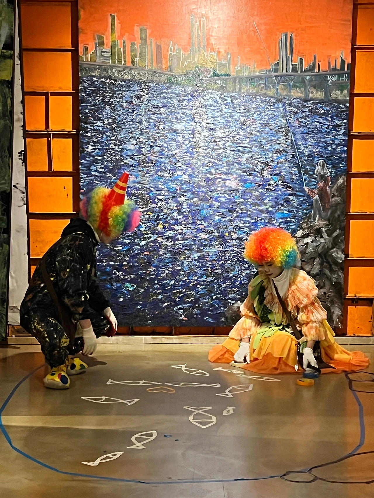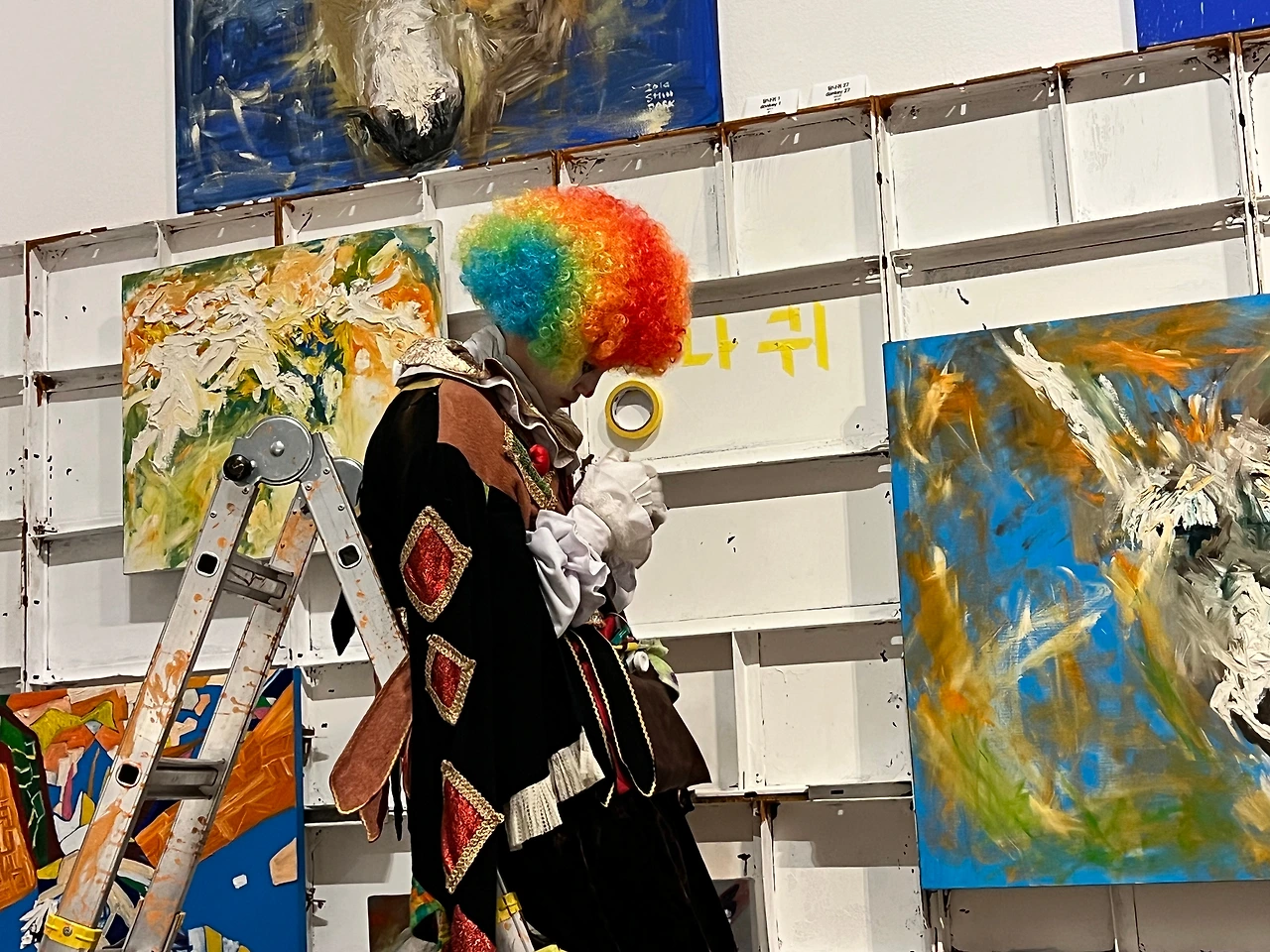 전시쑈에는 퍼포머가 등장합니다. 연극적 전시를 완성시키는 핵심 인물이죠. 제가 본 퍼포머는 총 다섯 분인데, 관련 기사에 열다섯 분으로 적힌 걸로 보아 3교대로 진행되는 거 같아요. 전시쑈 퍼포머의 콘셉트는 '작업실의 정령精靈'입니다. 작업이 끝난 후 정령의 무대가 된 작업실의 모습을 보여주는 거죠. 이 정령들은 따로 또 같이 연기하는데, 각각의 포지션에서 어떤 글씨를 쓰거나 물체를 놓고 자리를 바꾸거나, 자신이 만든 어떤 환경에서 특정한 행동을 하기도 합니다. 그러다 함께 모여 행동하기도 하죠. 전시실 전관에서 계속 어떤 행위들을 지속하는데, 대부분은 무언의 행동이지만 가끔 의성어나 의태어 어떤 단어들을 내뱉기도 해요. 꽤 많은 단어를 들었는데 '에곤 실레'만 남았네요. ㅎ