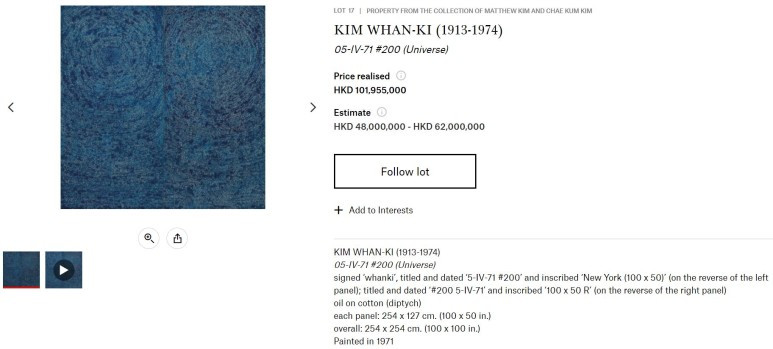 2019년 크리스티 홍콩 경매에는 김환기 화백의 또 다른 전면 점화 작품이 출품되어 큰 반향을 일으켰죠. 구매 수수료 불포함 약 131억 8천750만 원(8천800만 홍콩달러)에 낙찰되면서 세계 시장에서 거래된 첫 100억 원대 한국미술작품이 되었거든요. 당시 출품된 작품 < '우주'(Universe 5-IV-71 #200)>는 그의 추상화 작품 중 유일한 두 폭 구성으로 예전 김환기 특별전에 전시되었을 때 관람객이 가장 좋아하는 작품으로 뽑히기도 했고 우리나라 근현대미술 경매가 top 10 중에서도 top of top을 차지합니다.