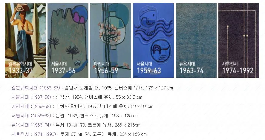 그의 화풍은 시기에 따라 가시적인 변화를 보여주는데 고향의 색과 닮은 블루톤, 매화, 산, 강, 백자 등이 주요 화제였죠. 시기별 대표 작품을 환기미술관 홈페이지에서는 아래와 같이 정리하고 있는데 작품을 볼 때 작품 속 소재와 구성 방식 그리고 제목에 유념해서 보면 그 차이가 더 두드러집니다. (작가 상세 설명은 별도로 검색해보세요~)