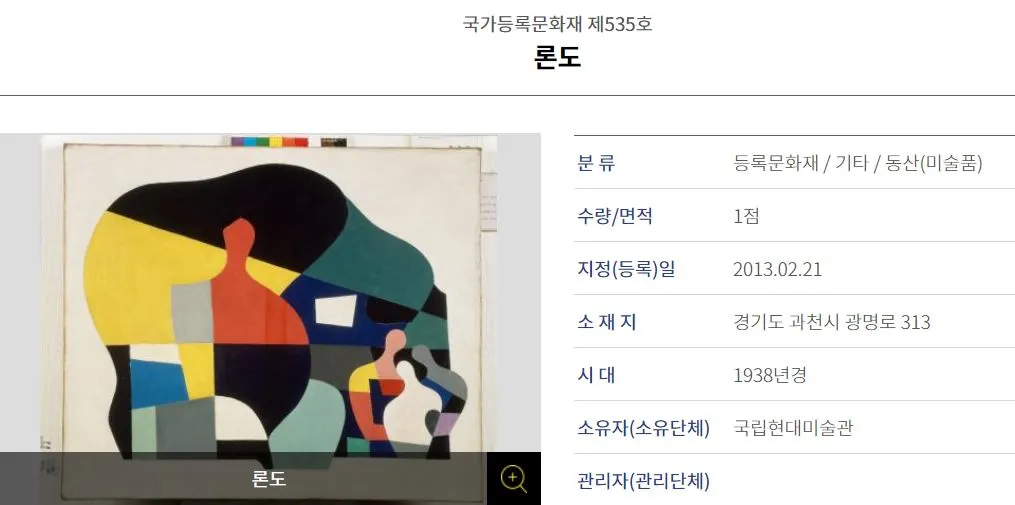 일제강점기와 6.25를 연이어 겪은 우리 화단엔 근대 회화의 경향을 이해할 만한 작품이 생각만큼 다양하게 남아 있진 않습니다. 그중 김환기 화백의 <론도>(1938)는 등록문화재로 지정(2013년) 될 만큼 당시 서울 화단에서 보기 힘들었던 비대칭의 선구적 추상회화로, 문화재청에서는 등록문화재 선정 이유를 아래와 같이 설명하고 있어요.