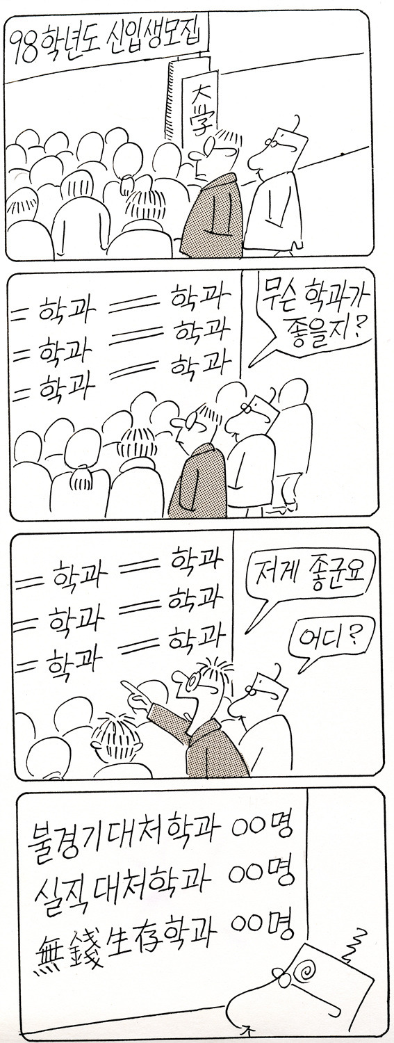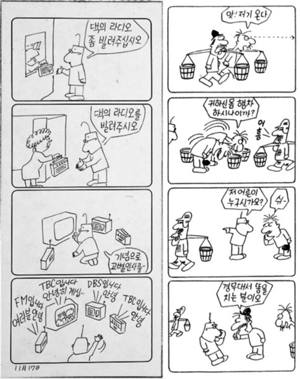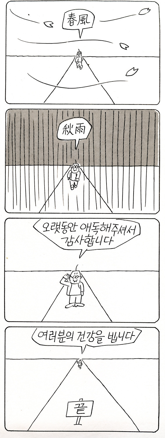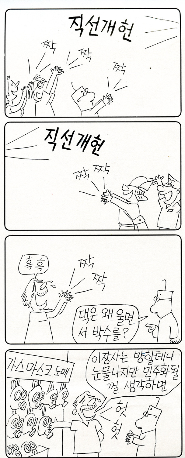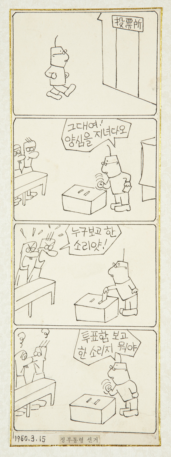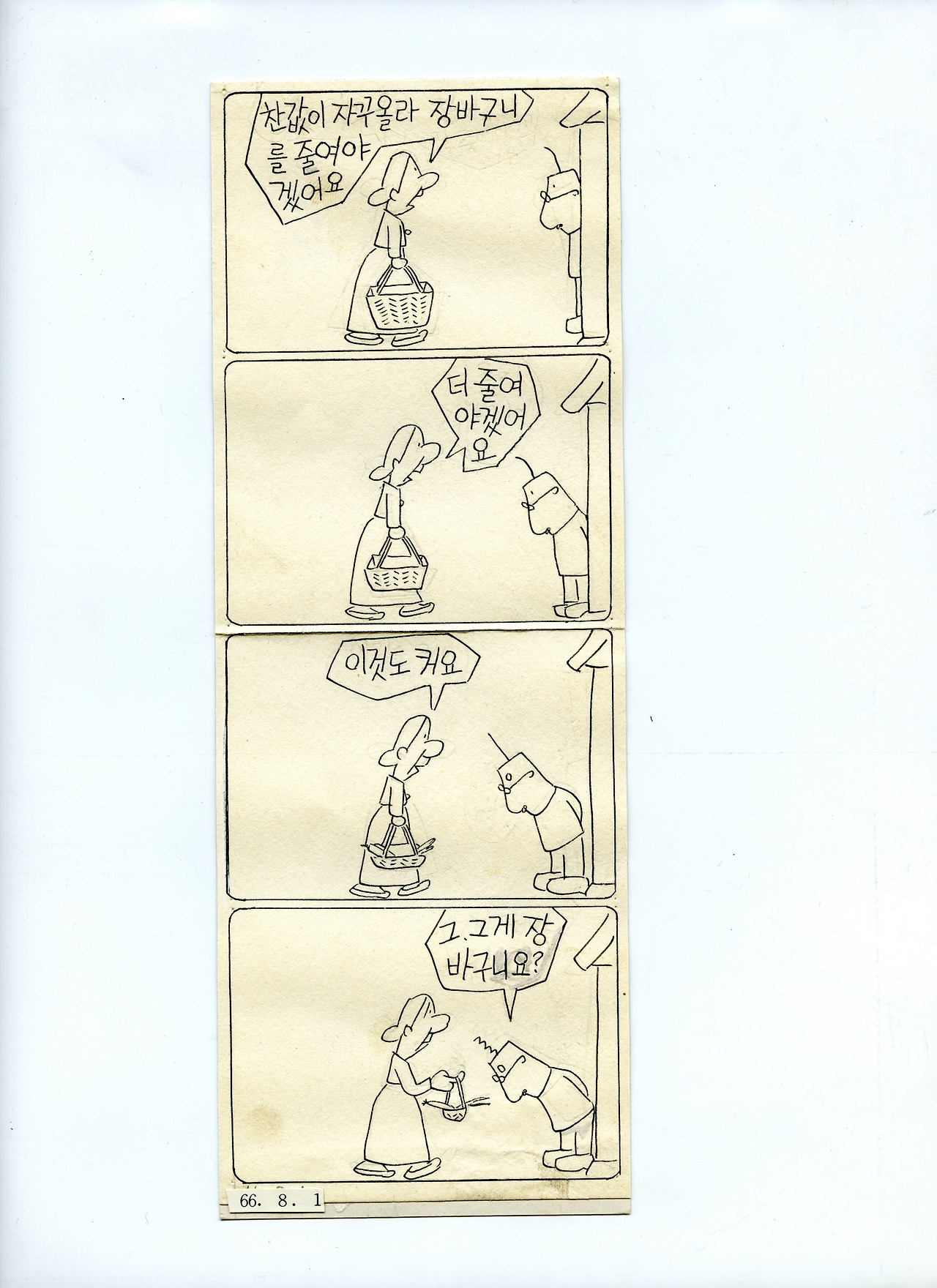 네 컷 만화 속 <고바우 영감>은 마치 뉴스의 한 줄 헤드라인 기사처럼 우리 일상과 직결된 현대사의 이슈들을 간결히 기록했고, 국민을 대변했고, 대중들에게 전달했죠. 간략한 필선으로 묘사된 너무 보통의 인물들은 4칸의 제약을 넘어서며 더 강렬하고 직관적으로 메시지를 전달해서, 어떨 땐 실소가 나기도, 애처롭기도, 화를 내기도 하면서 그 캐릭터의 시대를 같이 걷게 되더라고요. 여러 에피소드가 많지만 1958년 경무대(현 청와대)의 절대 권력을 비판했다가 만화임에도 허위 보도 유죄 선고를 받은 ‘경무대 똥통 사건’은 유명한 일화입니다. 풍자만화로 정권 비판을 했다가 사법처리로 이어진 만화가 최초의 사례이기도 하죠.