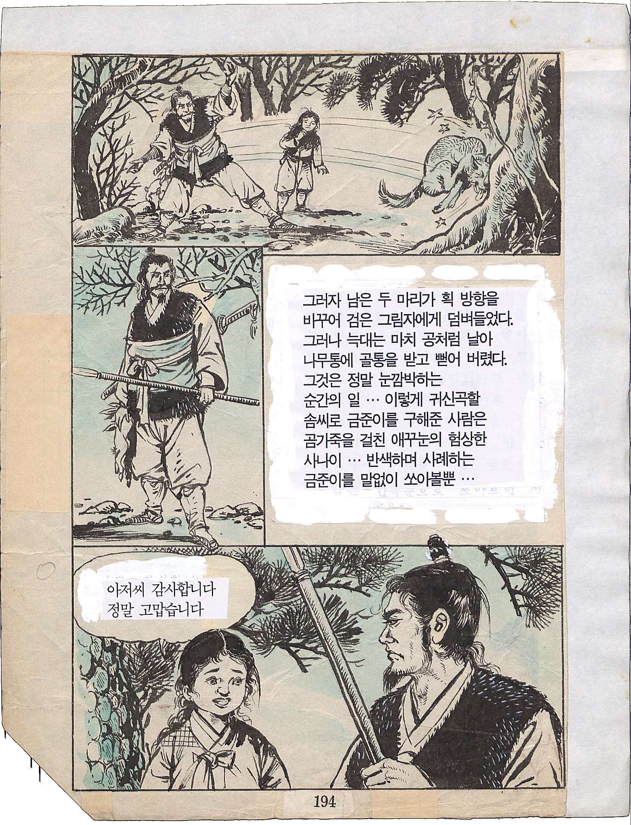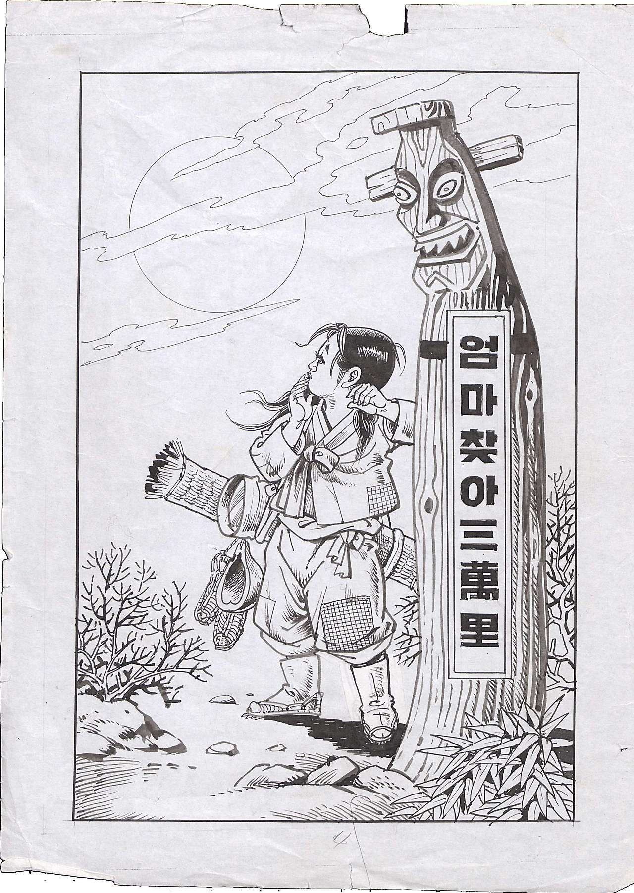 등록문화재 제539호인 김종래(1927-2001) 작가의 『엄마 찾아 삼만리』는 당시 한국 최초 만화 베스트셀러로 불립니다. 일본에서 미술 학교를 졸업하고 해방 직후 귀국해 육군에 재직하며 1954년 <붉은 땅>으로 데뷔한 김종래 작가는 연기자 박원숙의 아버지인 만화가 박광현(1928-1978)의 삽화체 그림을 따랐다고 하죠. 남성적 만화를 추구하던 그는 1958년 8월 스타일을 완전히 바꾼 시대극 『엄마 찾아 삼만리』 상권(192쪽)을 세계문화사에서 발표합니다. 술과 노름에 빠진 어린 금준의 아버지는 돈 삼백 냥에 아내를 파는데요, 부산의 중국인 부호에게 팔려간 엄마를 찾아 금준이 보따리를 짊어지고 전국을 떠도는 이야기로, 그 과정에서 만나게 되는 인간 군상을 통해 성장한 금준이 결국에는 어머니를 찾아 효를 다하고 그들을 괴롭혔던 사람들을 응징한다는 권선징악적 주제의 이야기입니다. 6.25 전쟁으로 인해 피폐했던 당시 사회와 부패를 조선시대를 배경으로 빗대어 고발하고 있는 이 작품은 만화 역사상 처음으로 10쇄까지(1964년까지) 출간되며 엄청난 인기를 구가합니다.