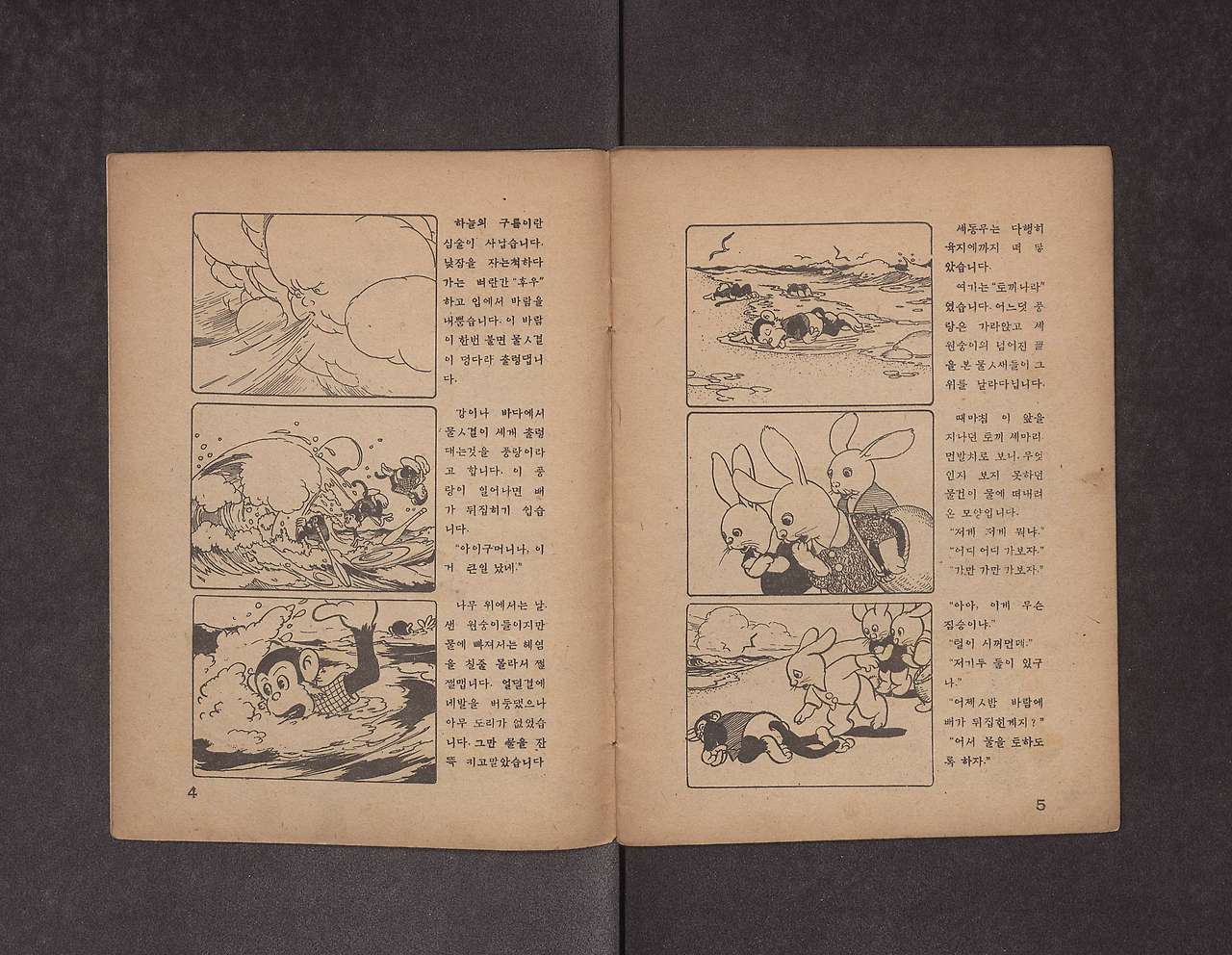 '고바우 영감 원화'는 2013년 2월에 한국 (현존하는) 최초 단행본 만화인 김용환 (1912-1998) 화백(이하 작가)의 『토끼와 원숭이』(1946년), 한국 최초 순정 만화 성공작으로 꼽히는 김종래(1927-2001) 화백(이하 작가)의 『엄마 찾아 삼만리』 원화와 함께 만화 최초 등록문화재로 지정됩니다. 아동문학가 마해송(1905-1966)의 원작을 만화로 옮긴 『토끼와 원숭이』(등록문화재 제537호)는 1946년 5월 1일에 조선 아동문화 협회를 통해 34장의 지면으로 간행됩니다. 한국만화영상진흥원이 2012년 5월 경매를 통해 구입한 이 작품은 당시 인기 연재만화 캐릭터인 '코주부(KOCHUBU)'의 작가 김용환의 작품으로 주목을 받았죠. 당대 만화가들의 스승이라 불리던 인물로, 그가 그린 만화들은 해방 후 만화가들의 교과서로 통했다고 합니다. 토끼와 원숭이 등을 의인화하여 일제가 벌인 부당한 침략행위와 식민통치를 고발하고 자주독립국가에 대한 염원을 그린 이 만화는 원작 역시 아동을 위한 이야기라고 하기에는 섬뜩할 정도의 상황 묘사와 국제정세에 대한 날카로운 예언이 담긴 우화로 쓰여, 총독부에 의해 동화의 연재가 중단될 정도였다고 해요. 결국 마해송은 이 작품을 해방 이후에야 완성을 하죠.