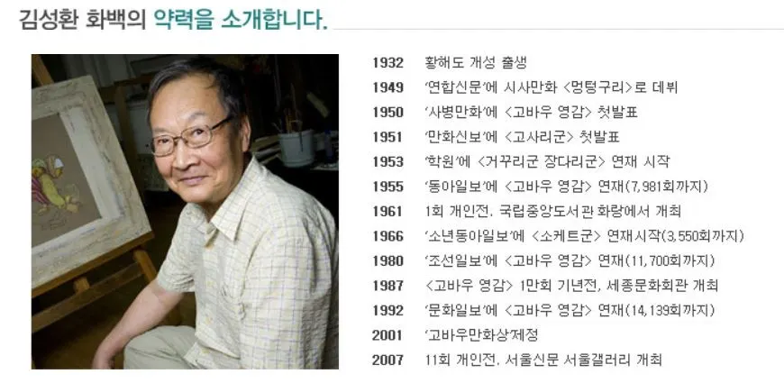 2019년에 접한 김성환(1932-2019) 화백(이하 작가)의 별세 소식은 잊고 있던 한 캐릭터를 생각나게 했어요. 1932년 황해도 개성 태생으로 해방과 함께 서울로 내려온 그는, 투고한 <멍텅구리>가 연합신문에 실리면서 전속작가 겸 만화가로 데뷔합니다. 6.25(한국전쟁) 때 다락방에 숨어 살면서 100여 명이 넘는 만화 주인공들을 구상하게 되는데 이 과정에서 만들어진 캐릭터가 바로 '고바우 영감‘이죠.