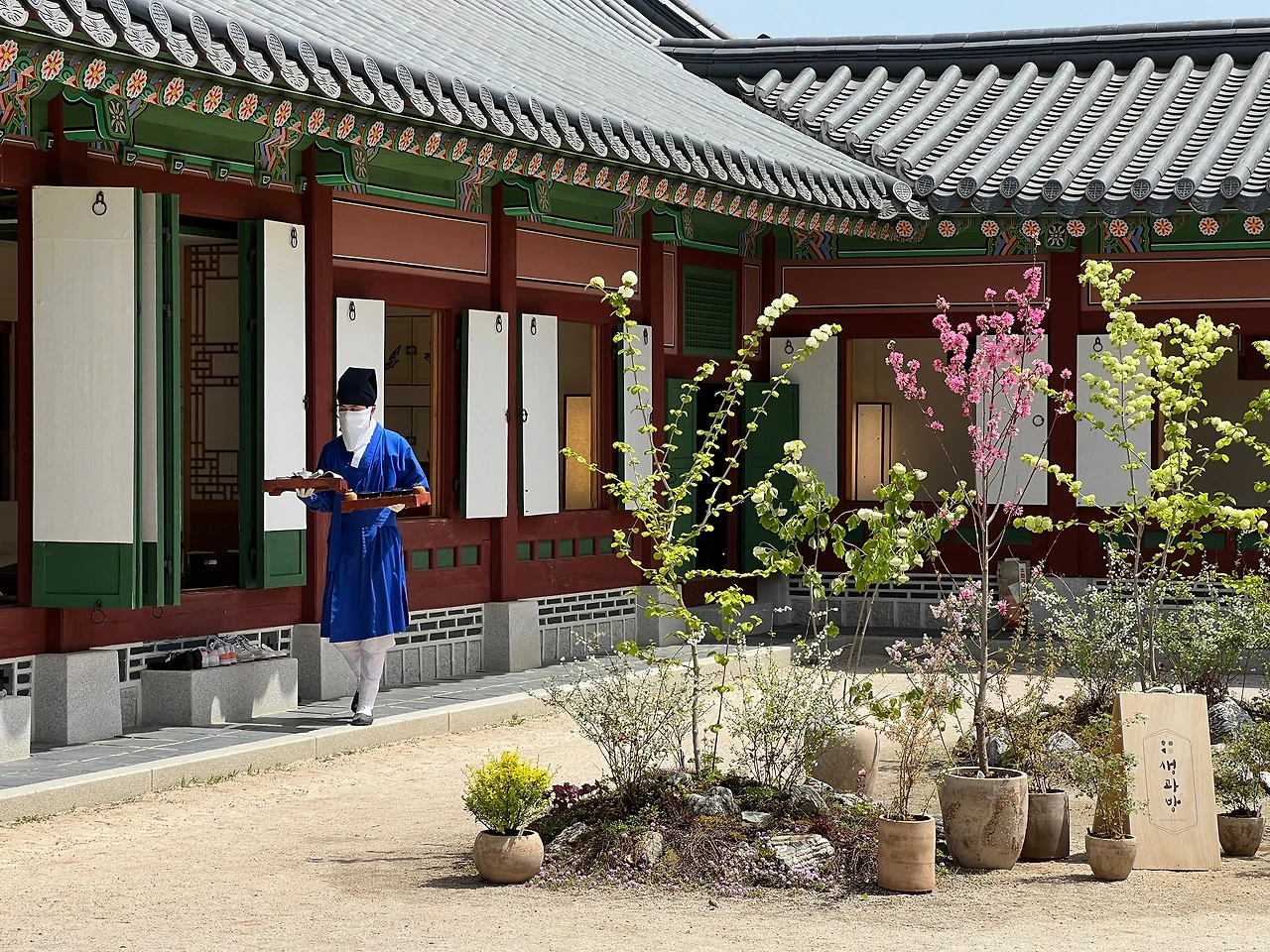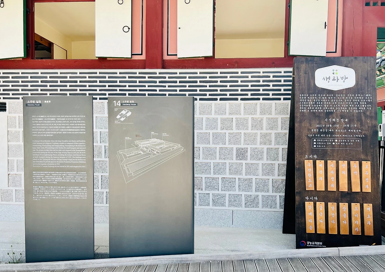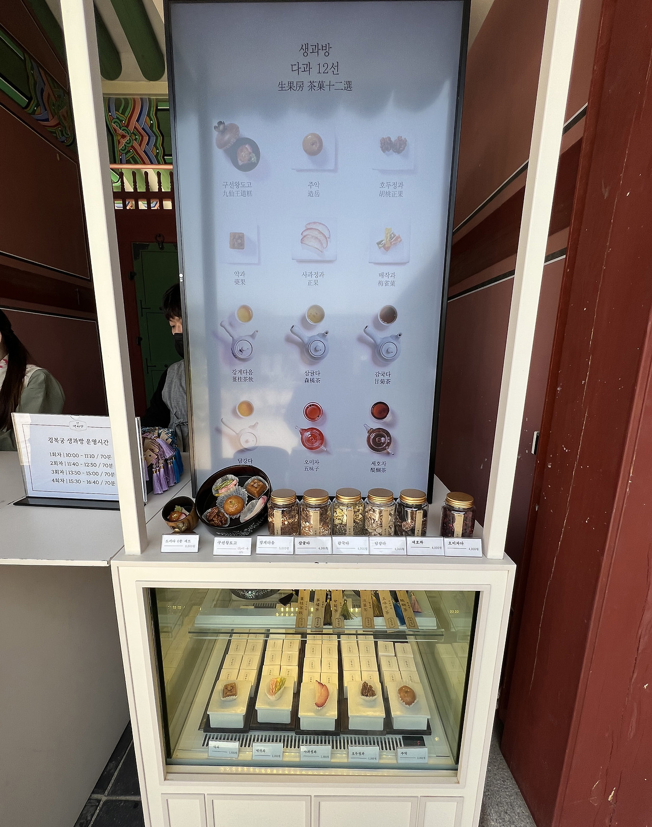 생과방 체험은 온라인 접수 후 예약시간에 맞춰 생과방 ‘호궤소’ 방문, 궁중병과 및 약차 선택 및 결제 후 좌석 배정의 순서로 진행됩니다. 이 모든 과정은 생과방 내 전통 복장을 한 직원의 안내에 따르면 됩니다. 가격도 부담 없어요. 예약비는 무료이고 자신이 먹거나 마실 것만큼만 지불하면 됩니다. 전통차는 4000~5000원 선이고, 후식은 1000원부터 3000원으로 원하는 만큼 주문해서 주어진 자리에서 70분 동안 천천히 즐기면 되는데, 저는 친구와 생강·계피·귤피·대추로 만든 강계다음차와 인삼·귤피·대추로 만든 제호차 그리고 찹쌀가루로 만들어진 주악과 일반 한방 약재를 이용해 만든 떡인 구선왕도고를 주문했고, 1시간 정도 여유롭게 이야기하며 좋은 시간 갖다가 다음 분들을 위해 자리를 비웠어요. 분위기 좋은 국악이 배경음악으로 깔리고 눈앞엔 개별 다과상이, 또 외부엔 조선시대 분위기를 물씬 풍겨 그야말로 신선놀음이란 생각이 저절로 들죠. 따뜻한 차를 마실 경우 뜨거운 물을 더 얻어 한 번 더 우려 마셔도 되고요. 요즘엔 갓과 도포를 쓴 남성 체험객들도 많아져서, 다음에는 저도 한복을 제대로 갖춰 입고 와서 '공간 안에 제대로 스며들어봐야겠다.' 하는 욕심도 생겼습니다.