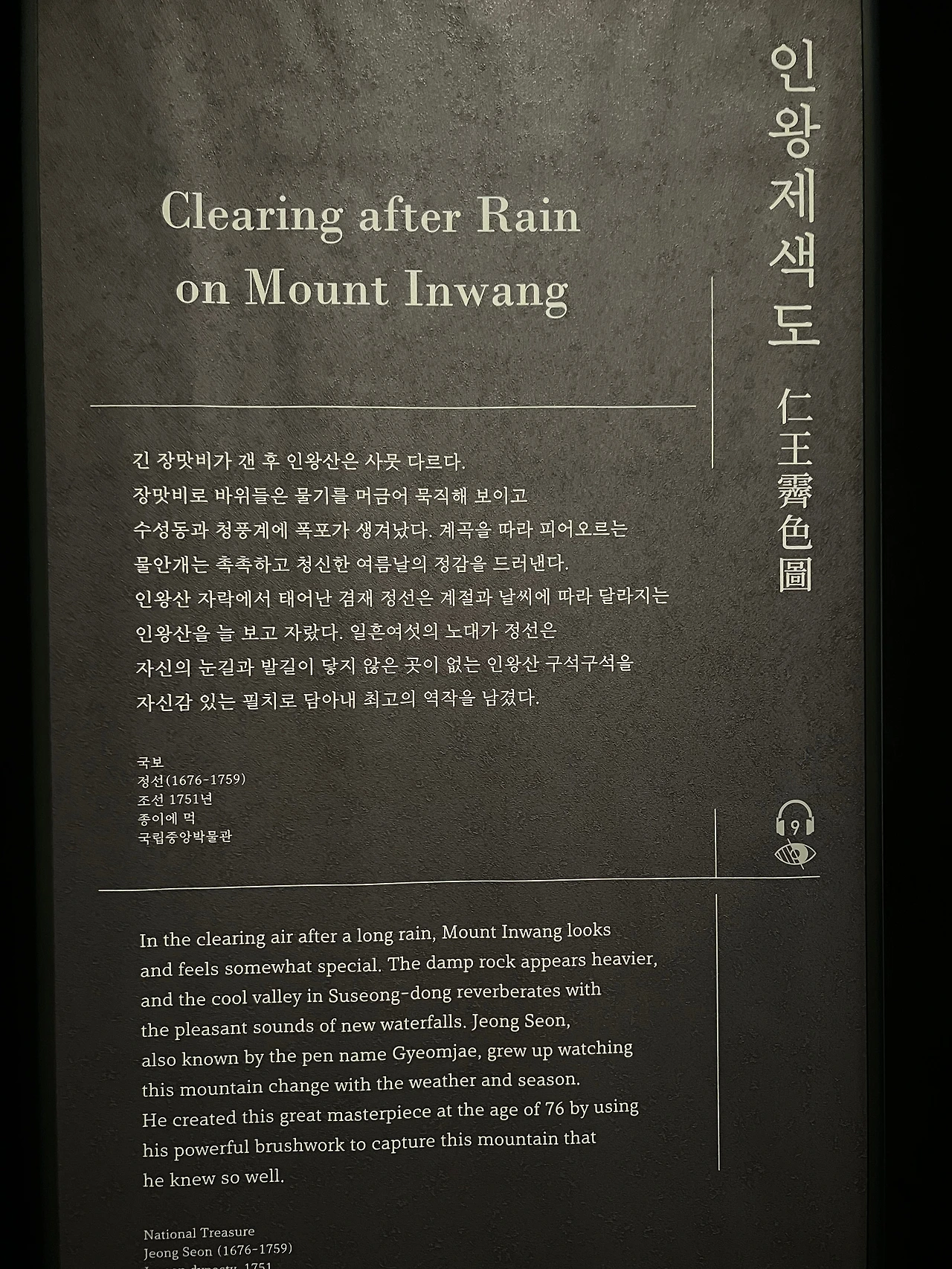 <인왕제색도>는 한여름 소나기가 지나간 뒤 삼청(三淸), 청운(淸雲), 궁정동(宮井洞) 방향에서 바라본 인왕산의 모습을 그린 진경산수로, 산의 절반을 가려주는 안개와 습윤한 바위 표현이 압권이죠. 1984년에 국보로 지정된 작품으로, 문화재청 공식 명칭은 '정선 필 인왕제색도'입니다. 예전에 국립중앙박물관에서 실시한 초분광 분석과 적외선 촬영을 통해 그림의 푸르스름한 빛깔은 먹으로만 표현한 것이며 밑그림 없이 단번에 그린 작품이란 것이 밝혀지기도 했죠. 처음 본 작품은 아니었는데, 워낙 오랜만에 본 것도 있고, 곧 교체된다고 하니 더 자세히, 오래 보게 되더라고요, 구석구석. 올해 초 호랑이해를 맞아 인왕산에도 여러 번 올랐는데 그래서 그런지 실경과 자꾸 비교하며 보게 되고요. 게다가 요즘 핫플로 변한 청와대 주변을 거닐다 보면 그림 속 실재의 풍경을 비슷한 각도에서 보게 되어 더 각인이 되었는데, 아직까지 비 갠 뒤 인왕산의 모습을 본 적은 없어서 올 장마철을 기다리는 중입니다. 지금도 안개가 저런 풍경을 만들어 낼 수 있는지 확인해 보고 싶어서요 ㅎㅎ.