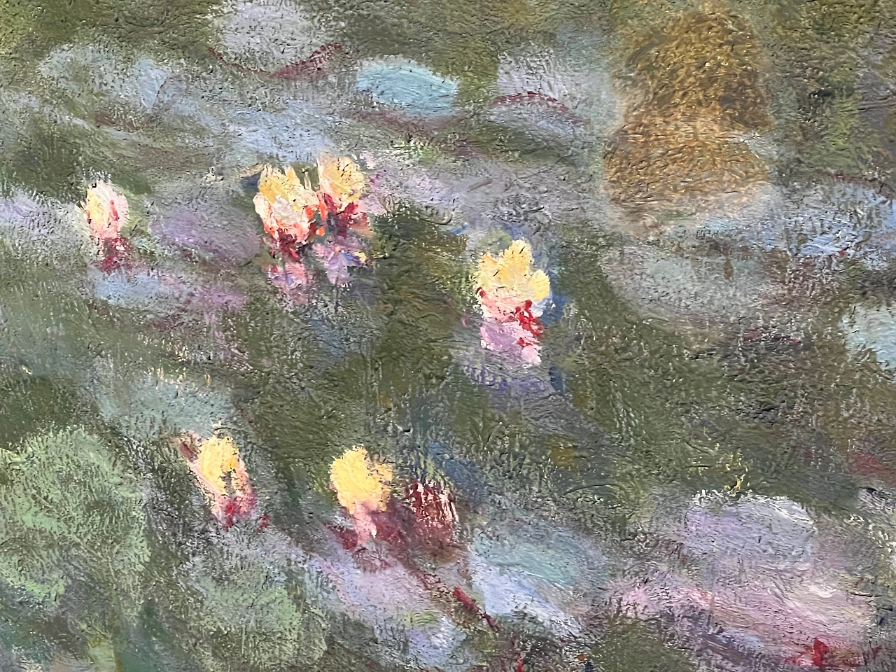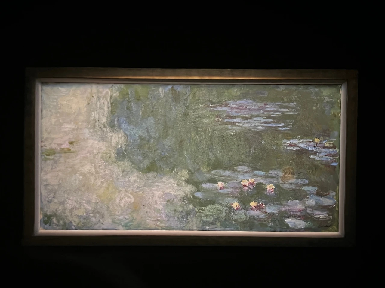 국내 첫 전시 출품으로, 다른 전시 작품들과 분리되어 단독 공간에 놓여있습니다. 이 작품 앞에는 수련을 빙 둘러싼 관람객들이 있고요. 다른 작품에 비해 대부분 오랫동안 서 계시더라고요. 100.0 ×200.5cm로 크기가 작진 않은데, 단 한 점이 아닌 수련 연작 전시에 익숙해서 그런지, 색과 구성이 다른 연작들에 비해 좀 밋밋해서 그런지, 검은색으로 마감된 벽 때문인지, 확 와닿지는 않더라고요 작품의 존재감이. 게다가 가까이에서 좀 찬찬히 보고 싶은데, 너무 많은 분들이 계시다 보니 그 근처에서 어떤 움직임을 더한다는 게 살짝 부담스러운 공간이라 저는 그렇게 오래 머물지는 않았습니다.