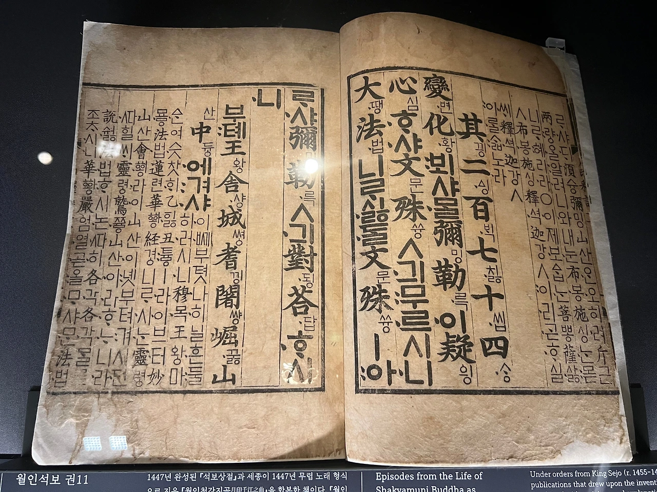 2부 세 번째 소주제 ‘생각을 전달하는 지혜’에서는 종교적 깨달음과 지식이 담긴 불교미술과 전적류를 전시합니다. 대표 유물 격인 고려불화는 4-6월까지는 <수월관음도(水月觀音圖)>(고려 14세기)가, 7·8월은 <천수관음 보살도(千手觀音菩薩圖)>(고려 14세기, 보물)로 교체 전시됩니다. “기록 문화가 자리를 잡지 못한다면 앞으로의 정보화 사회에서 경쟁력을 갖추기 더욱 힘들다”라는 사명감으로 『초조본 현양성교론(初雕本顯揚聖敎論)』(고려 11세기, 국보), 금속활자로 인쇄한 초간본 『석보상절(釋譜詳節) 권 20』(조선 1447~1449) 등을 수집했다는데, 그 귀중한 옛 책도 전시 중입니다.