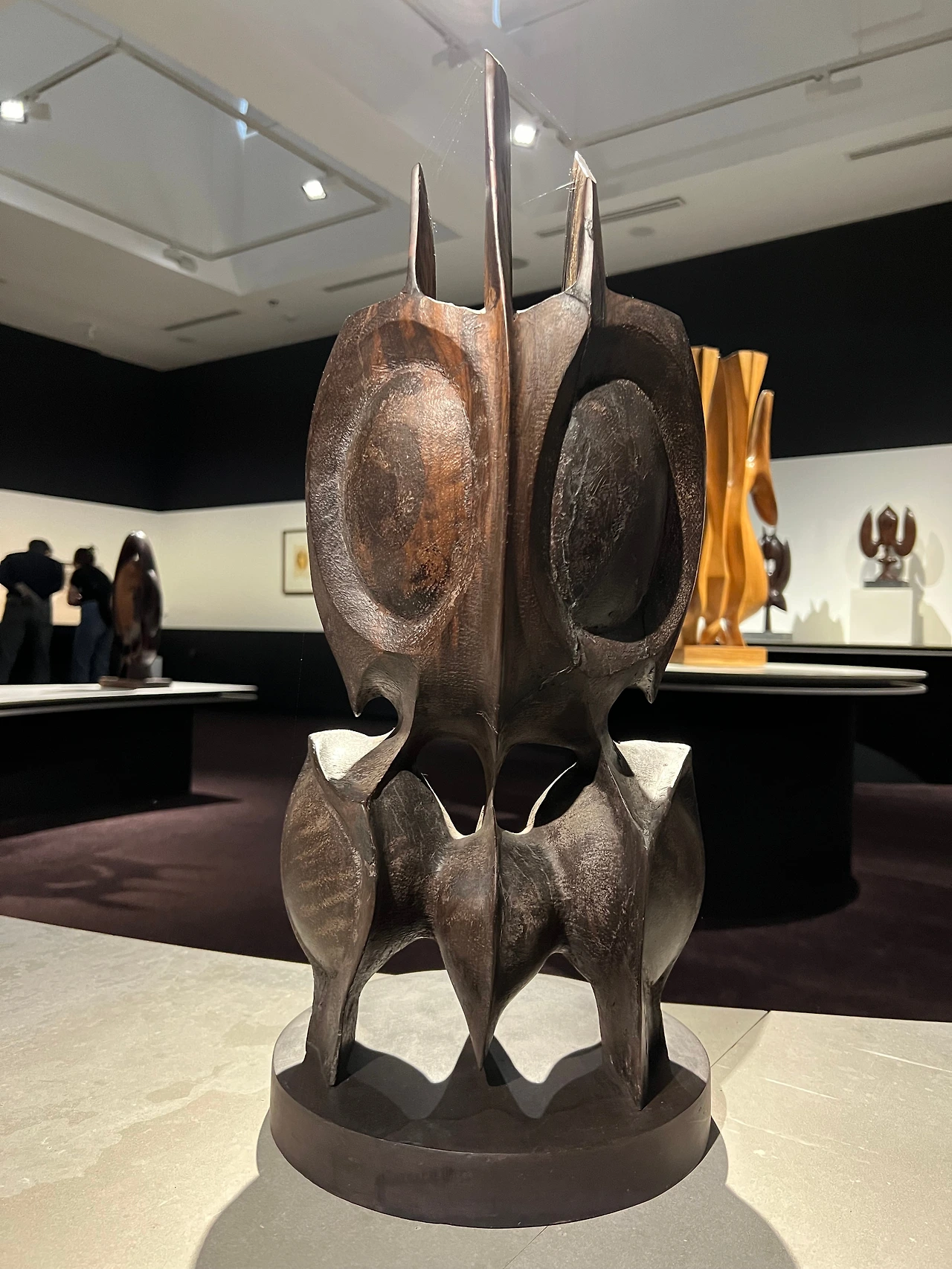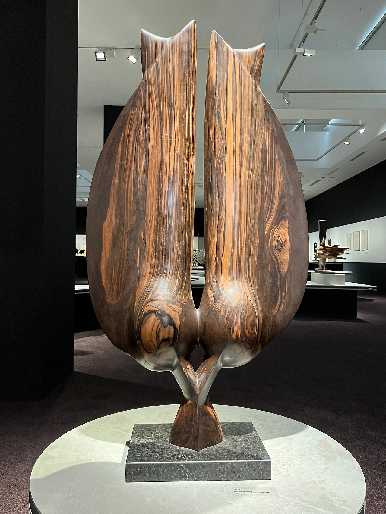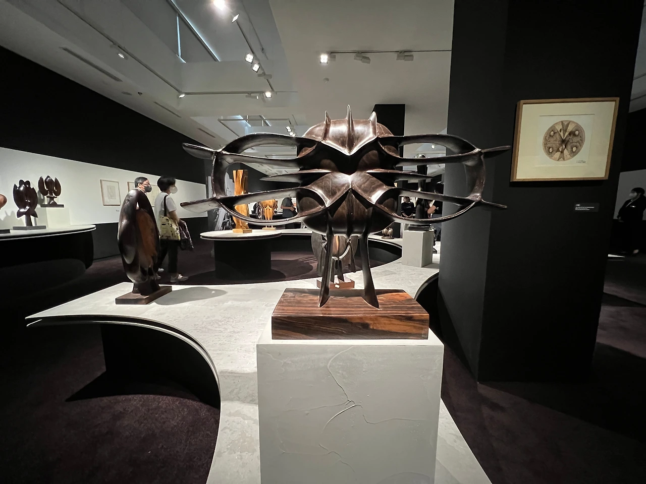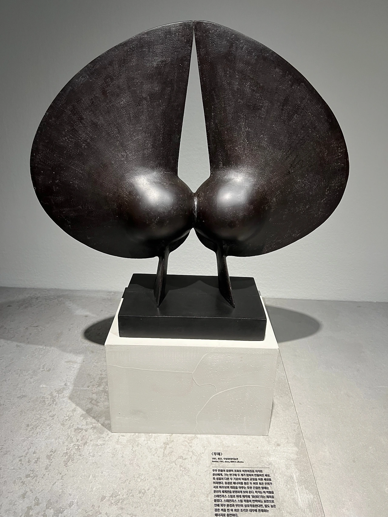 그는 같은 형태의 조각을 다양한 재료를 사용해서 다른 크기로 재제작했는데, 브론즈 제작을 위해 새로운 형태를 고안하기보다 대개 나무나 석고 작품의 형태를 살리고 크기를 다양하게 변화시켰다고 해요. 어떤 재료를 사용하든지 표면을 매끄럽게 연마해 형태가 눈에 잘 들어오게 했고요. 대칭성이 그의 작품에서 보이는 큰 특징이긴 하지만 예외 없이 다 그런 것은 아니었고, 다른 형태, 앞면과 뒷면의 표현이 다른 작품들도 많으니 모든 각도에서 작품을 보셔야 합니다. 이 전시실 대표작으로 꼽히는 <개미(라 후루미)>(1985), <우주를 향하여 3>(1989) , <무제>(1990, 숙대 소장) 도 놓치지 마시고요.