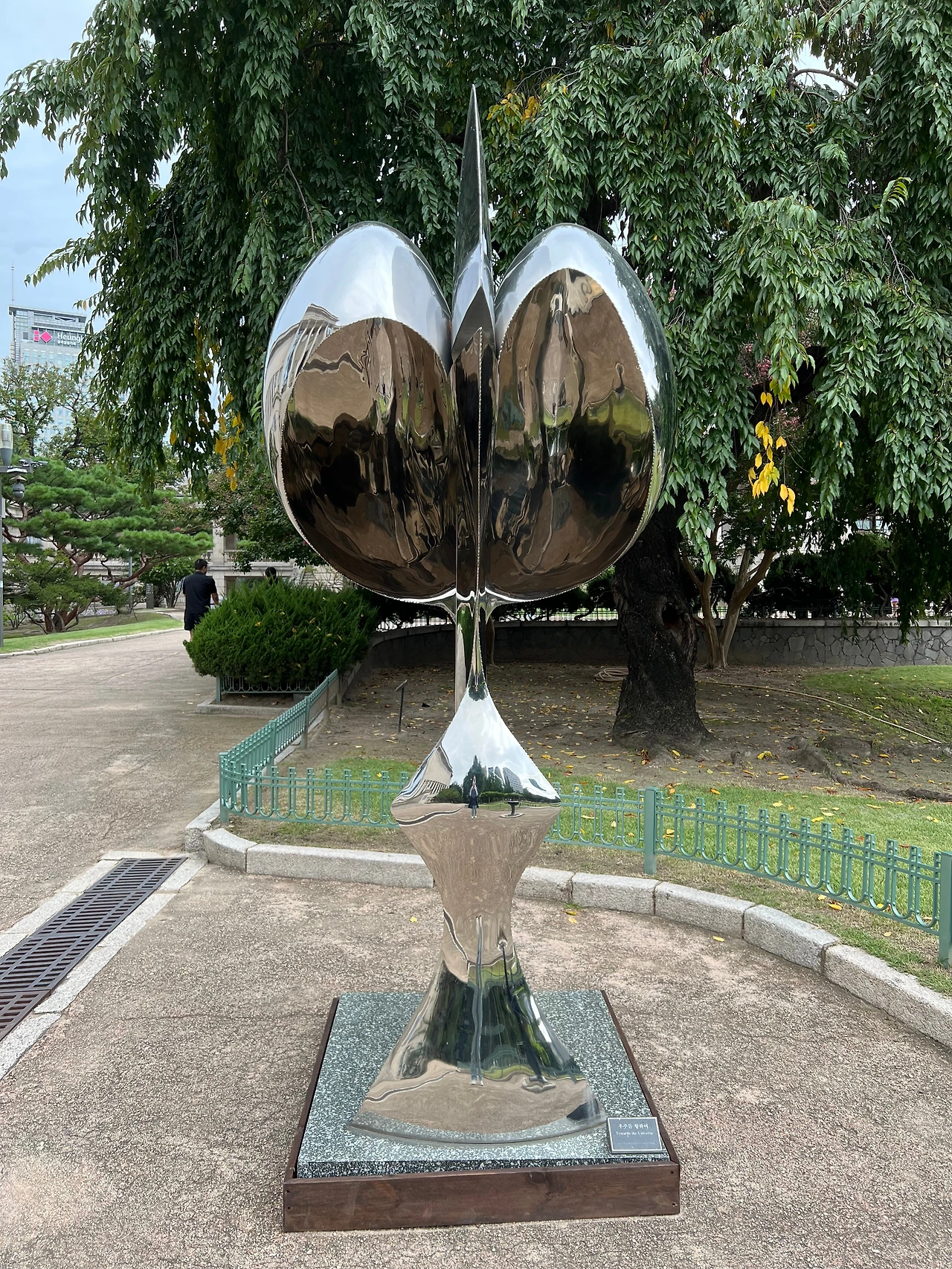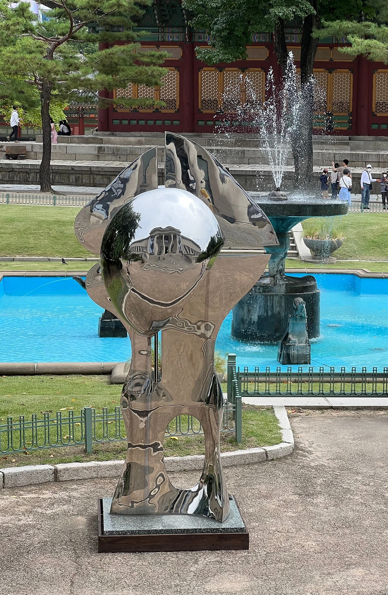 1980년 그가 영구 귀국했을 무렵 한국은, 아시안게임과 올림픽을 앞두고 도시 미관과 환경에 대한 관심이 고조되고 있었습니다. 1950-60년대 한창 제작되던 기념 동상과 다른 종류의 야외 조형물이 조성되기 시작했고, 문신 역시 스테인리스 스틸로 올림픽 기념 작품을 제작했는데, 당시 국내 브론즈 주조 기술의 미흡함을 보완하고자 택했던 재료였지만, 소재가 주는 현대성과 표면에 반사되는 빛과 주변 풍경의 반영을 통해 이 작품은 더 특별해집니다. 이 전시실에는 또 다른 <우주를 향하여 >(1985)가 있는데, 작가는 이 작품과 같은 형태를 1972년 파리 생토 오귀스탱(St.Augustin) 지하철역에서 열린 《살롱 드 마르스》에 <태양의 사자>라는 제목의 대형 석고 조각으로 출품했다고 합니다. 1985년 국립현대미술관이 개최한 《현대미술 초대전》에 출품되었던 작품으로 37년 만에 같은 장소(덕수궁)에 전시되었다는 의미가 있기도 하고요.