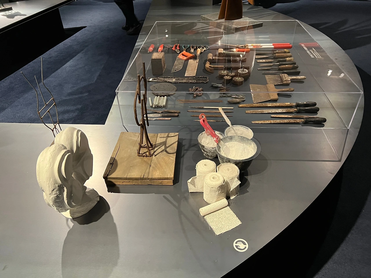 3부 '생각하는 손: 장인 정신'에서는 브론즈 조각 작품을 볼 수 있습니다. 그의 브론즈 작품은 점토로 형태를 만드는 과정을 생략하고 직접 제작했는데, 그는 점토로 형태를 빚는 과정이 작품을 세밀하고 날렵하게 만드는데 불필요하다고 여겼고 석고를 보다 견고히 만들기 위해 철근으로 뼈대를 잡은 후 철망 등을 이용해 대강의 형태를 만들었고 여기에 석고를 붙여가며 형태를 만들어냈다고 해요. 3부 전시실에 놓인 도구와 모형을 통해 이 과정을 유추해 볼 수 있습니다.
