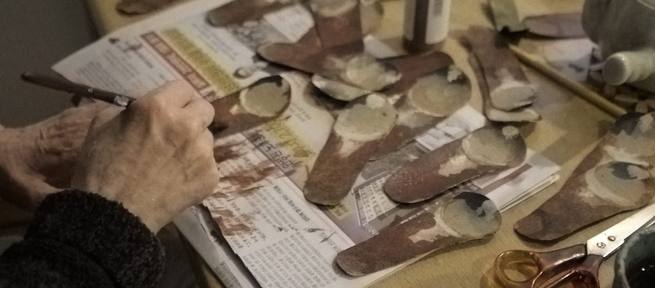 보통은 스무 가지 색면의 층을 축적해서 두껍게 쌓인 표면을 끌칼로 깎아 내면,