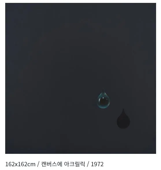 경제적으로 넉넉하지 않던 그는, 당시 캔버스를 재활용하기 위해 뒷면에 물을 뿌려 물감이 떨어지기 쉽도록 했는데, 이 과정에서 화폭에 맺혀 아침 햇살을 받으며 영롱하게 빛을 발하는 ‘물방울’의 아름다움을 발견했다고 해요. 이때부터 작품의 주요 모티프로 물방울이 등장합니다. 1972년 프랑스 파리에서 열린 살롱전 '살롱 드 메'에서 ‘물방울 회화’ '밤의 행사(Event of Night)'(1972)를 공개했고, 1973년 놀 인터내셔널 프랑스에서 물방울 회화만을 모은 첫 프랑스 개인전을 개최, '물방울 화가'로 명성을 얻습니다. 그로부터 50년간, 변함없이 물방울을 소재로 그림을 그렸죠.