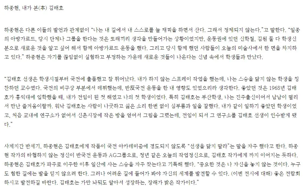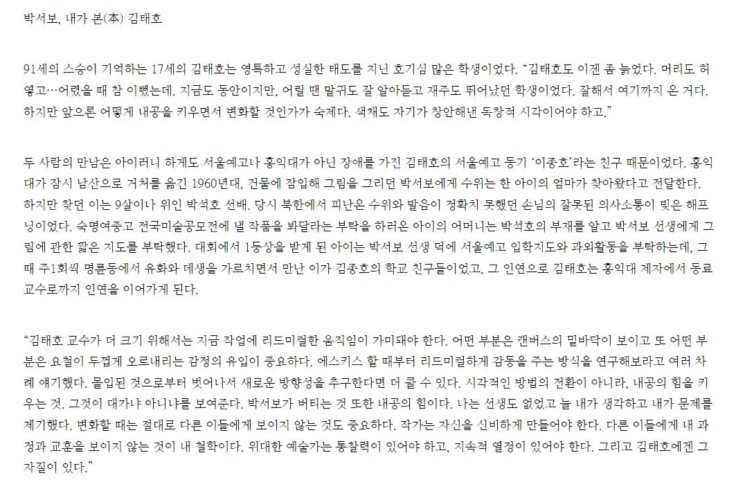 부산 출신인 그는 1972년 홍익대 서양학과를 졸업하고 1984년 동 대학교 교육대학원에서 미술교육 석사를 취득, 1987년부터 2016년까지 모교에서 학생을 가르쳤어요. 1960년대 후반부터 1970년대 후반까지 국전에 다수 참가하여 입선했고, 국립현대미술관 한국미술대상전에서 1976년에는 특별상을 1980년에는 최우수 프런티어상을 수상하기도 했죠. 이후 경기 파주에서 김태호 조형연구소를 운영했고, 지난해까지 45차례에 걸친 개인전과 해외의 다양한 아트 페어에 참여하는 등 전 세계를 무대로 활발한 작품 활동을 펼쳐왔는데, 그래서 그런지 이 소식이 더 급작스럽게 느껴지긴 했어요. 단색화 1세대인 박서보, 하종현 등에게 사사해 이들과의 인연도 깊다 보니, 그들의 SNS에서도 애도의 글은 쉽게 찾을 수 있습니다. 그 글과 함께 저 역시 다시 한번 애도의 마음을 표합니다.