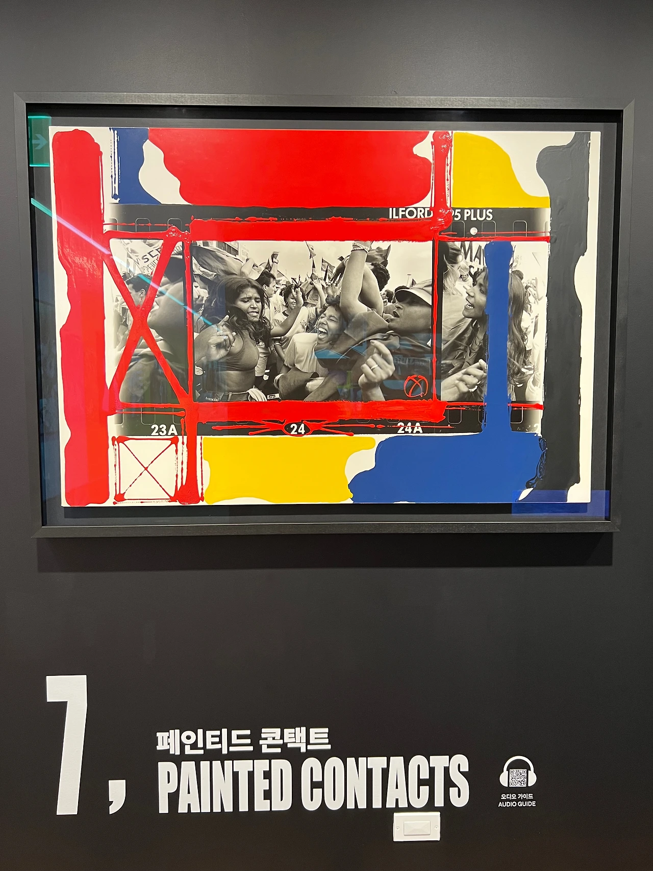 전시는 1950년대 초반부터 1990년대까지의 회화, 디자인, 사진, 패션, 영화, 책 등 작품 130여 점과 자료 40여 점을 총 8개의 섹션으로 나눠 전방위 예술가인 클라인의 면모를 잘 볼 수 있게 구성했습니다. 1950년대 초기 회화부터 회화와 사진, 그래픽 디자인의 영역을 교차시킨 포토그램인 '황홀한 추상', 야외에서 카메라로 촬영한 첫 사진작업인 ‘흑백의 몬드리안’, 현대사진의 도화선이 된 ‘뉴욕’과 도시 거리사진과 사진집 섹션인 ‘도시의 사진집’, 1960년대 문자와 추상을 결합한 ‘레트리즘 회화’, 1955년 『보그』와의 협업으로 시작한 ‘패션’ 사진, 1990년대 밀착 프린트 위에 색을 칠한 ‘페인티드 콘택트’, 다큐멘터리 영화와 장편 극영화(일부 상영)를 살펴볼 수 있는 ‘영화’까지, 각 섹션에 속한 작품들은 뚜렷하게 구분되며 그의 작업 세계 전반을 보여주고 있죠. 1층에서 시작해 지하 1층까지 오디오 가이드를 들으며 관람할 수 있으니 참고하세요.