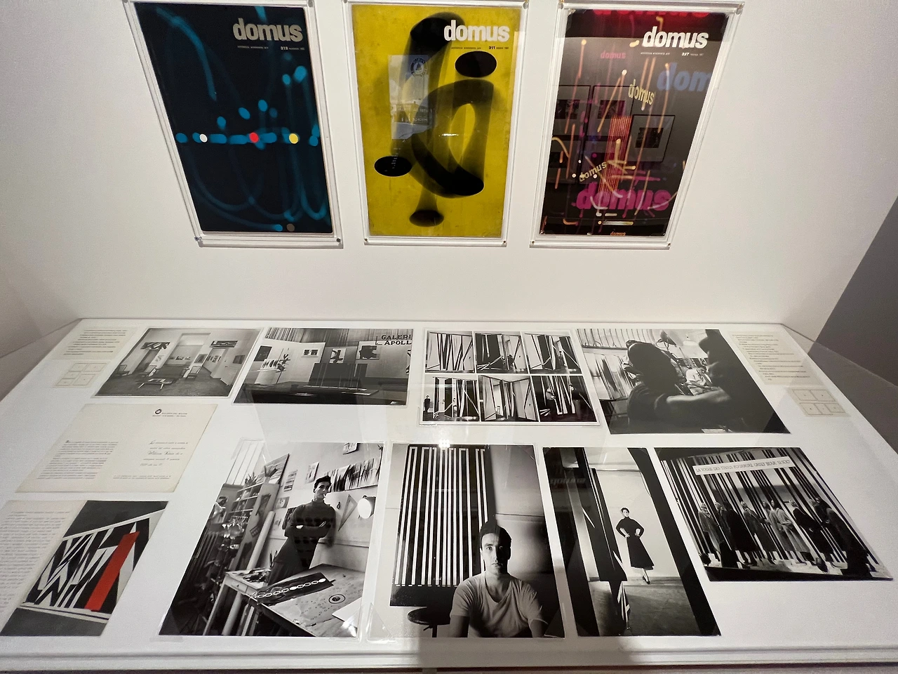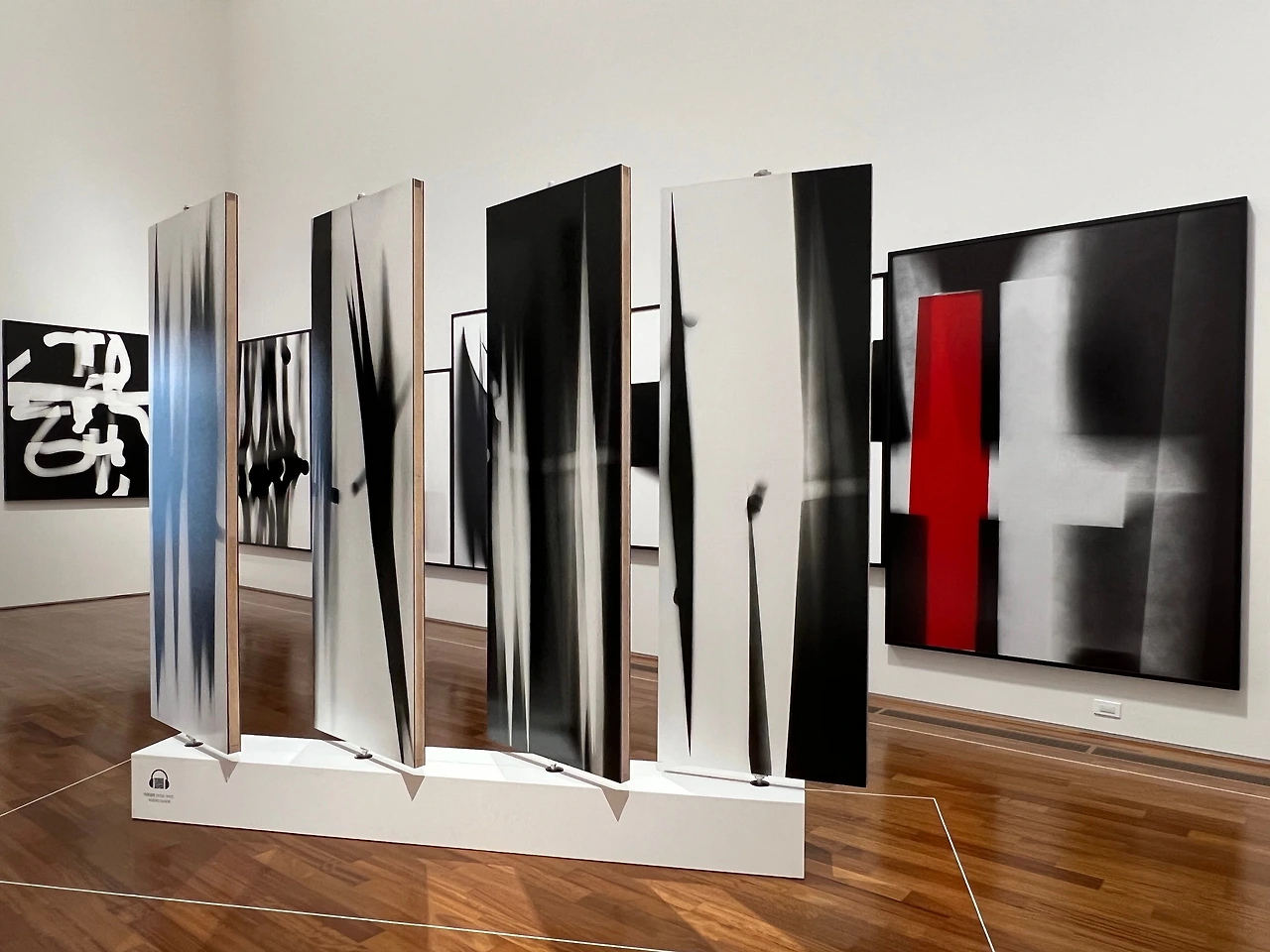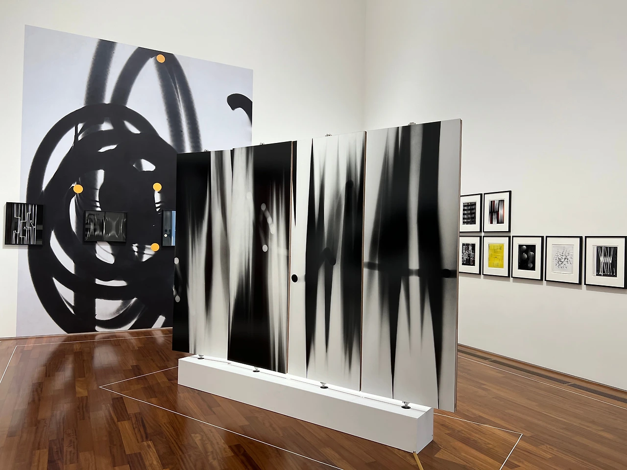 1950년에는 페르낭 레제의 아틀리에에서 잠시 일하기도 했고요. 또, 밀라노 전시를 하며 만난 이탈리아 건축가들과 협업하면서 대형 작품을 만들었는데, 그중 하나가 흑백으로 칠한 패널을 조립한 회전식 칸막이였다고 해요. 전시장에 들어서면 눈에 먼저 들어오는 설치작 <Moing Diamomds on Turning Penels>이 1952년 작품을 2023년에 복제한 작품(replica)입니다. 모터가 장착되어 패널이 움직여요.