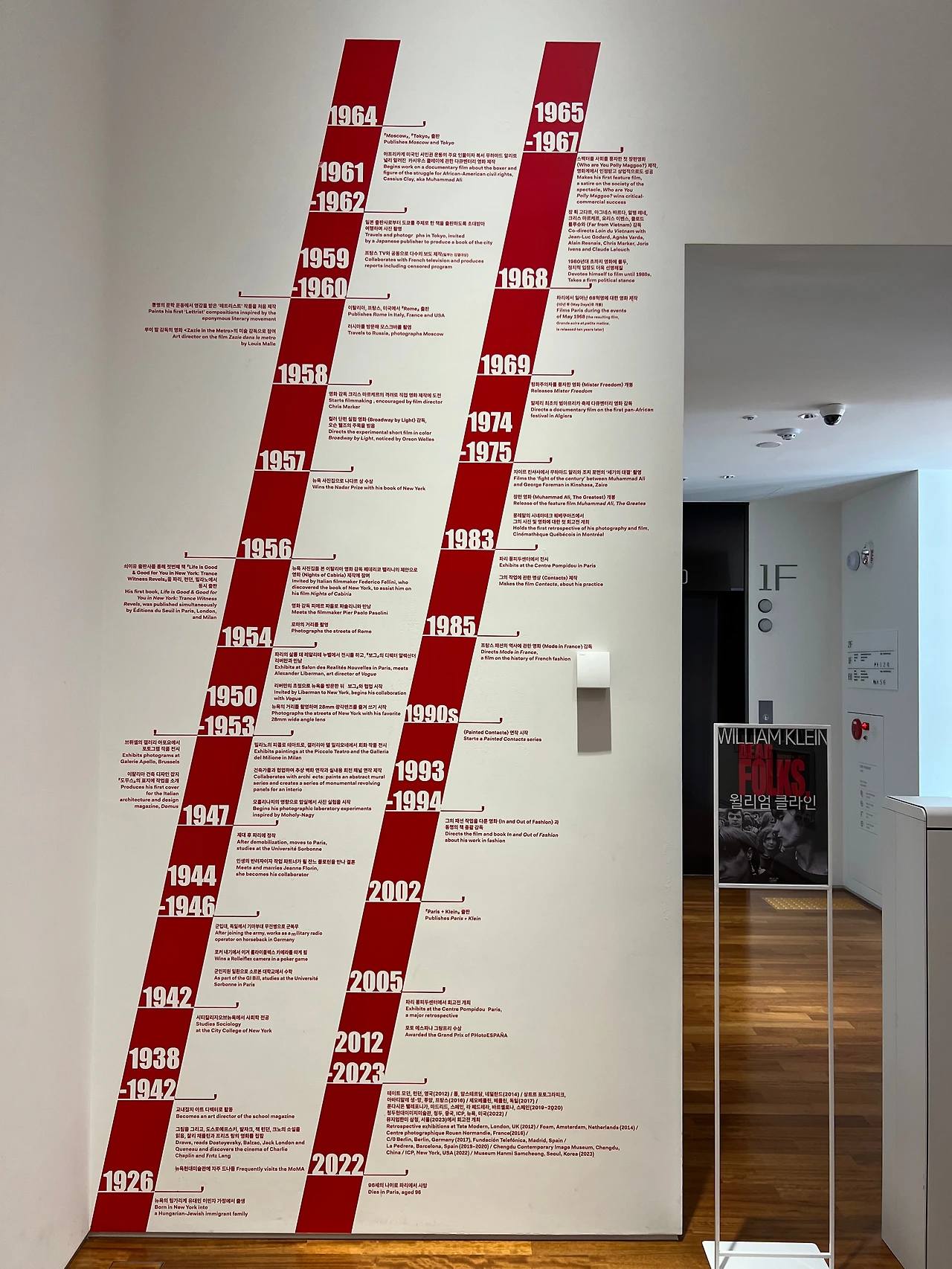개관전에 이어 두 번째로 진행 중인 《윌리엄 클라인 - DEAR FOLKS,》는, 2022년 세상을 떠난 현대사진의 거장 윌리엄 클라인(Willian Klein,1926-2022, 미국)의 회고전입니다. 미국 뉴욕 맨해튼의 유대인 집안에서 태어난 그는, 2차 세계대전에 참전했을 때 유럽의 매력에 빠졌고, 전쟁 후 프랑스로 활동 무대를 옮겨 화가 페르낭 레제르 밑에서 그림을 배우는 등 여러 예술가들과 적극적으로 교류를 하며 감각을 키워갑니다. 건축가의 꿈을 갖고 있었던 그는 어느 날 포커 게임에서 이겨 독일제 롤라이 플렉스 카메라를 손에 넣은 뒤 사진에 매료됐다고 하던데, 일생동안 화가、패션사진작가、그래픽디자이너、책 편집자、다큐멘터리 및 영화제작자 등 다양한 사회적 역할을 수행해 온 만큼, 작업 영역의 스펙트럼이 참 넓어요. 게다가 이 전시는 2015년부터 논의를 시작해 무려 7년간 준비한 해외 기획전으로, 작년 9월 작가가 96세로 파리에서 별세하면서 그의 첫 유고전이라는 타이틀도 갖게 되었죠.