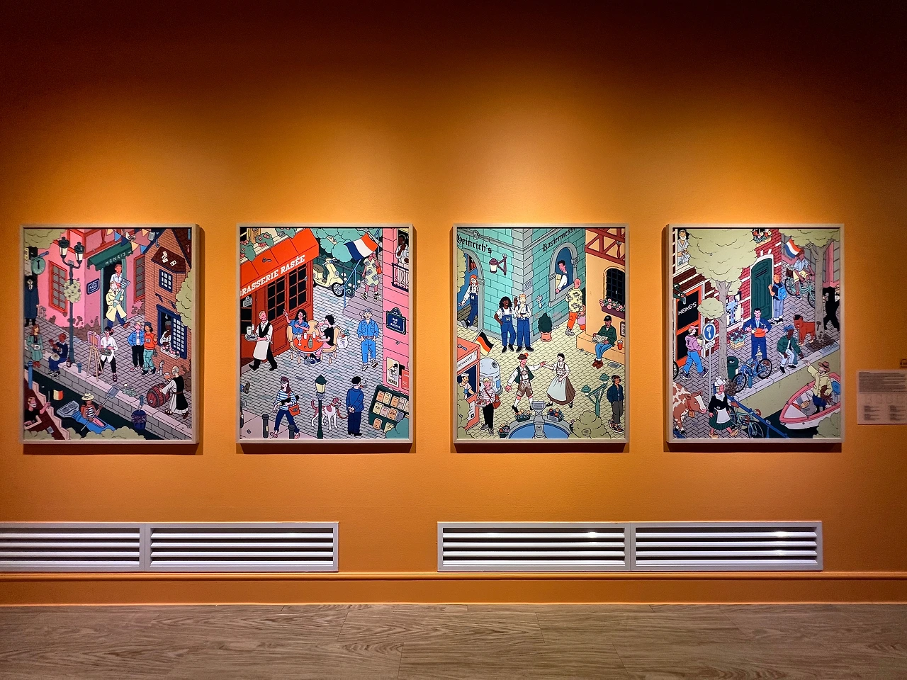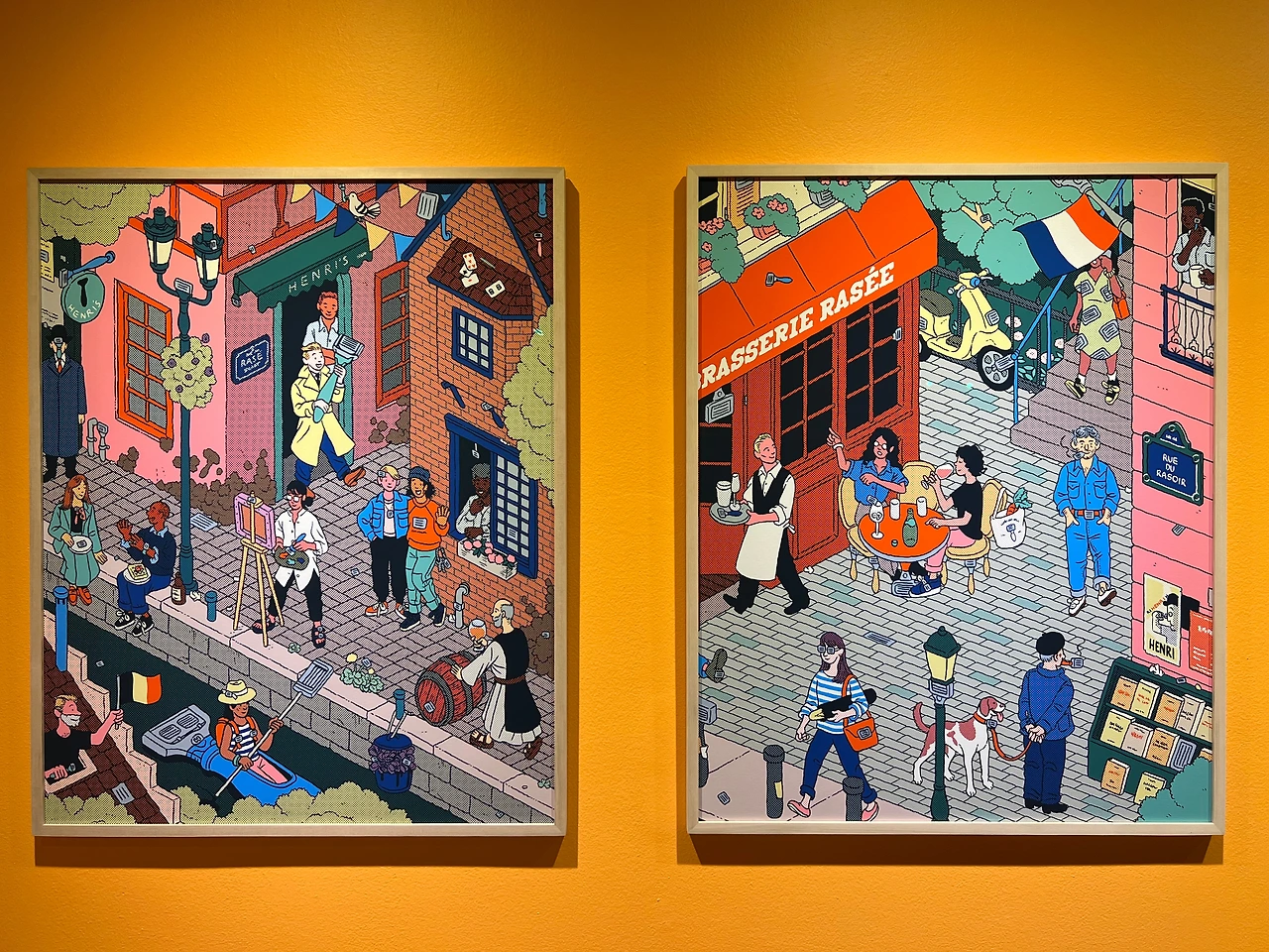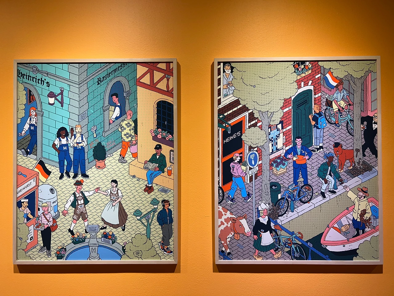 <상상 속> 시리즈 역시 지역 특색이 잘 드러난 작품으로, 이 작품은 뉴욕에 기반을 둔 면도 상품 제조 회사인 '해리스' 커미션 작품이라, 해리스(Harry's)란 이름이 각 나라별 언어로 변형되어 표현되어 있고, 다양한 크기의 면도기와 면도날이 자주 등장한다는 특징을 보이죠. '처음엔 왜 저렇게 면도기가 많이 등장하지?' 싶었어요, 설명을 읽기 전엔. 게다가, <상상 속 벨기에>에서는 만화가 에르제의 대표 캐릭터 땡땡(Tintin)과 르네 마그리트를 연상시키는 인물이, <상상 속 프랑스>에서는 프랑스 싱어송라이터이자 배우인 세르쥬 갱스부르가 면도날을 물로 길을 거닐고 있고, <상상 속 독일>에서는 독일 전통 민속 의상을 입은 커플과 독일의 소시지 요리인 '커리어부어스트'가, <상상 속 네덜란드>에서는 네덜란드의 특산품인 고다 치즈 덩어리를 들고 있는 남성과 전통의상과 국화인 튤립이 등장하는 등 작가 고유의 필치와 지역색이 잘 어우러져 있어, 찾아보는 재미가 넘쳐납니다.