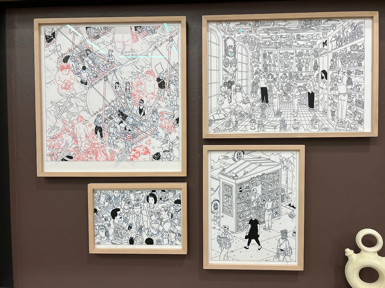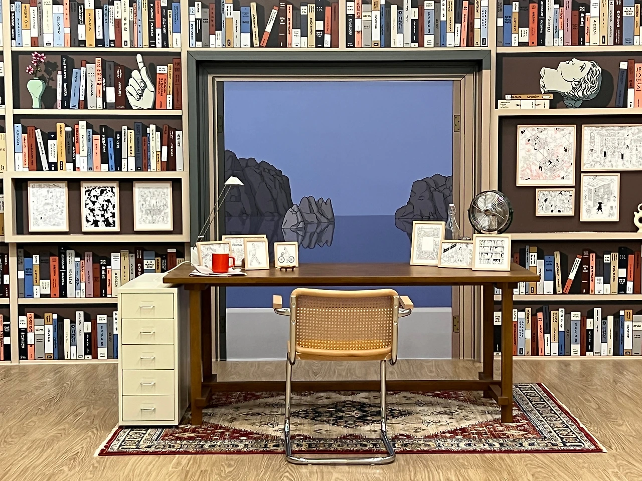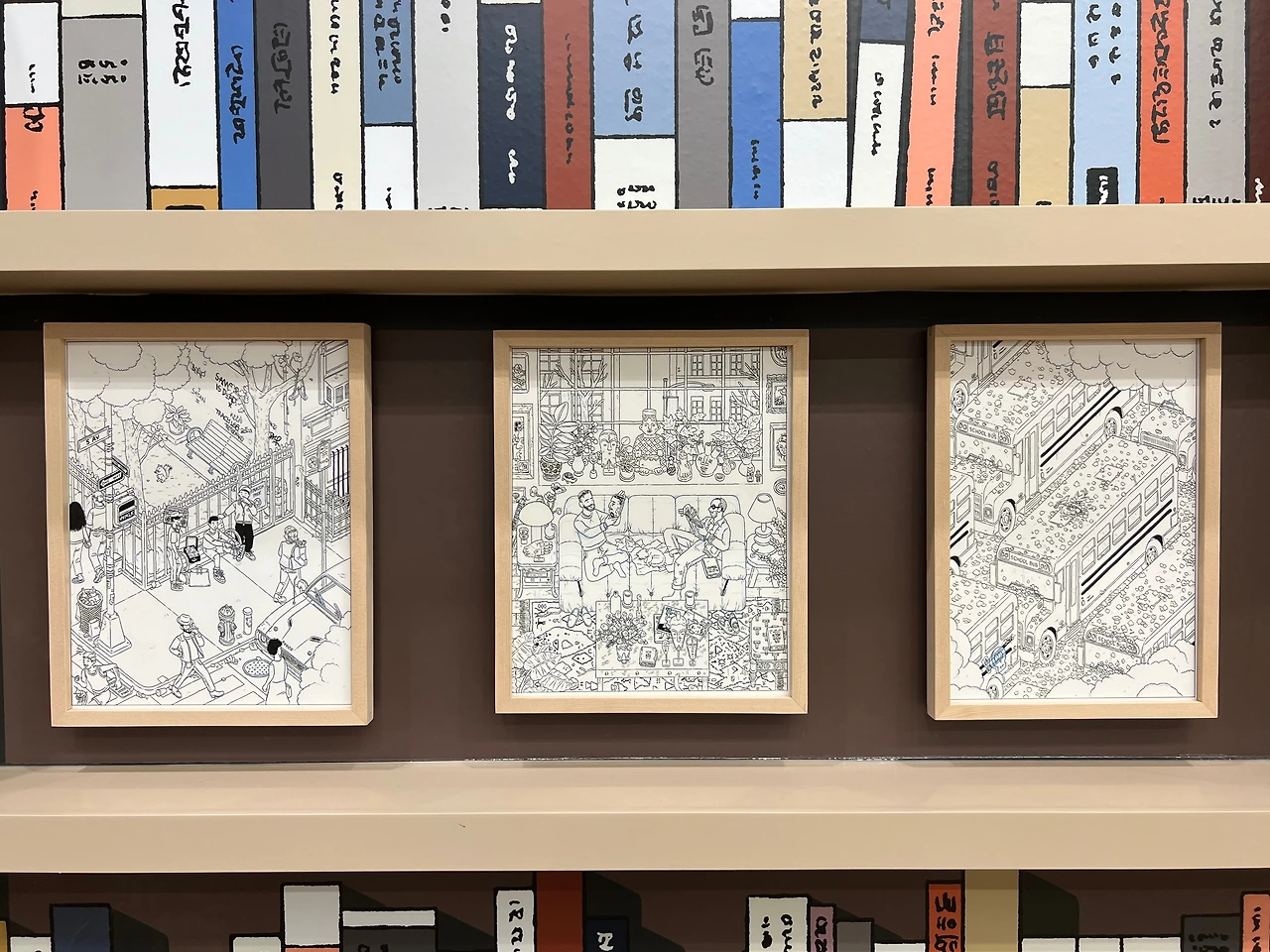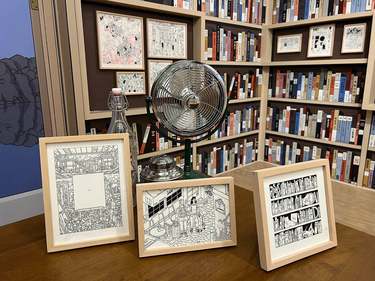 전시장 중간쯤엔 <책거리>라는 특별 공간이 있습니다.책거리(책가도)는 우리나라 궁중회화나 민화에서 볼 수 있는 그림 형식으로, 책과 서가, 그 안에 놓인 꽃, 기물 등을 소재로 합니다. 소장가의 컬렉션과 수집 취향도 엿볼 수 있는 그림이죠. <책거리>와 자신의 대표작인 <티레니아해 옆 서재>를 접목해 기획된 이 특별 섹션에선 이전에 공개되지 않은 그의 원화 드로잉을 전시하고 있어요. 전시 출품작의 원화드로잉도 있고 아닌 것도 섞인듯한데, 보다 보면 디테일에 감탄할 수밖에 없더라고요. 작가는 일반적으로 머릿속에서 이미지를 그리는 것에서 시작해 머릿속에 있는 이미지를 종이 위에 펼쳐내는 방식으로 작업을 진행한다고 합니다. 채색이 된 상태로 봤을 때도 작업량이 꽤 많았겠단 생각이 들었는데, 원화를 보고 나니 작업량은 물론 꽤 많은 사색의 시간을 필요로 했겠다 싶더라고요. 예전 포스팅에서 소개한 일러스트레이터 티보 에렘과는 또 다른 결로, 디테일과 가독성이 뛰어나죠.