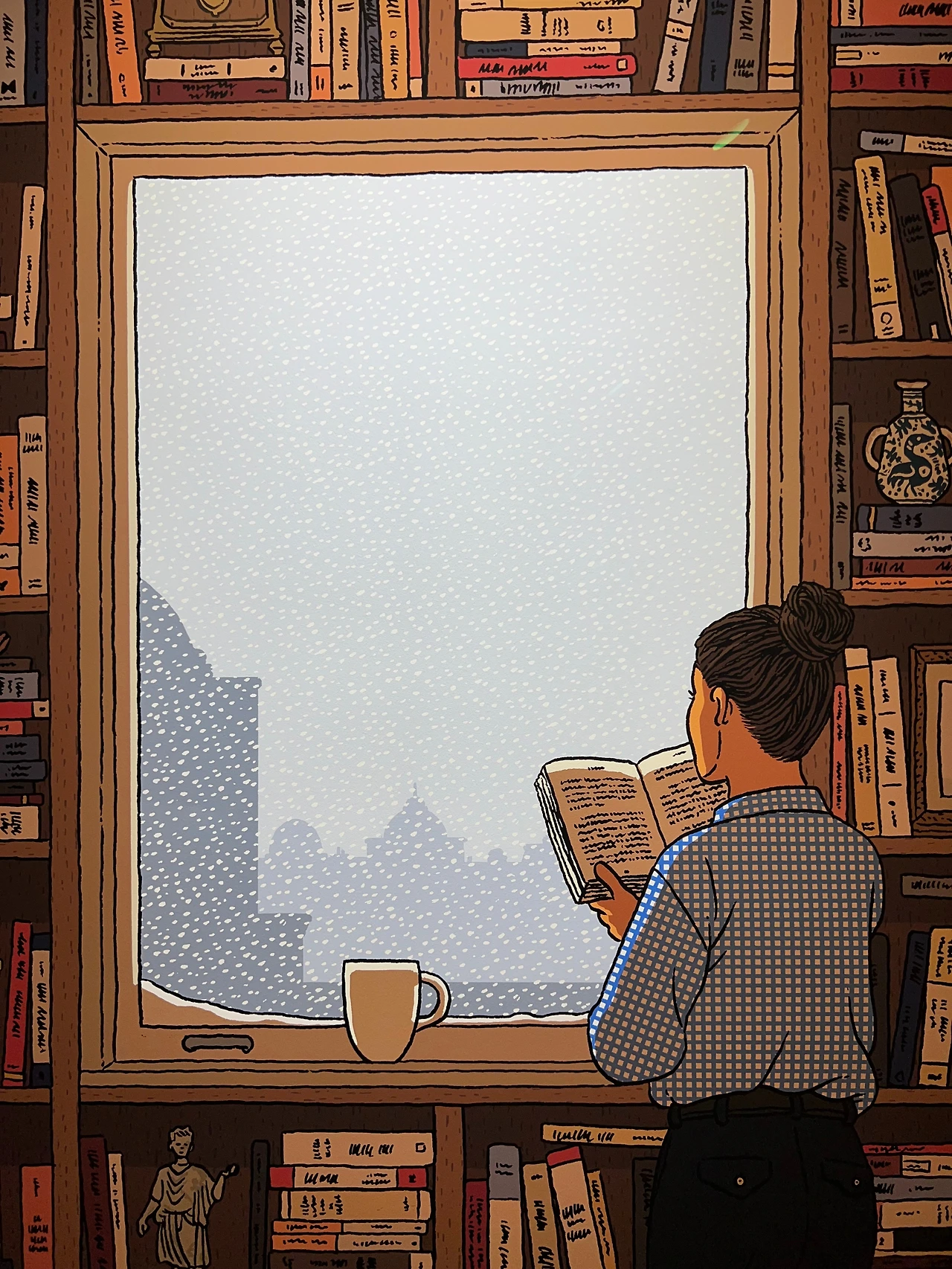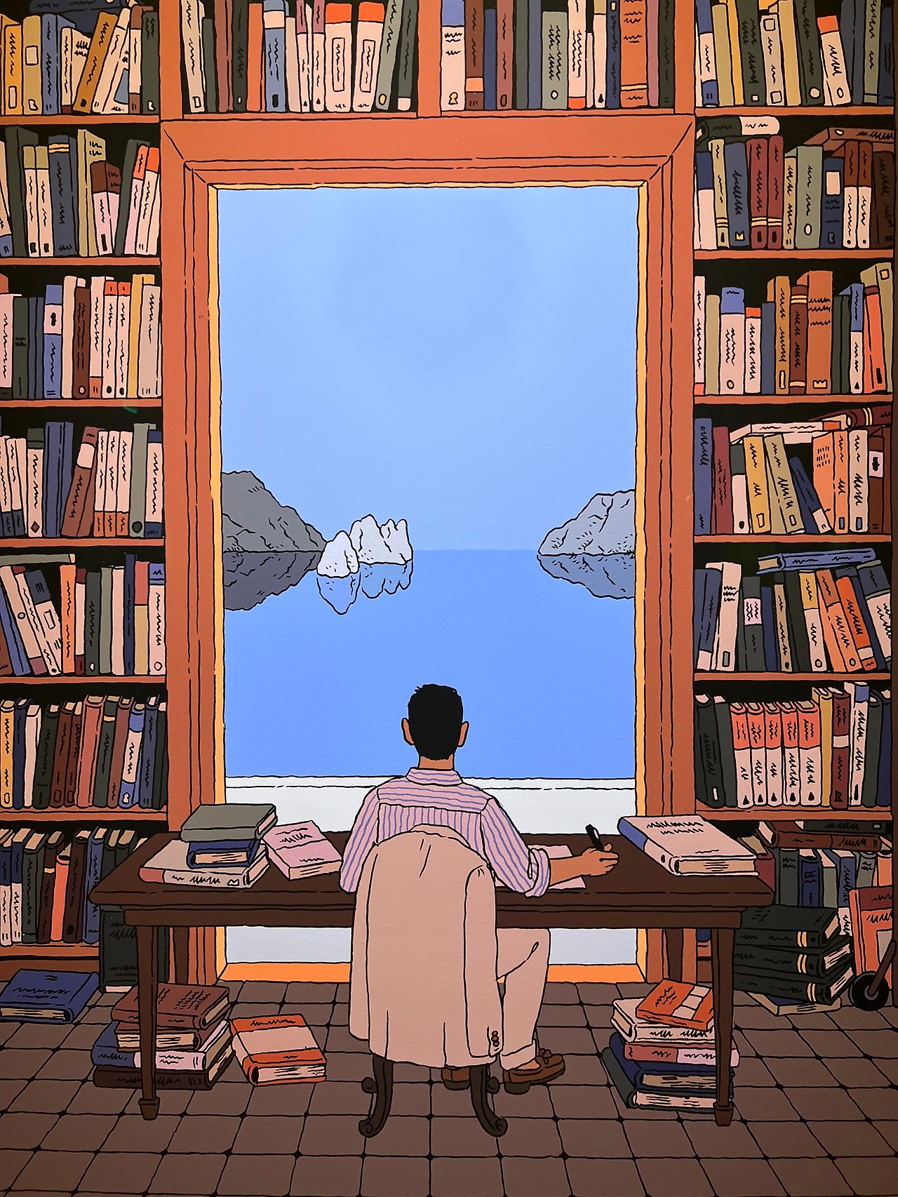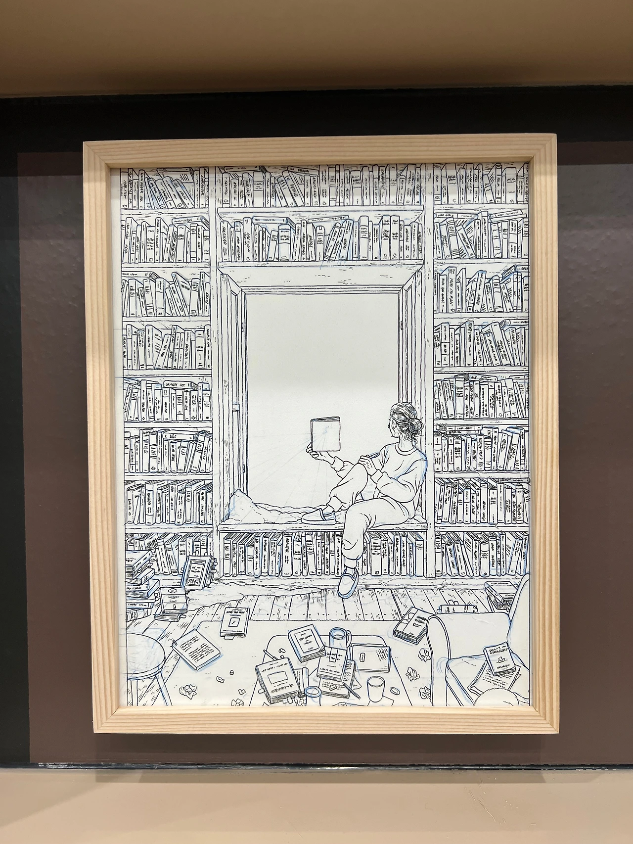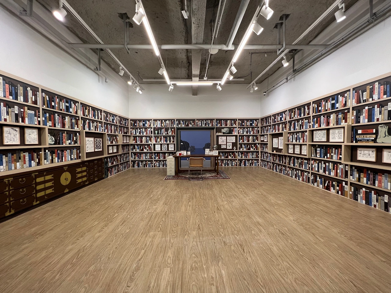 전시장 중간쯤엔 <책거리>라는 특별 공간이 있습니다.책거리(책가도)는 우리나라 궁중회화나 민화에서 볼 수 있는 그림 형식으로, 책과 서가, 그 안에 놓인 꽃, 기물 등을 소재로 합니다. 소장가의 컬렉션과 수집 취향도 엿볼 수 있는 그림이죠. <책거리>와 자신의 대표작인 <티레니아해 옆 서재>를 접목해 기획된 이 특별 섹션에선 이전에 공개되지 않은 그의 원화 드로잉을 전시하고 있어요. 전시 출품작의 원화드로잉도 있고 아닌 것도 섞인듯한데, 보다 보면 디테일에 감탄할 수밖에 없더라고요. 작가는 일반적으로 머릿속에서 이미지를 그리는 것에서 시작해 머릿속에 있는 이미지를 종이 위에 펼쳐내는 방식으로 작업을 진행한다고 합니다. 채색이 된 상태로 봤을 때도 작업량이 꽤 많았겠단 생각이 들었는데, 원화를 보고 나니 작업량은 물론 꽤 많은 사색의 시간을 필요로 했겠다 싶더라고요. 예전 포스팅에서 소개한 일러스트레이터 티보 에렘과는 또 다른 결로, 디테일과 가독성이 뛰어나죠.
