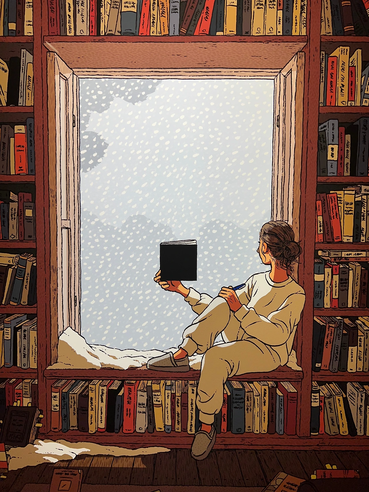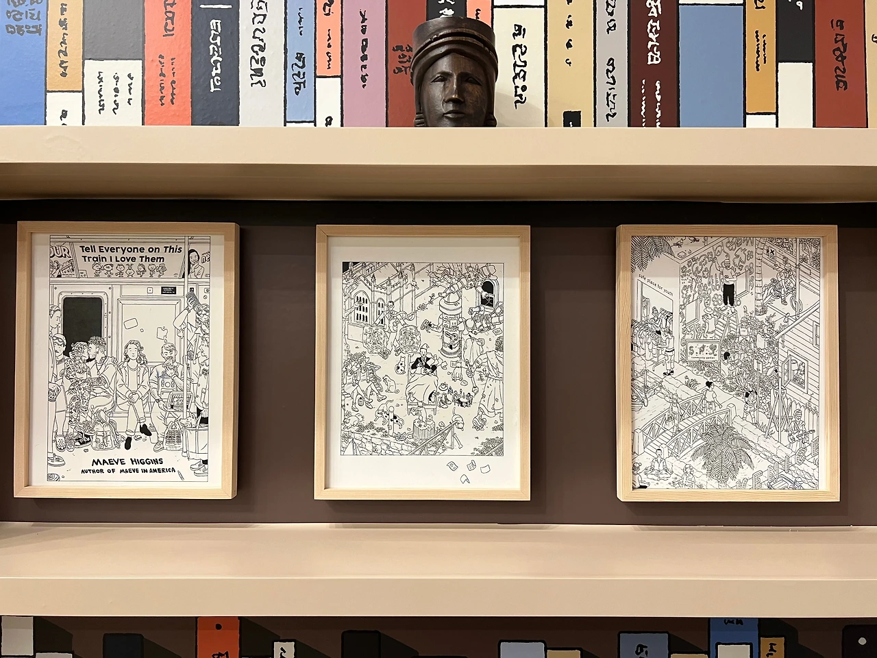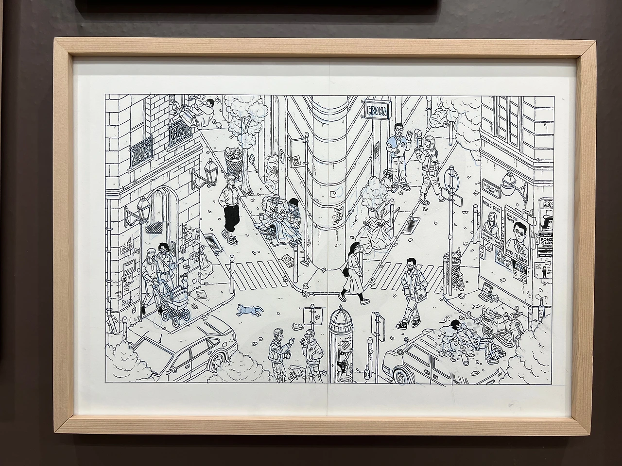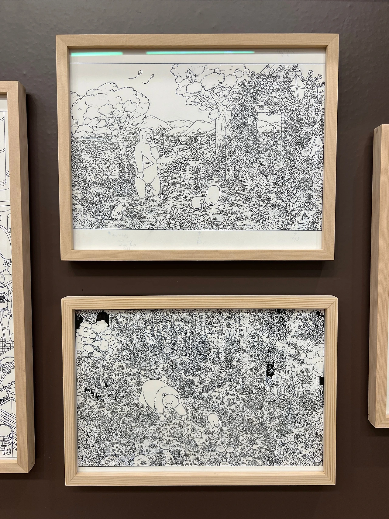 전시장 중간쯤엔 <책거리>라는 특별 공간이 있습니다.책거리(책가도)는 우리나라 궁중회화나 민화에서 볼 수 있는 그림 형식으로, 책과 서가, 그 안에 놓인 꽃, 기물 등을 소재로 합니다. 소장가의 컬렉션과 수집 취향도 엿볼 수 있는 그림이죠. <책거리>와 자신의 대표작인 <티레니아해 옆 서재>를 접목해 기획된 이 특별 섹션에선 이전에 공개되지 않은 그의 원화 드로잉을 전시하고 있어요. 전시 출품작의 원화드로잉도 있고 아닌 것도 섞인듯한데, 보다 보면 디테일에 감탄할 수밖에 없더라고요. 작가는 일반적으로 머릿속에서 이미지를 그리는 것에서 시작해 머릿속에 있는 이미지를 종이 위에 펼쳐내는 방식으로 작업을 진행한다고 합니다. 채색이 된 상태로 봤을 때도 작업량이 꽤 많았겠단 생각이 들었는데, 원화를 보고 나니 작업량은 물론 꽤 많은 사색의 시간을 필요로 했겠다 싶더라고요. 예전 포스팅에서 소개한 일러스트레이터 티보 에렘과는 또 다른 결로, 디테일과 가독성이 뛰어나죠.