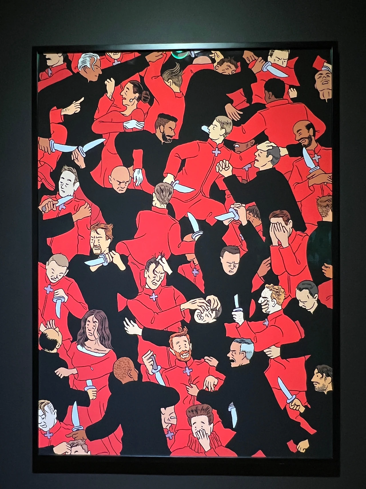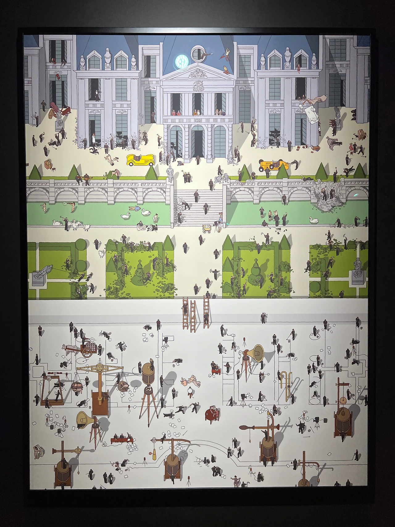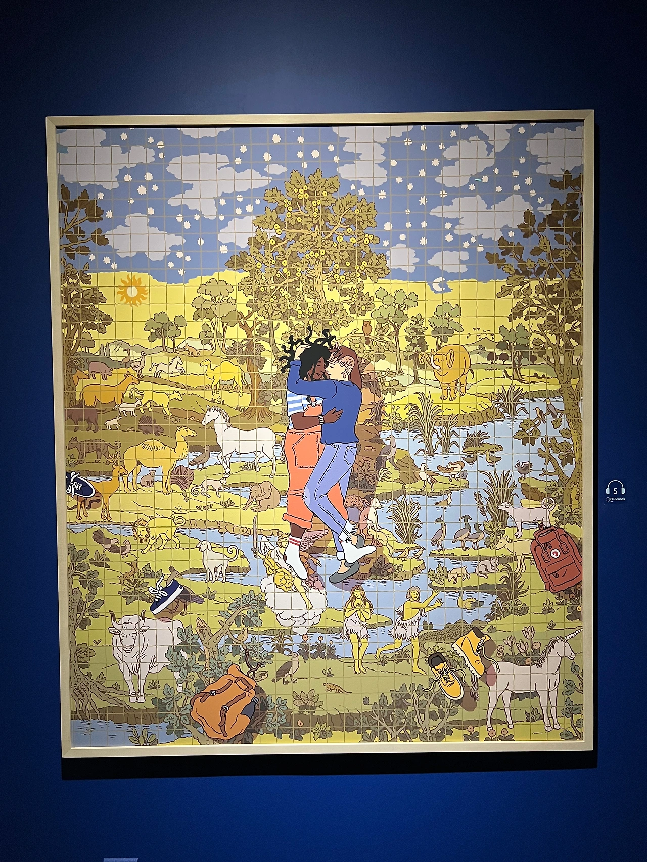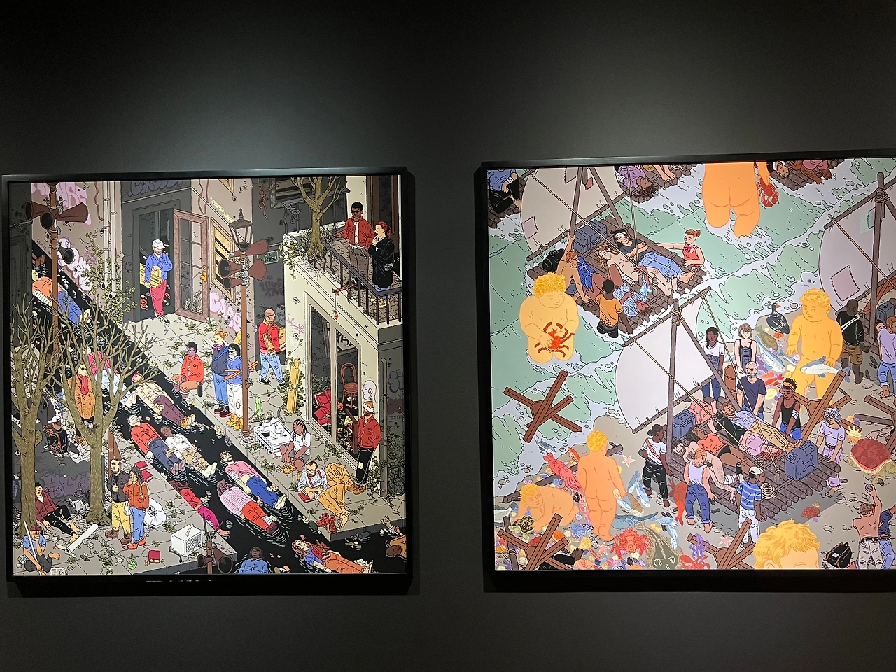 해설에 의하면 그는 미드센추리 프랑코-벨기에 만화스타일, 르네상스시대 네덜란드 세밀화, 일본의 목판화 등 다양한 사조와 예술가들로부터 영감을 받았다고 해요. 히에로니무스 보스(Hieronymus Bosch)의 <쾌락의 정원>이나 피터 브뤼겔(Pieter Bruegel)이 언급되기도 하던데 그 외에도 이집트와 아즈텍 상형문자 등의 요소에서도 영감을 받았고, 그의 그림 속에 현대미술 작가들이 등장하기도 하니, 그들로부터 받은 영향도 충분히 짐작할 수 있죠. 전시장에 있는 인터뷰 영상을 보면, 현재 그림을 그리는 방식이 10대 때 그렸던 방식과 아주 비슷하고, 의식의 결정이라기보다는 몸의 밴 습관으로 배어 나오는 글씨체와 같다는 내용이 나오는데, 그렇게 그의 화풍은 자연스럽게 다양한 영향을 받으면서 자기화되어 현재에 이르게 된 거겠죠. 각자가 지닌 고유한 글씨체처럼요.