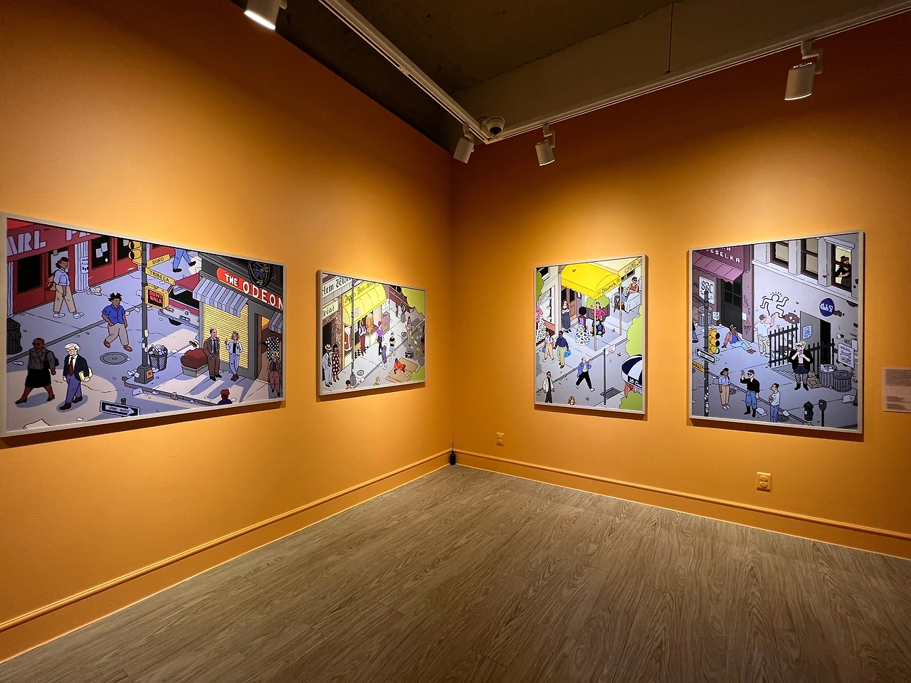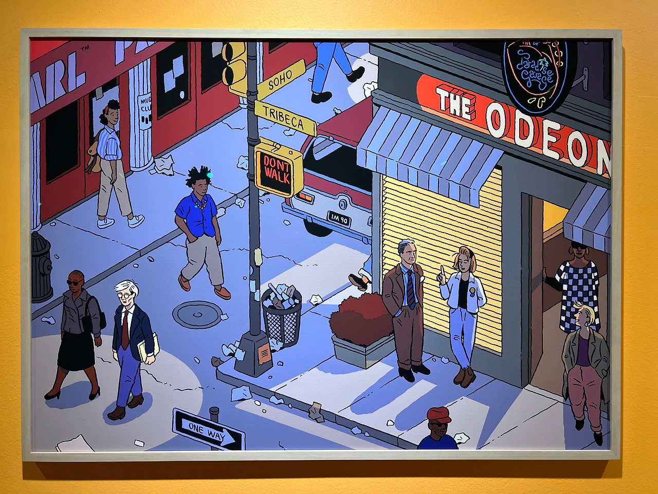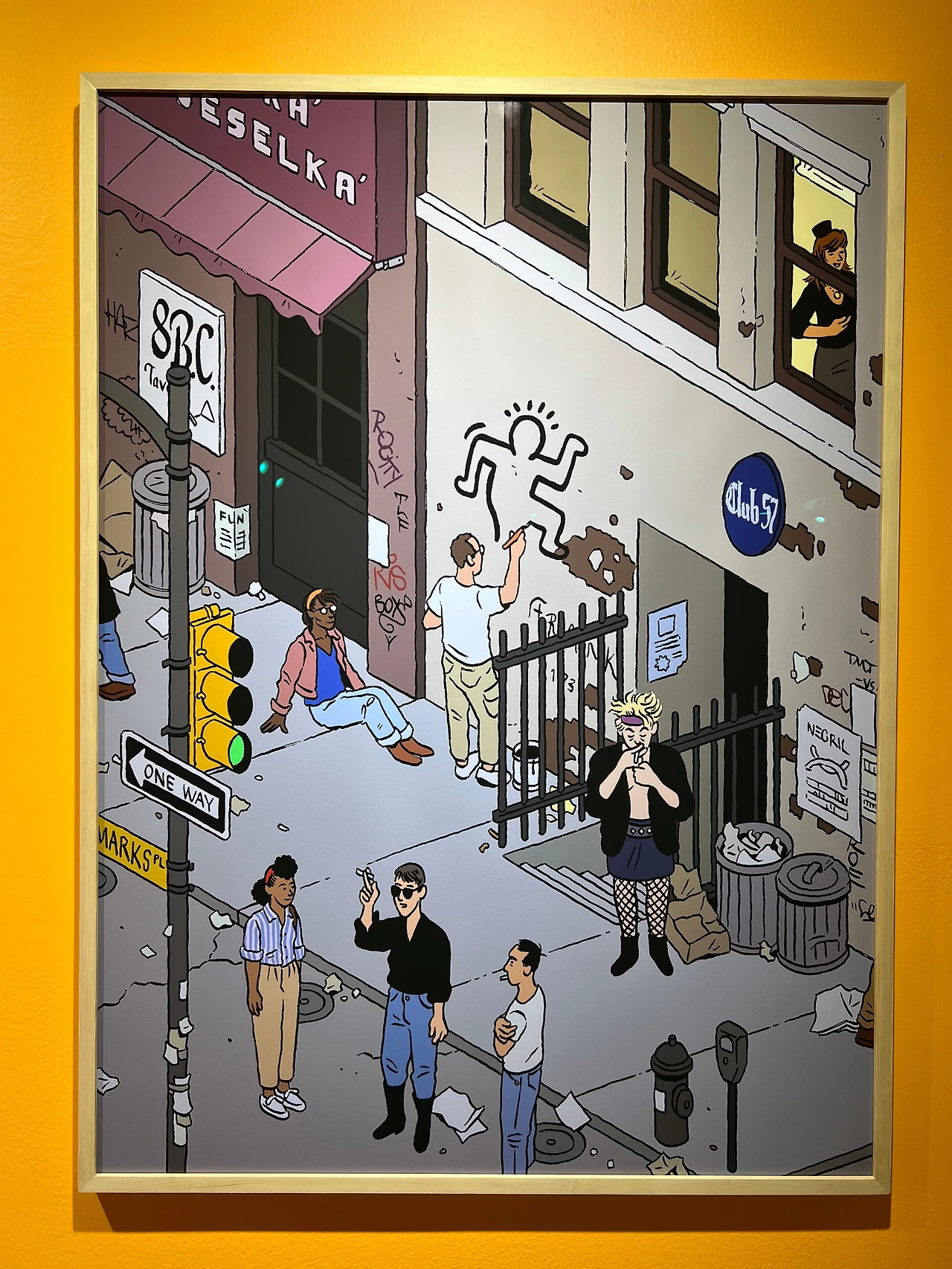 <1983년 여름 뉴욕> 시리즈의 배경은, 소호의 저녁, 할렘의 늦은 아침, 어퍼 이스트 사이드의 오후, 이스트 빌리지의 늦은 밤으로, 작품에 등장하는 음식점과 상점들은 실제 존재했던 장소라고 해요. 그림 속엔 앤디 워홀과 장 미셀 바스키아 같은 유명 인사도 등장하고 키스 해링 등 당대의 젊은 아티스트들이 장르 구분 없이 어우러졌던 '클럽 57'처럼 명소들도 사실적으로 재현되어 있습니다.