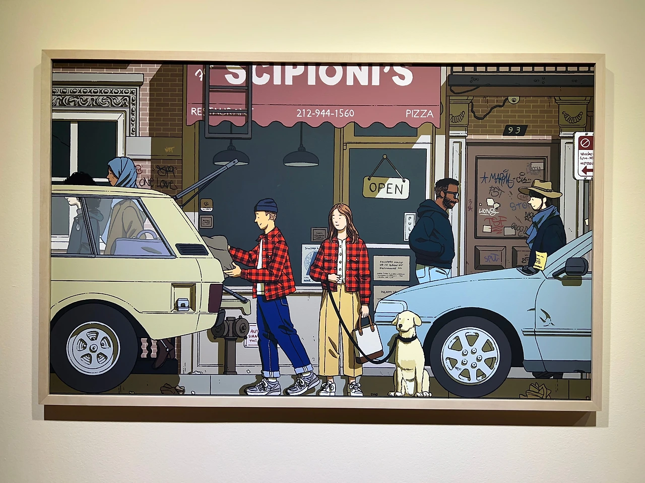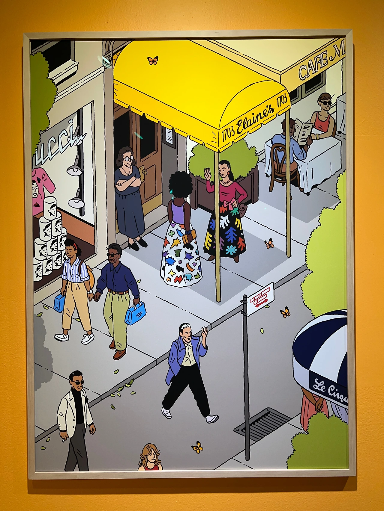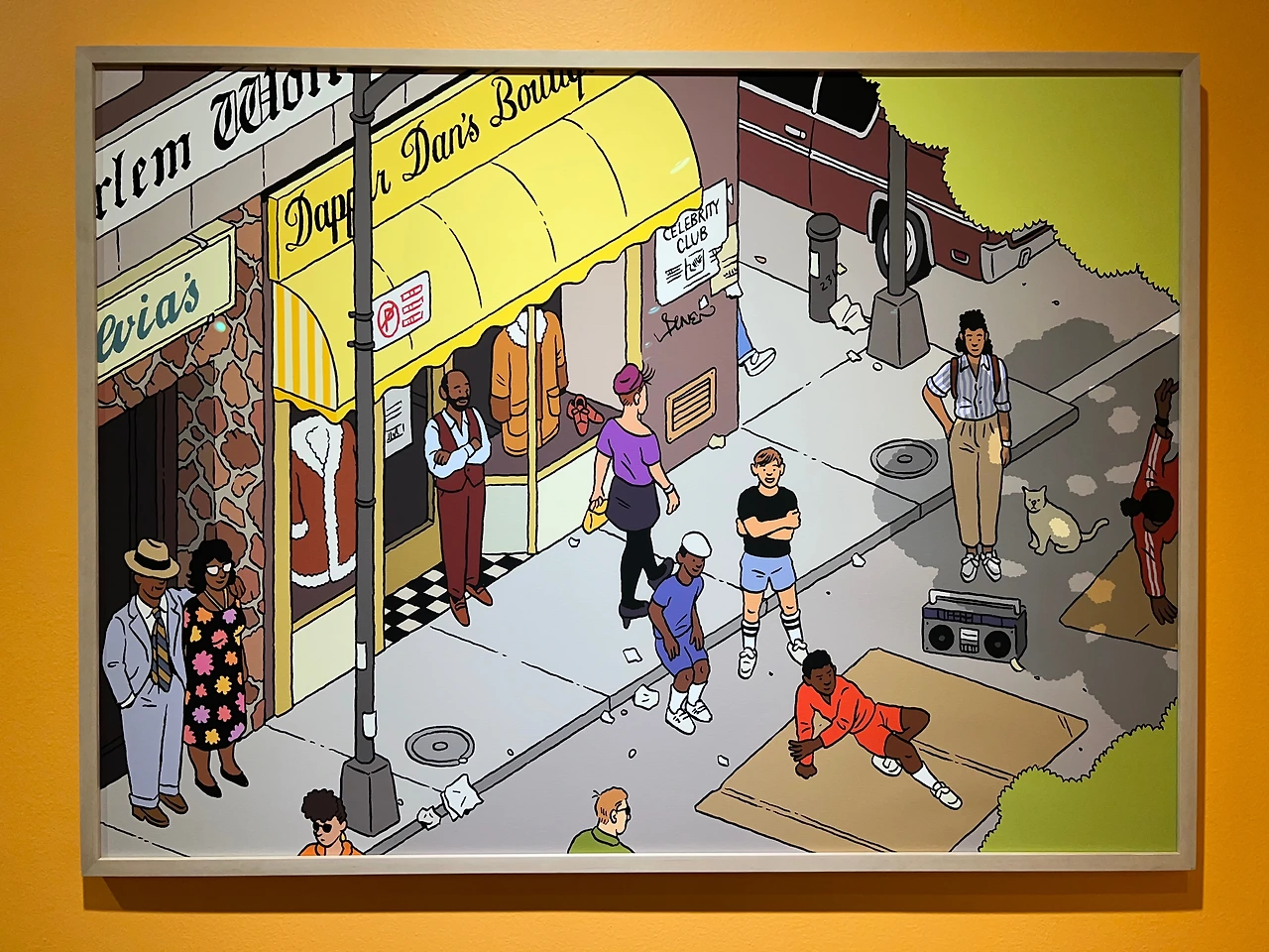 <1983년 여름 뉴욕> 시리즈의 배경은, 소호의 저녁, 할렘의 늦은 아침, 어퍼 이스트 사이드의 오후, 이스트 빌리지의 늦은 밤으로, 작품에 등장하는 음식점과 상점들은 실제 존재했던 장소라고 해요. 그림 속엔 앤디 워홀과 장 미셀 바스키아 같은 유명 인사도 등장하고 키스 해링 등 당대의 젊은 아티스트들이 장르 구분 없이 어우러졌던 '클럽 57'처럼 명소들도 사실적으로 재현되어 있습니다.