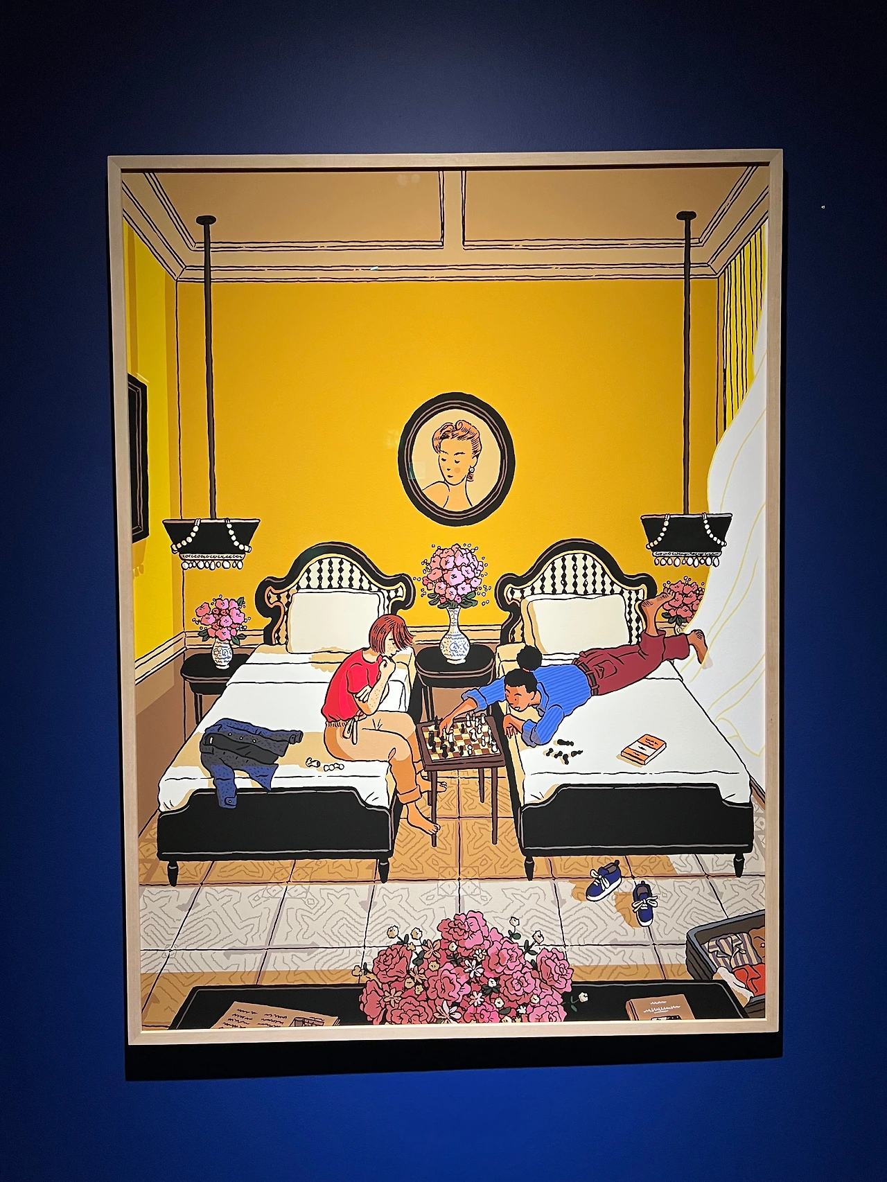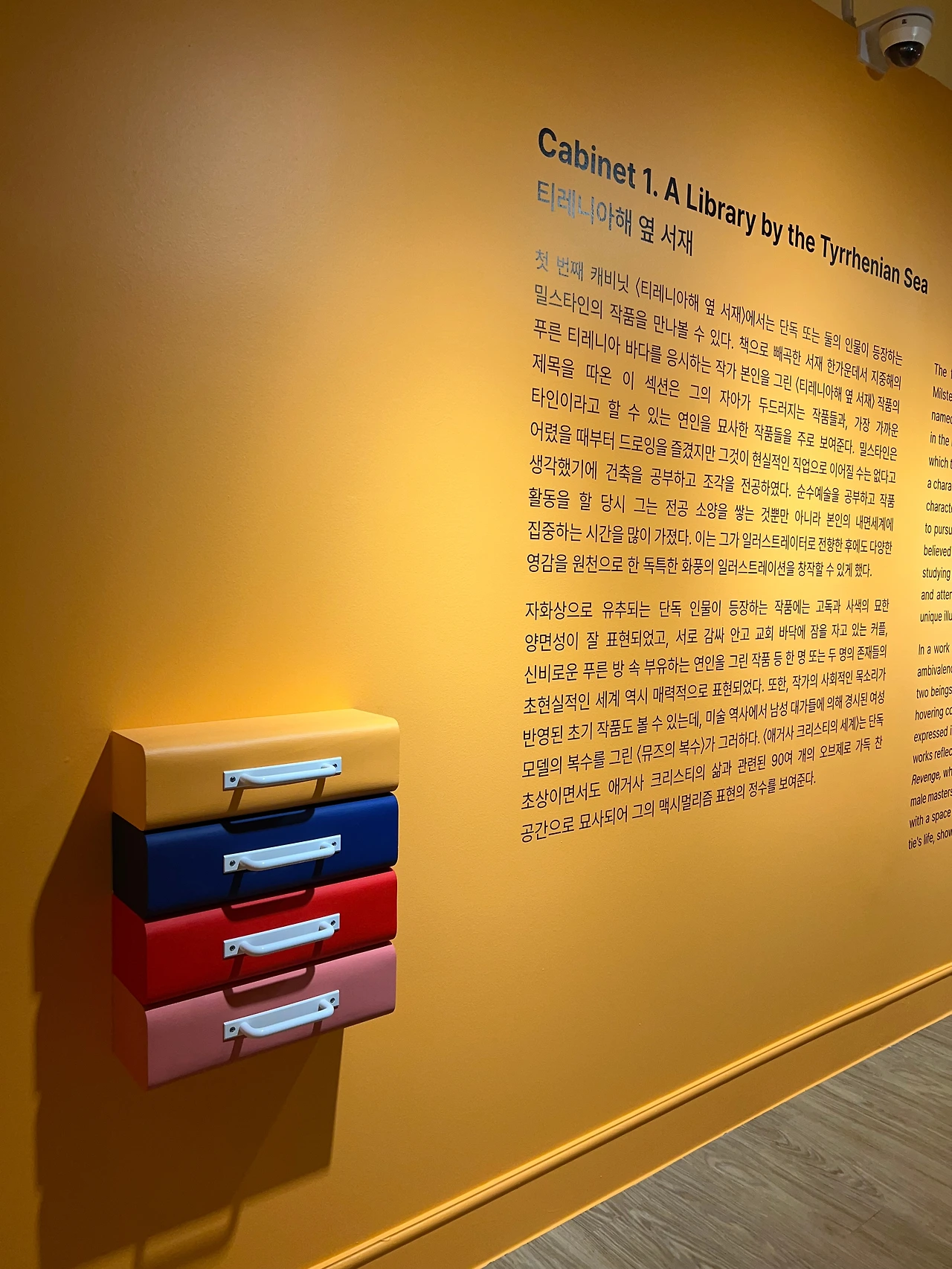 《일리야 밀스타인 : 기억의 캐비닛(Ilya Milstein : Memory Cabinet》전은 Cabinet1 <티레니아해 옆 서재>, Cabinet2 <리비에라에서의 추억들>, Cabinet3 <1983년 여름, 소호의 저녁>, Cabinet4 < 캐비닛 속 분실된 초상화>로 4부 구성으로, 중간에 작가의 아이디어를 바탕으로 기획된 <책거리>란 특별 섹션이 있습니다. 작품만 있는 건 아니고 중간에 포토존처럼 오브제를 만들어둬서 공간을 너무 평면적이지 않게 꾸몄더라고요. 각 부 설명 옆에는 캐비닛 서랍에서 모티브를 얻은 듯 보이는 오브제를 부착해 뒀고요. 작품마다 봐야 할 디테일이 많긴 하지만, 오리지널 드로잉을 제외하고는 지클레(Giclée) 판화로 인쇄된 작품들이라 사이즈가 작지 않아 편안하게 볼 수 있고 시리즈 작품들도 여럿이라 연결해서 보는 재미도 있습니다. 다~ 대표작으로 봐도 무방하나 모두 소개드리긴 어려우니 제가 좋아하는 작품 위주로 소개할게요.